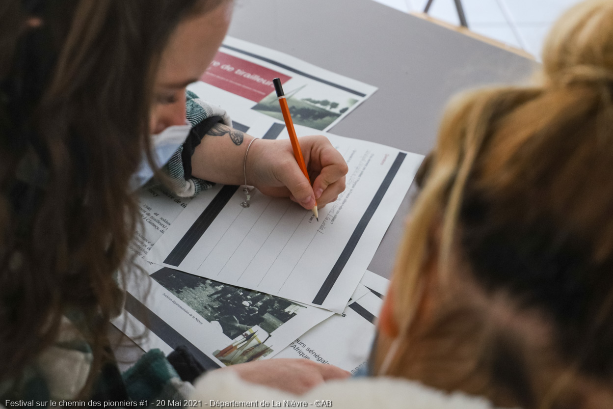 Dans le cadre du festival sur le chemin des pionniers, le Musée de la Résistance en Morvan a organisé des ateliers et exercices en petit groupe avec des jeunes collégiens du Département, le jeudi 20 mai 2021, autour de différents documents illustrant le sacrifice, l’engagement, le colonialisme et le racisme.