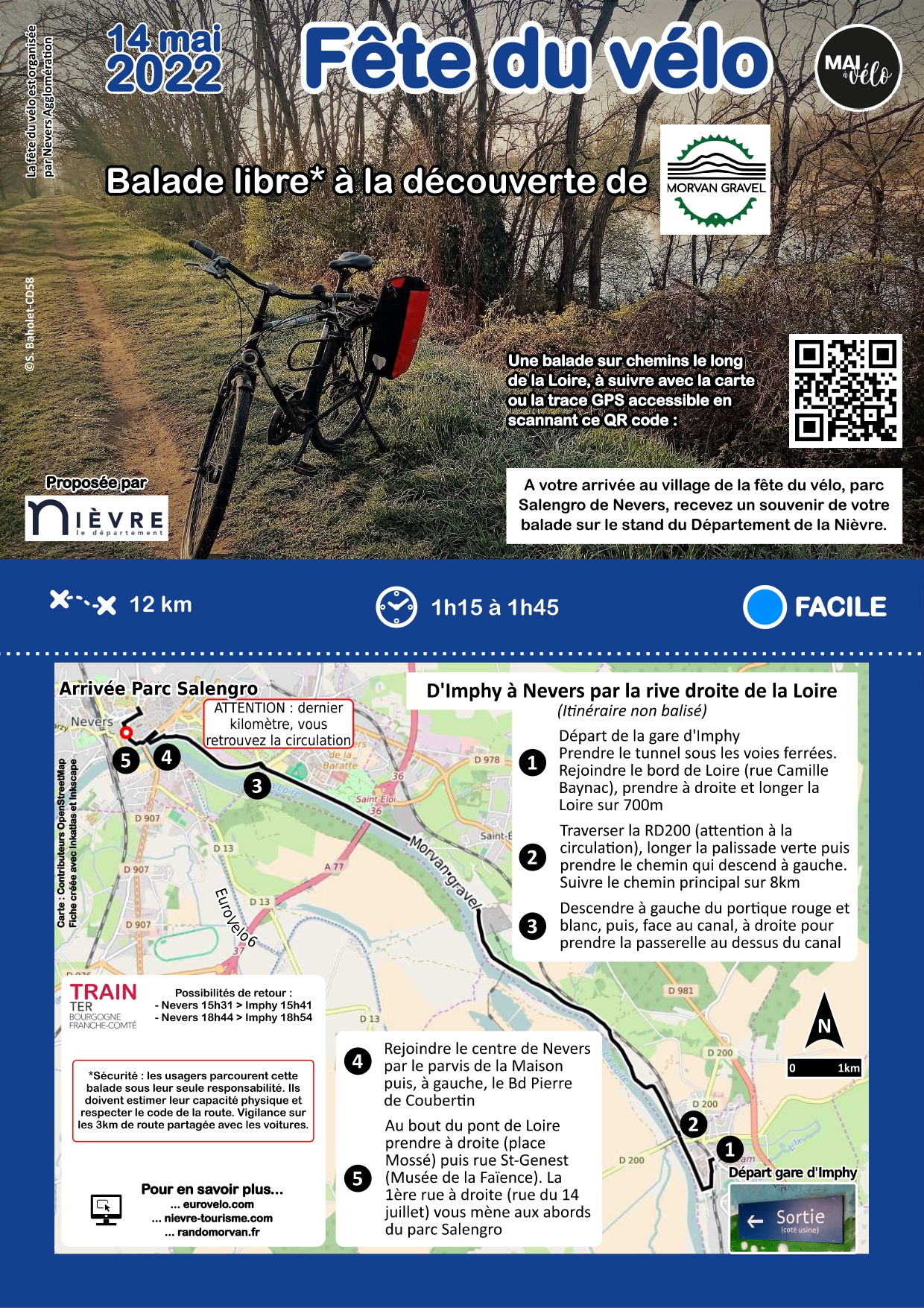 A l’occasion de cette fête organisée par Nevers Agglomération, nous vous proposons de (re)découvrir des voies bucoliques aux alentours de Nevers. Vous pourrez profiter d’une balade libre d’Imphy à Nevers sur l’EuroVelo 6 et/ou Morvan gravel pour rejoindre la fête du vélo.