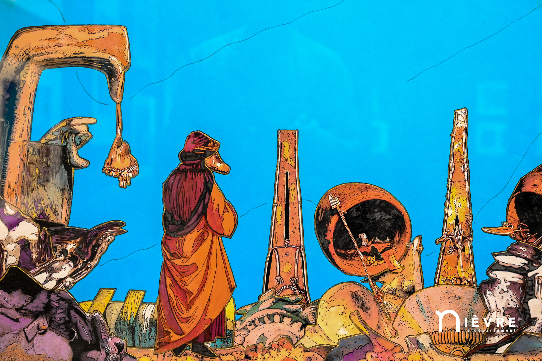 Dans des décors de fin des mondes – l’Antiquité, le Far West, un futur post-apocalyptique évoquant La Planète des singes –, ses personnages immuablement vêtus de longs drapés ont des visages indéchiffrables d’animaux, d’iguanes, de reptiles. Inutile de chercher du secours dans les titres, absurdes, loufoques ou poétiques – L’Attaque de la diligence n’est plus ce qu’elle était, La Marquise Maintenon exige d’Amenophis IV la révocation de l’édit de Nantes, etc.