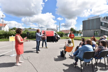 Arrivée tonitruante de la camionnette d’alimentation générale culturelle sur le parking de l’Épicerie solidaire gérée par l’ASEM, rue de la Fosse-aux-Loups à Nevers. C’est en klaxonnant que le camion signale sa venue, à l’image des commerces ambulants qui sillonnaient nos campagnes, mais ici rien à vendre et rien à consommer.