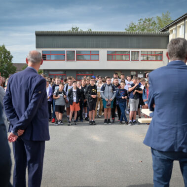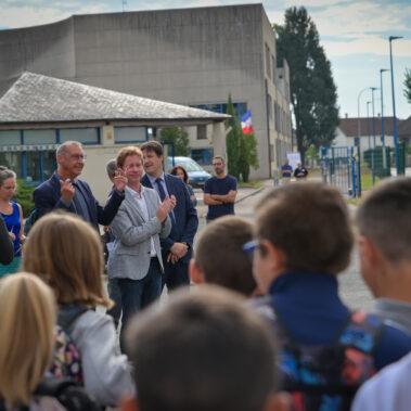 Après deux heures d’immersion et un repas partagé, les officiels mettent le cap au nord-ouest jusqu’à Pouilly-sur-Loire et au collège Les Guilleraults (3). Le principal Florent Chêne brosse le portrait de l’établissement ouvert en 1989, que fréquenteront 158 élèves cette année : « 100 % de nos élèves sortent avec une solution d’orientation qu’ils ont choisie », insiste le chef d’établissement. Loin des stridences d’antan, c’est un carillon délicat et bucolique qui annonce la fin de chaque heure de classe. Réunis dans la cour, les 6es et 3es entrés en éclaireurs (le reste des troupes arrive le vendredi) écoute sagement les discours teintés d’humour et de pédagogie. Fabien Bazin poursuit sur le mode épicurien du matin, comme pour adoucir la fin des vacances : « On est passés par les années collège et on a adoré ça. »