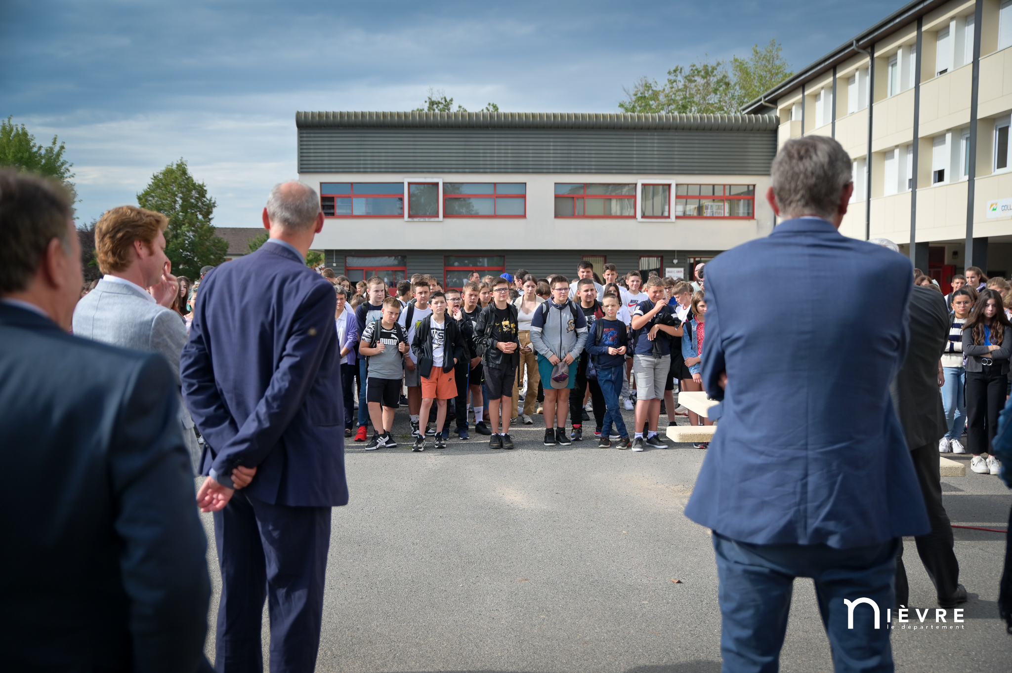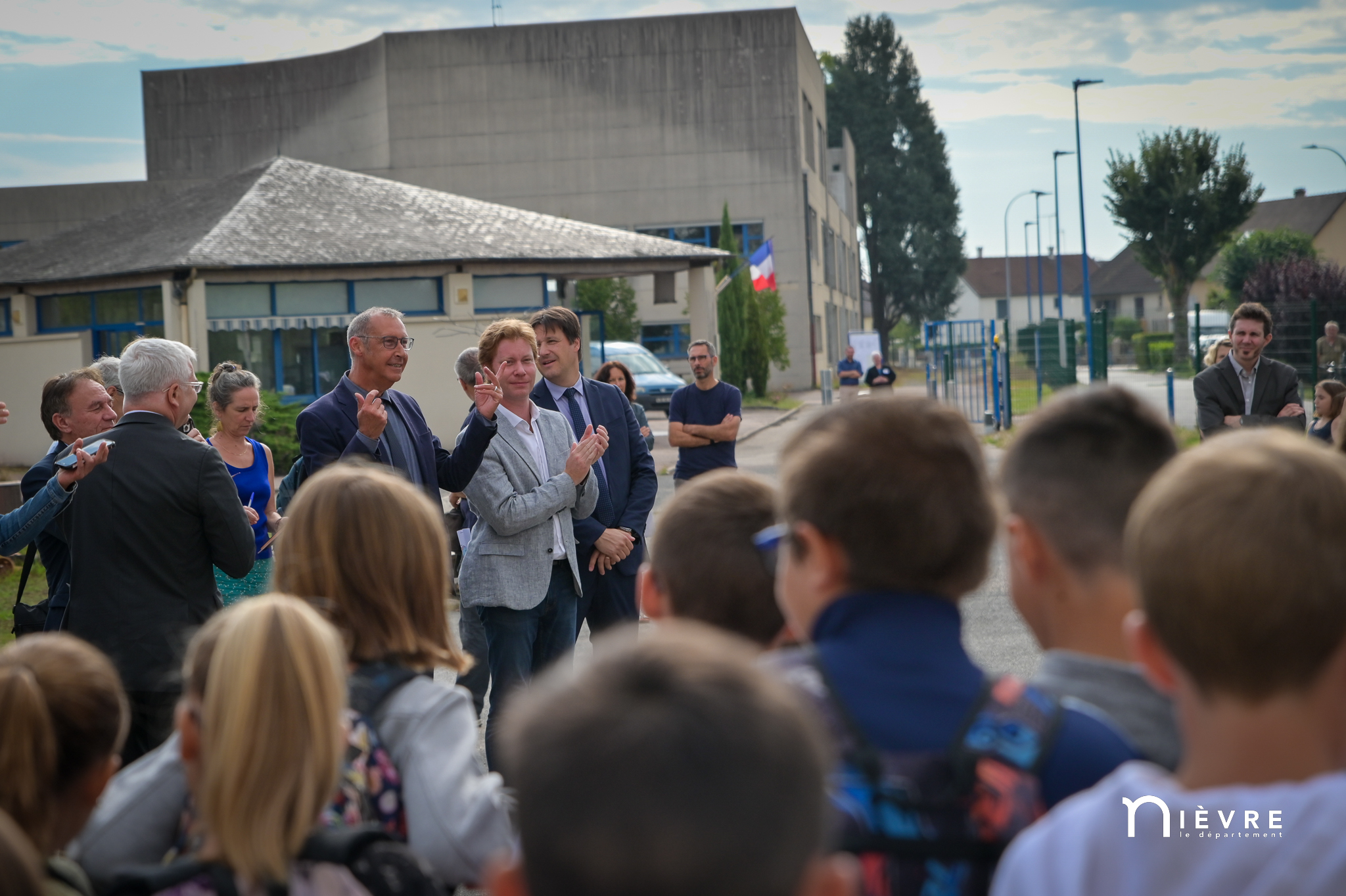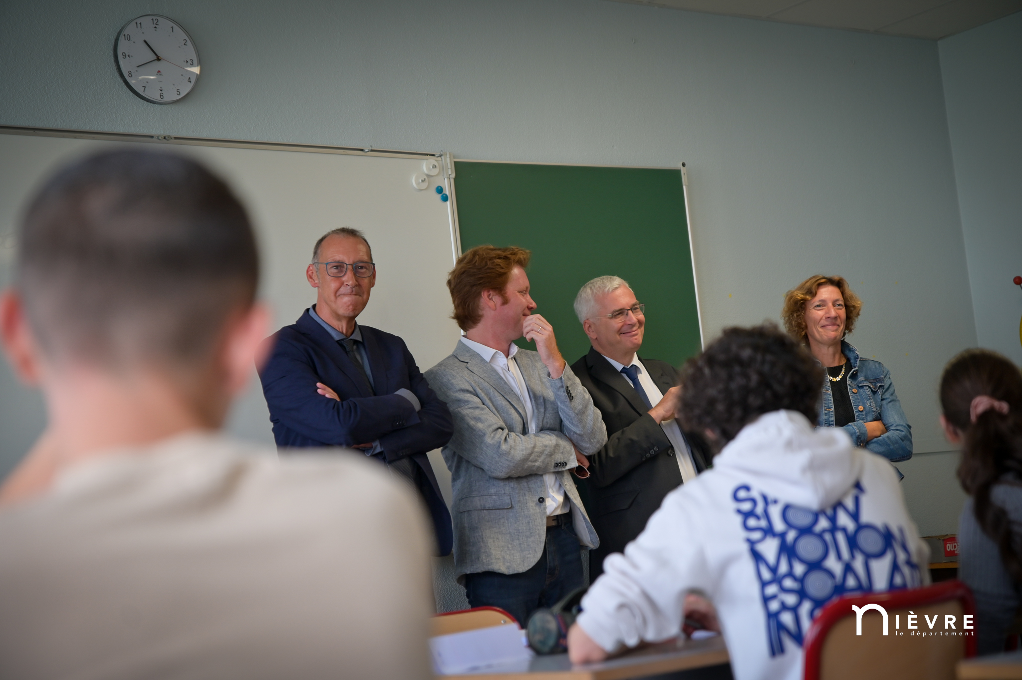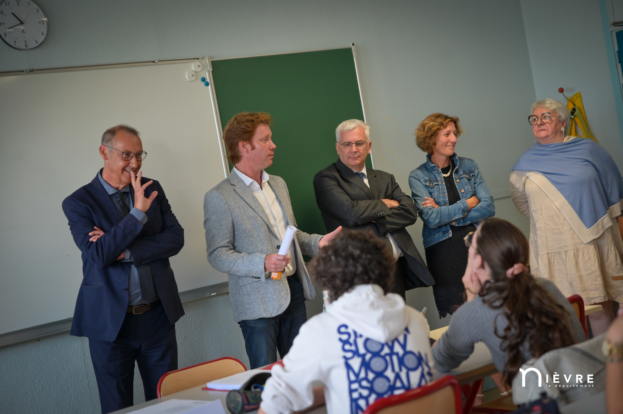 1. A Decize : Fabien Bazin, président du Conseil départemental ; Wilfrid Séjeau, vice-président en charge des collèges et de l’éducation, de la culture, de la jeunesse et de l’enseignement supérieur ; Daniel Barnier, préfet ; Patrice Joly, sénateur ; Patrice Perrot, député ; Pascale Niquet-Petitpas, directrice académique ; François Karinthi, directeur général des services du Département ; Stéphanie Robinet, directrice générale adjointe de l’Aménagement et du Développement des territoires ; Cyril Godot, directeur général adjoint de l’Administration et des Ressources ; Farid Hadjab, directeur de l’Education, de la Jeunesse et de l’Enseignement supérieur ; Stéphane Bénédit, directeur de cabinet.