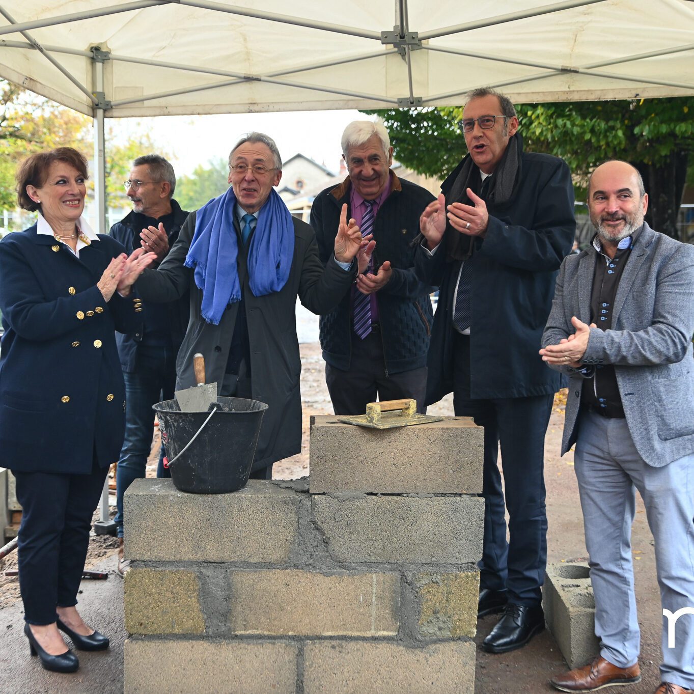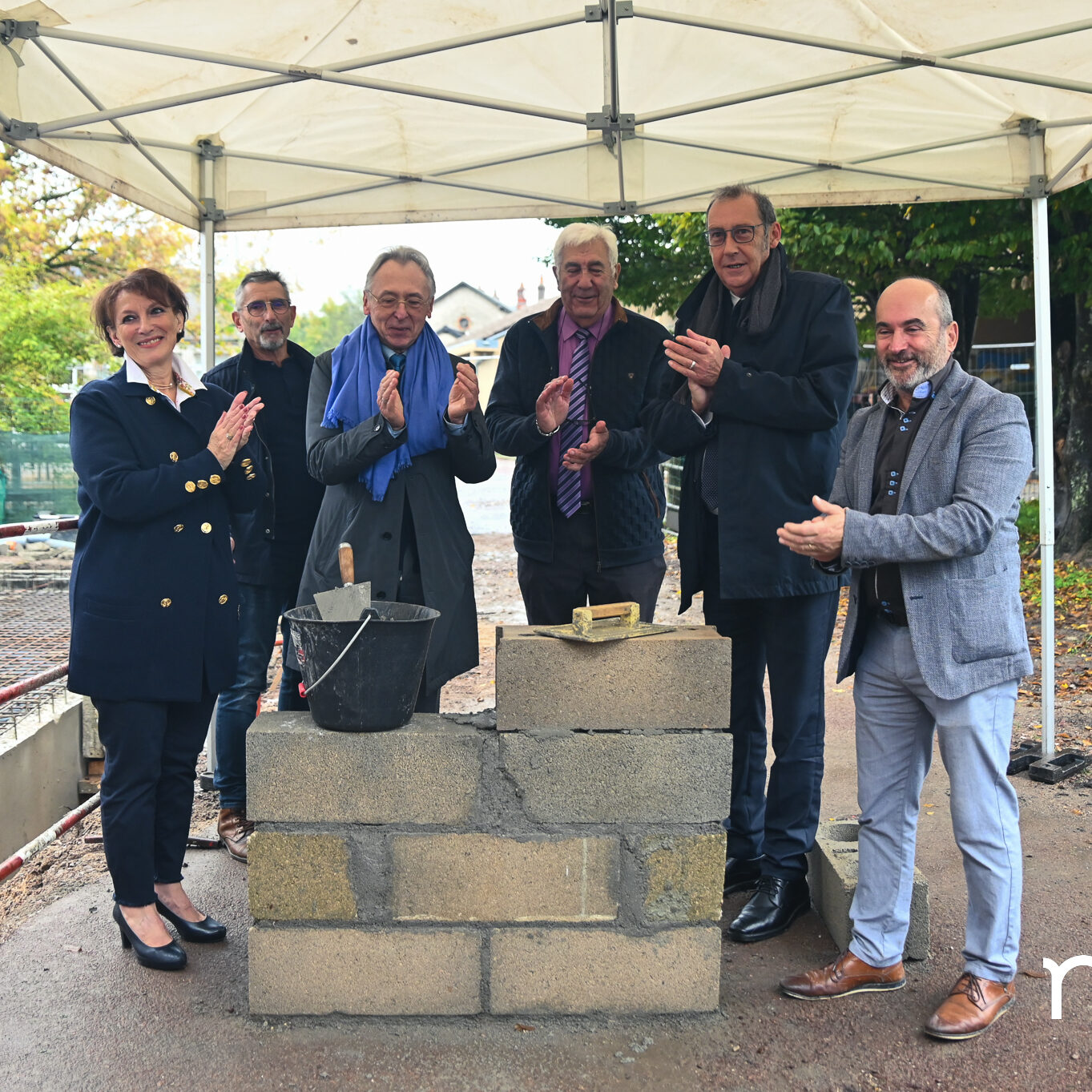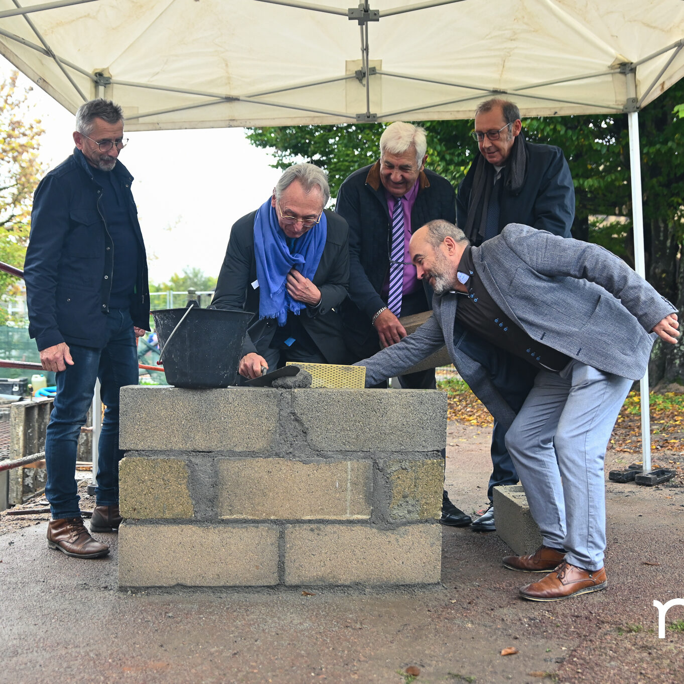 Les ouvriers sont déjà à l’œuvre sur les fers à béton et sous le crachin de fin de semaine, et regardent avec un sourire évaluateur les officiels manier truelle et parpaings pour la pose symbolique de la première pierre, à quelques mètres du chantier d’extension de la Maison de la petite enfance de Prémery.