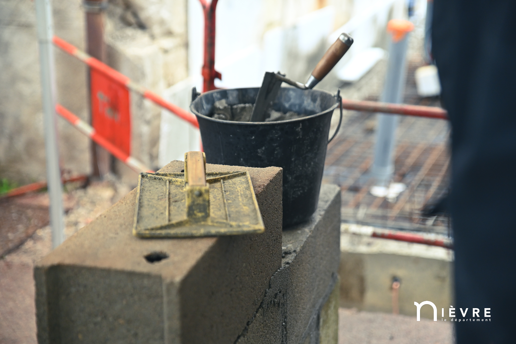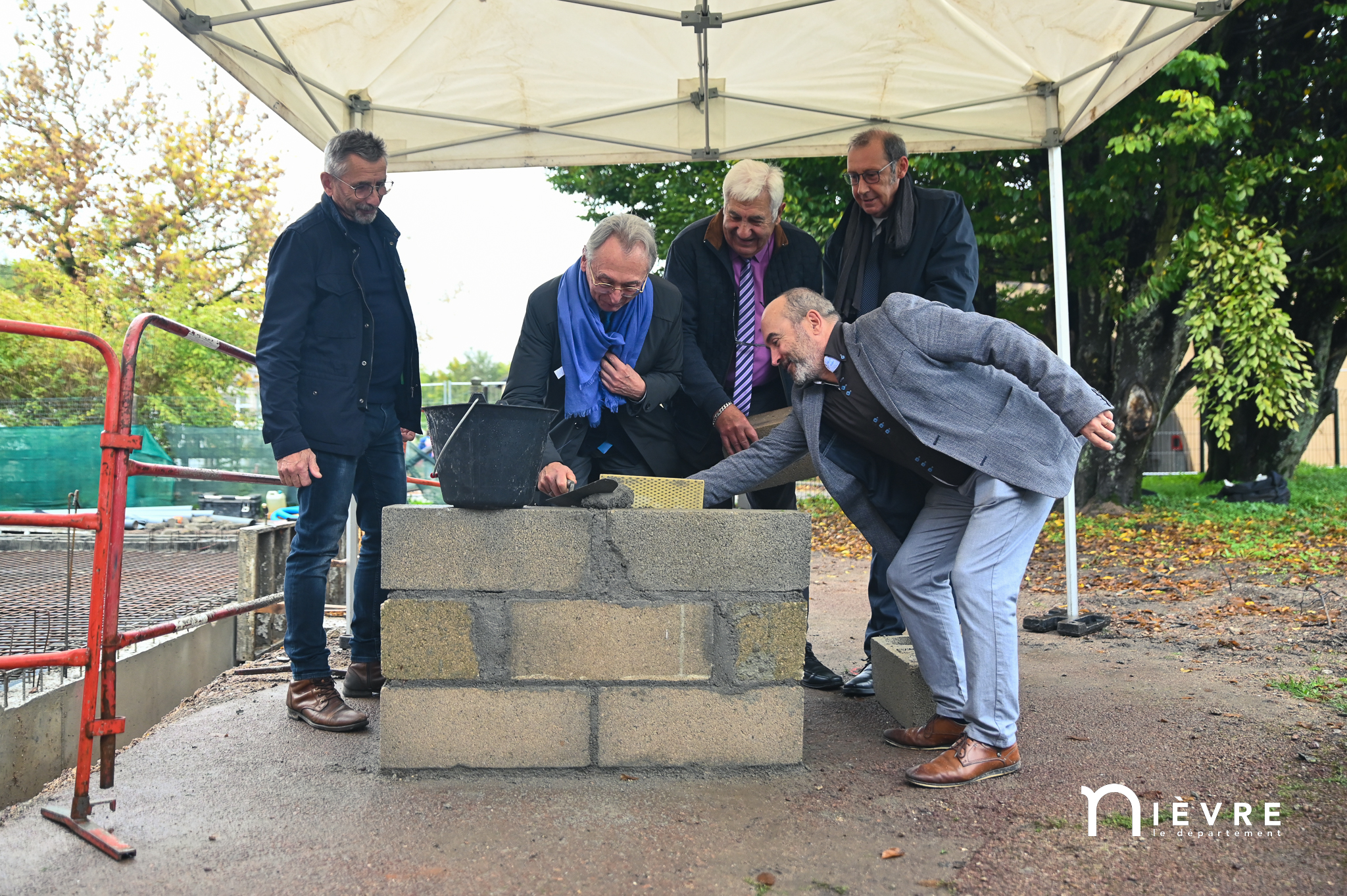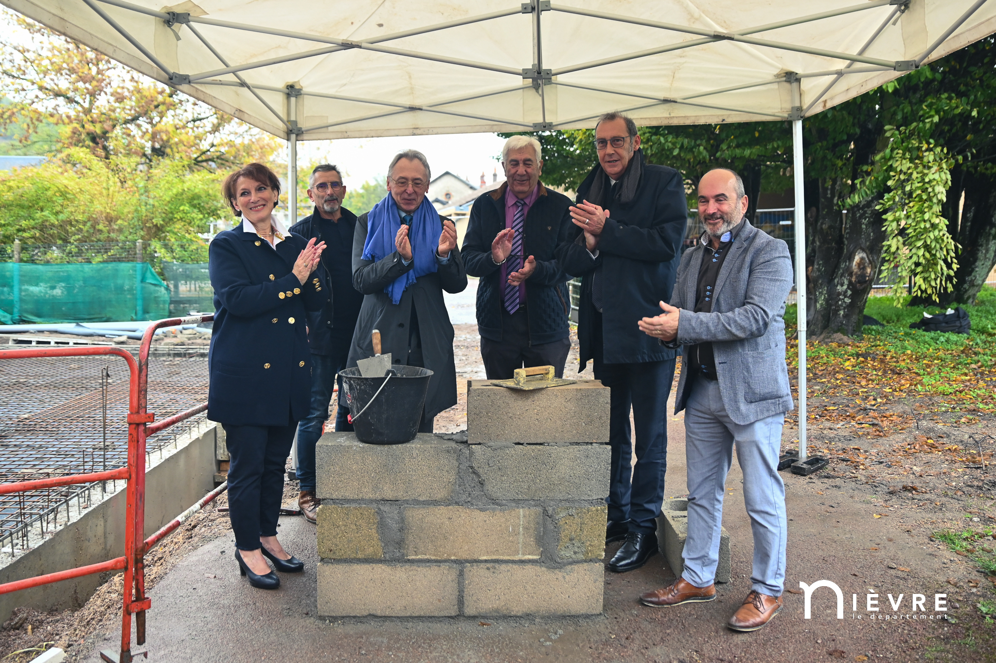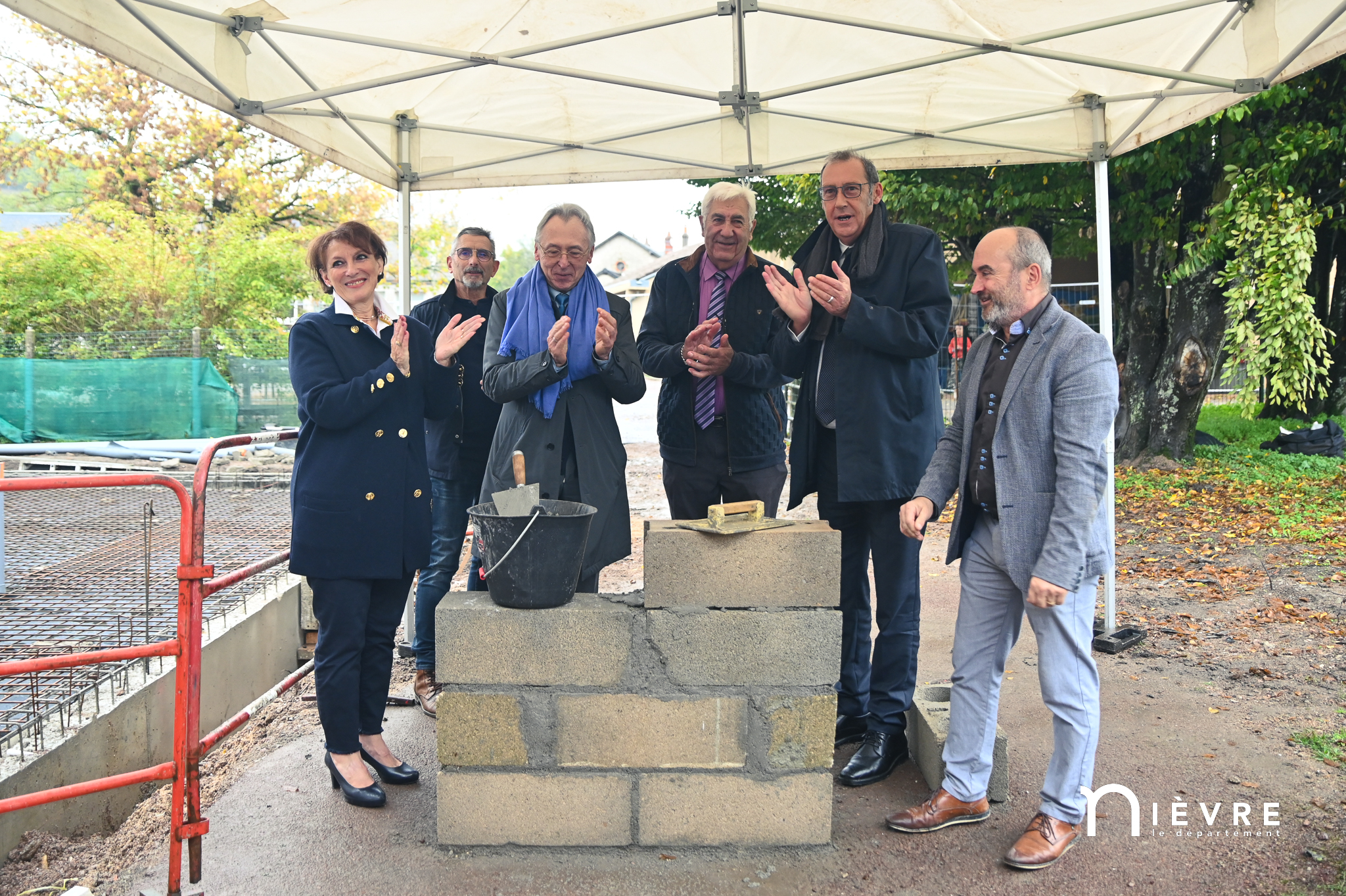 Les ouvriers sont déjà à l’œuvre sur les fers à béton et sous le crachin de fin de semaine, et regardent avec un sourire évaluateur les officiels manier truelle et parpaings pour la pose symbolique de la première pierre, à quelques mètres du chantier d’extension de la Maison de la petite enfance de Prémery.