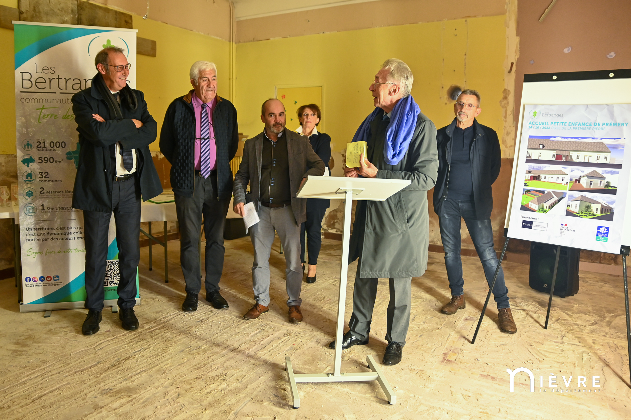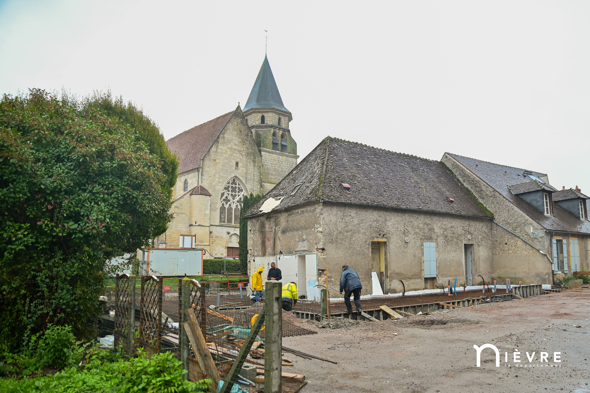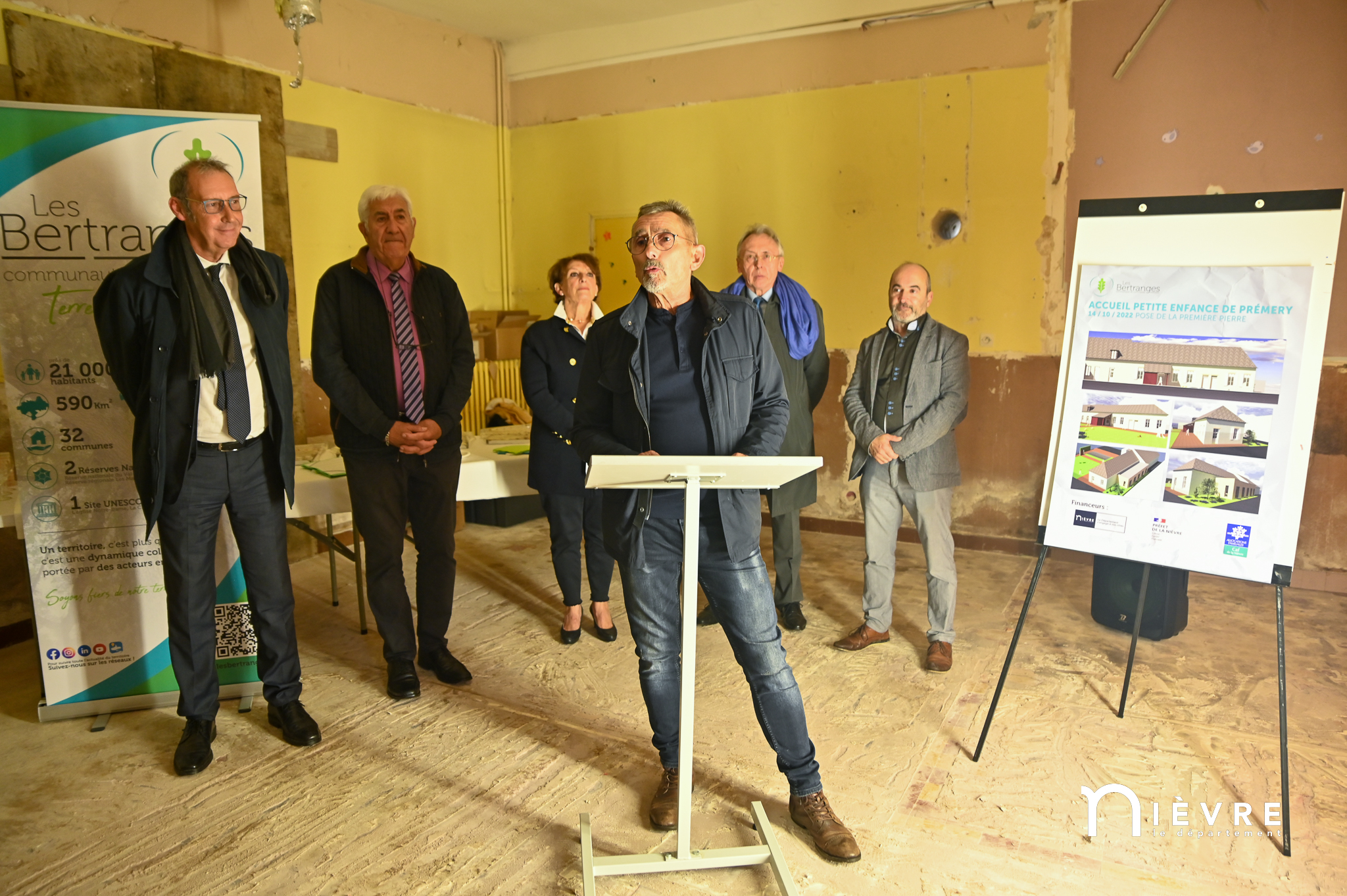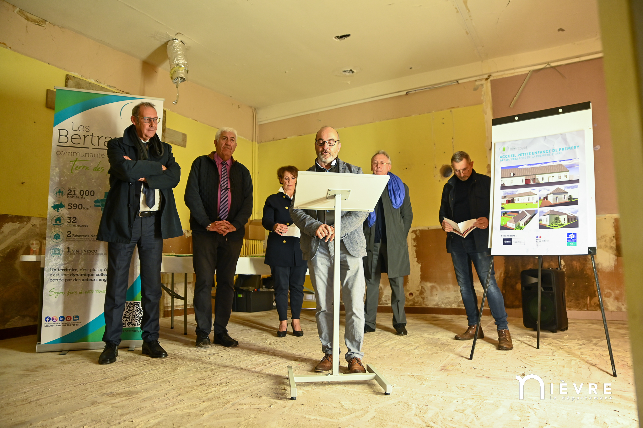 Les ouvriers sont déjà à l’œuvre sur les fers à béton et sous le crachin de fin de semaine, et regardent avec un sourire évaluateur les officiels manier truelle et parpaings pour la pose symbolique de la première pierre, à quelques mètres du chantier d’extension de la Maison de la petite enfance de Prémery.
