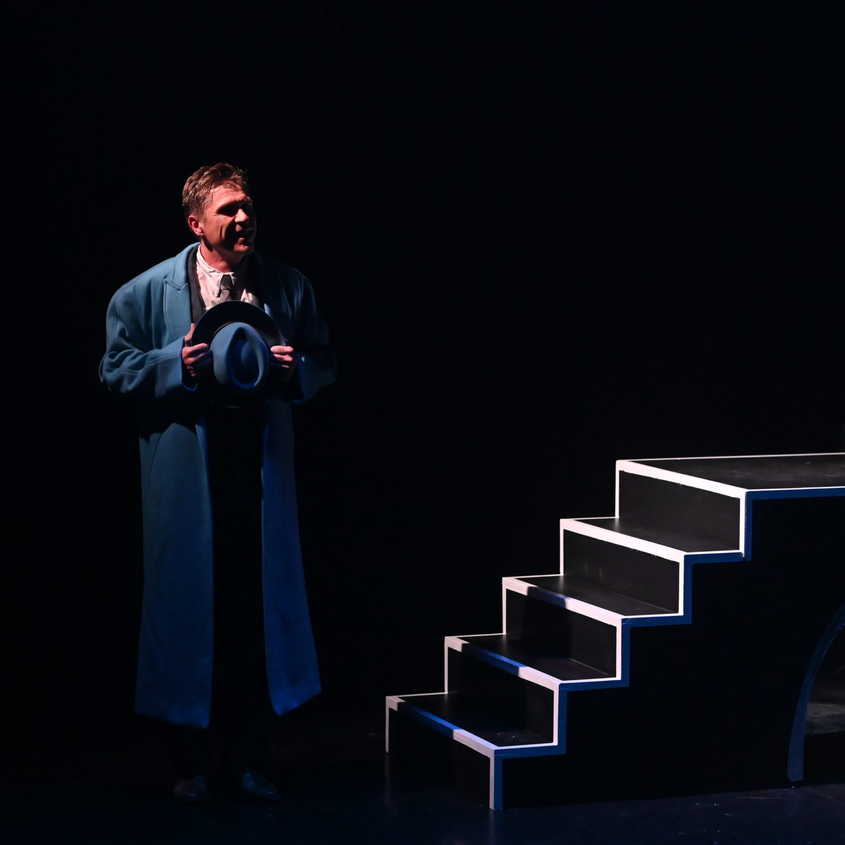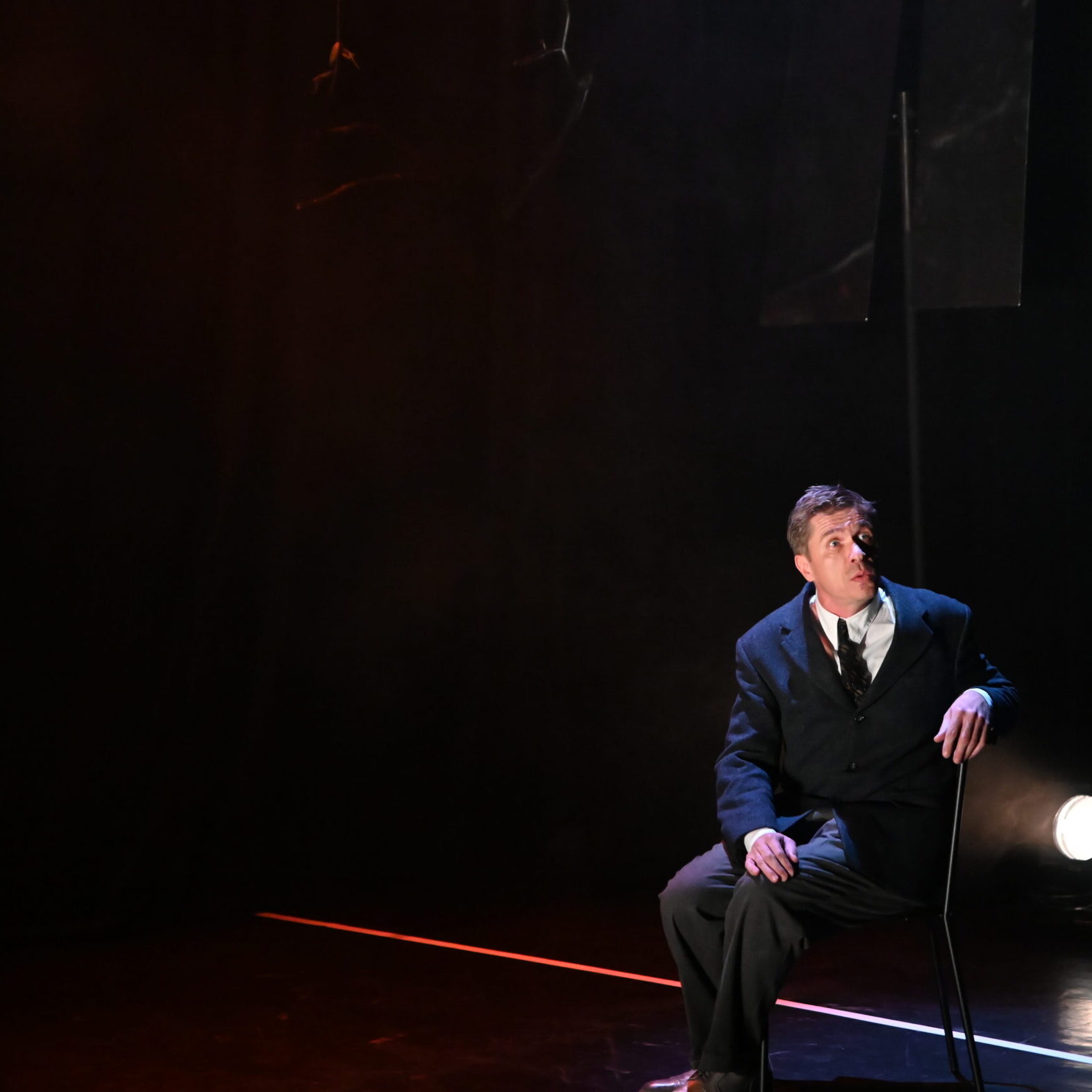 Le comédien alterne lui aussi les rôles, avec aisance et brio, passant de l’un à l’autre sans jamais perdre le spectateur. L’ensemble fonctionne parfaitement et fait son effet. Même le décor s’impose, comme les musiciens sur scène. Volontairement épuré et inspiré du peintre Léon Spilliaert (1881-1946), il marie le noir et les gris, amplifiés par l’éclairage, qui donnent à la pièce une atmosphère sombre et amusante, absurde et réaliste, où la mort peut être belle et libératrice.