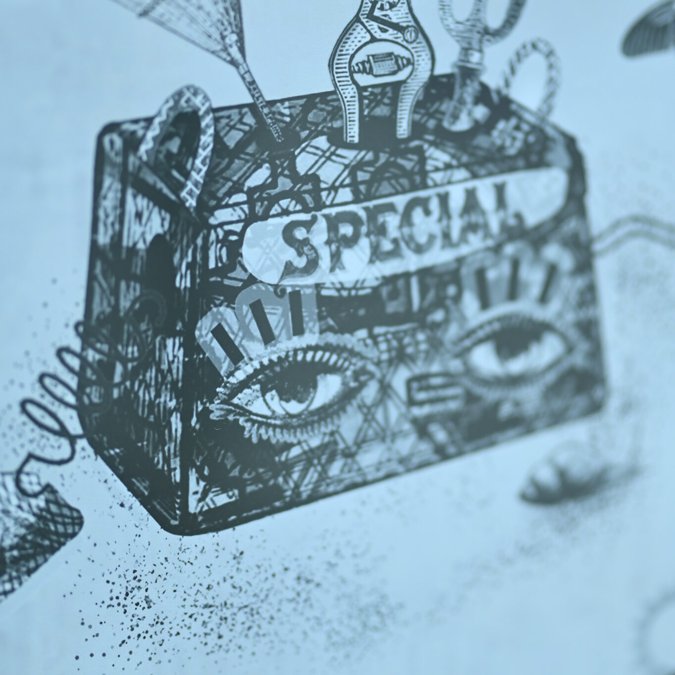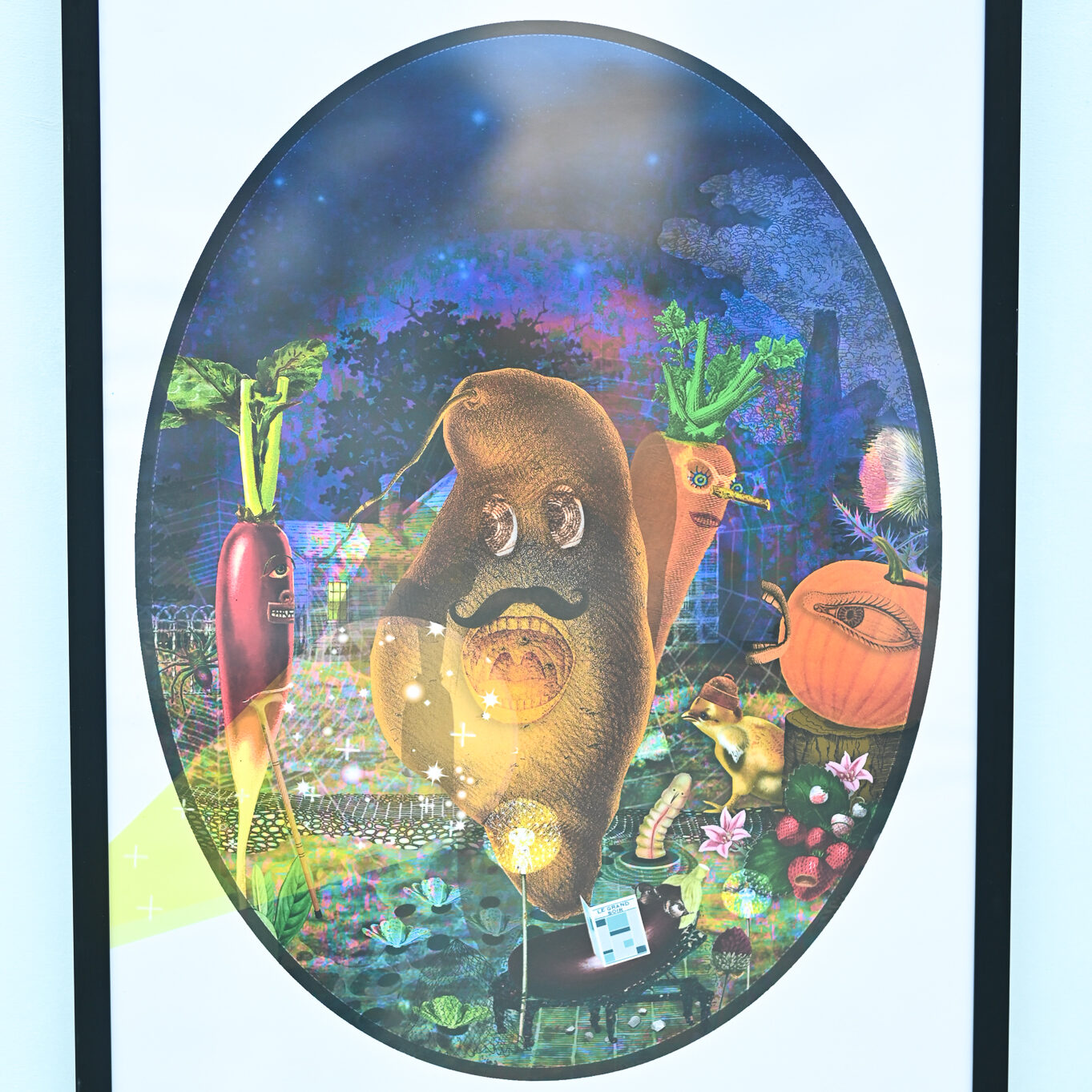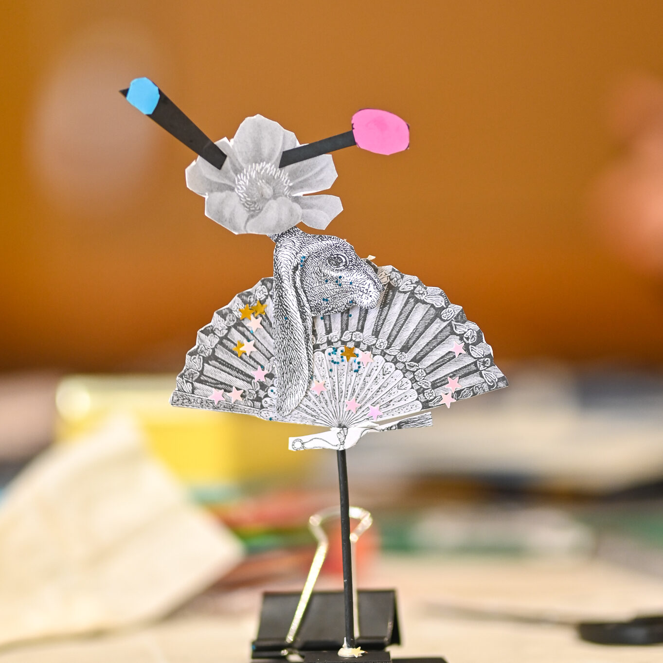 Place à la découverte des illustrations réalisées par superpositions d’images numériques. Une partie des œuvres sont exposées dans des vitrines. Là, l’ambiance est toute autre. L’association d’images collées sur des supports crée une alchimie, un monde étrange où l’infiniment petit prend alors toute sa dimension. Ce savant mélange de collage d’imageries populaires, associé parfois à des objets, plonge le visiteur dans un monde étrange. Un univers merveilleux où la bizarrerie côtoie les thèmes fantastiques, qui rappellent les cabinets de curiosités du XVIe siècle.