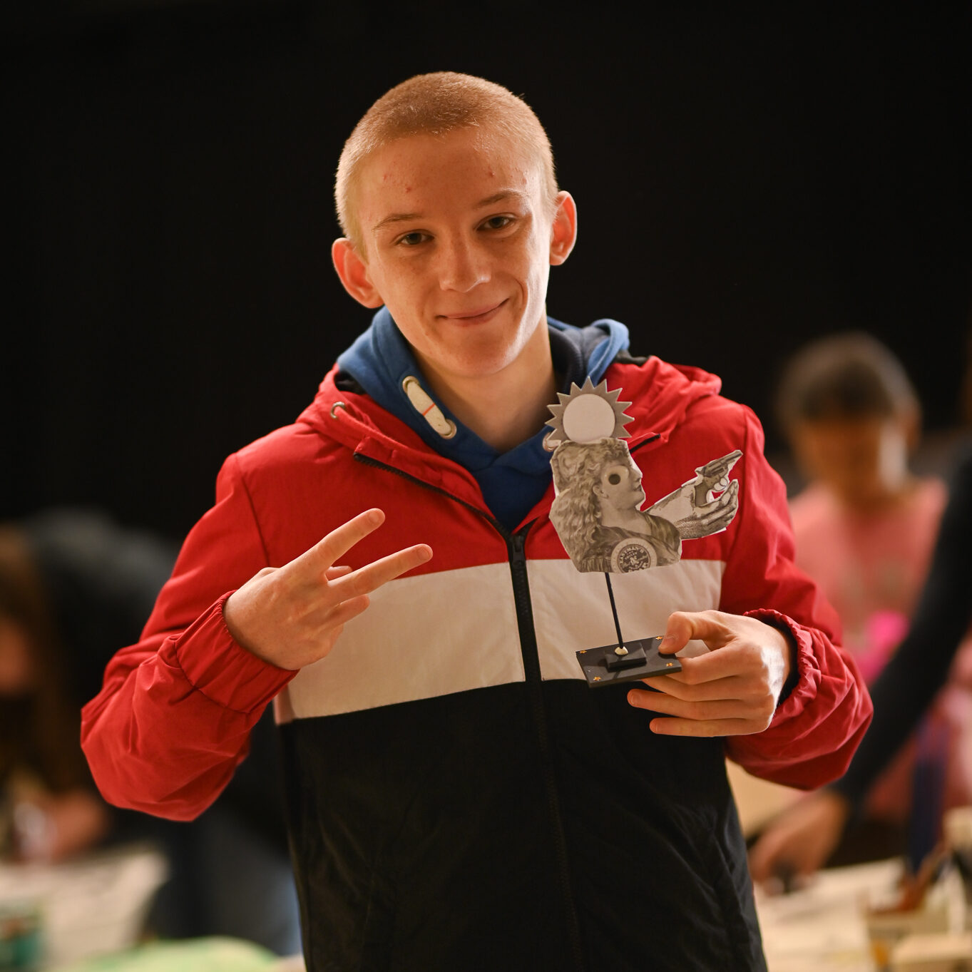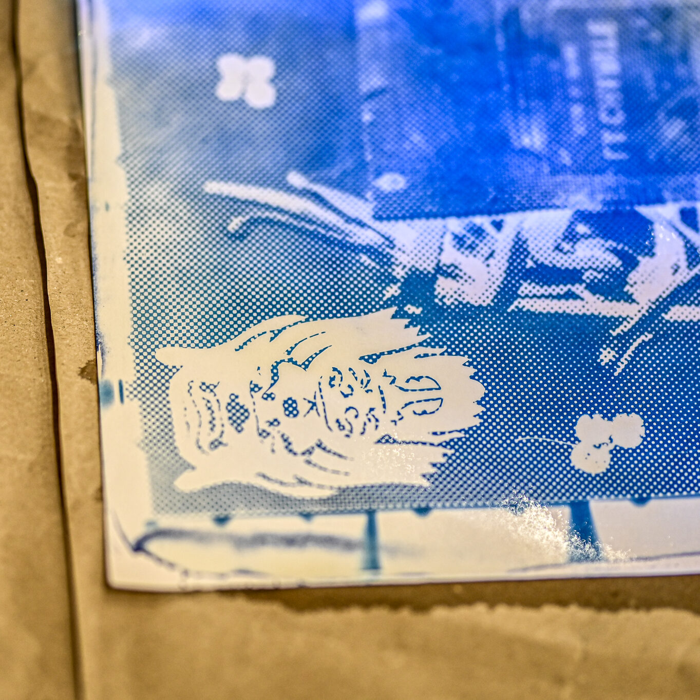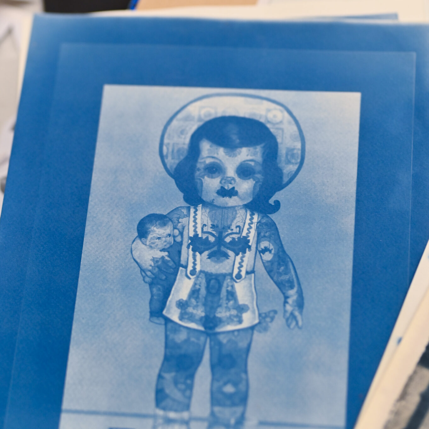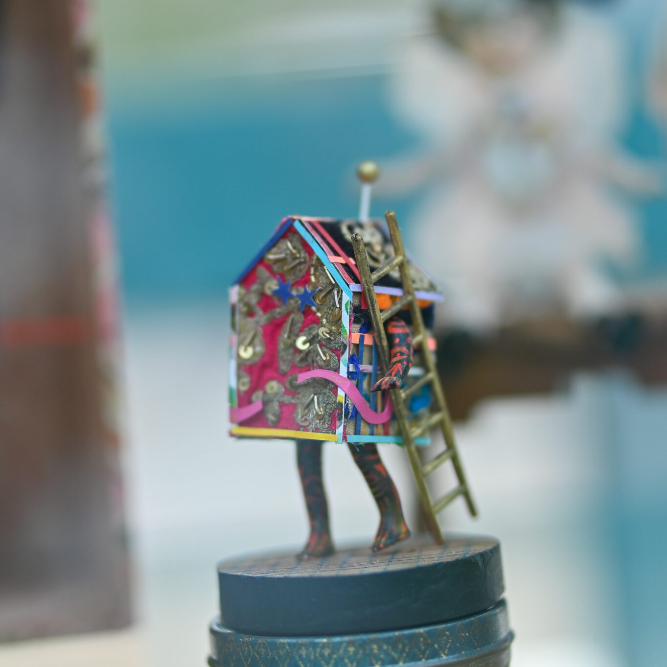 Place à la découverte des illustrations réalisées par superpositions d’images numériques. Une partie des œuvres sont exposées dans des vitrines. Là, l’ambiance est toute autre. L’association d’images collées sur des supports crée une alchimie, un monde étrange où l’infiniment petit prend alors toute sa dimension. Ce savant mélange de collage d’imageries populaires, associé parfois à des objets, plonge le visiteur dans un monde étrange. Un univers merveilleux où la bizarrerie côtoie les thèmes fantastiques, qui rappellent les cabinets de curiosités du XVIe siècle.