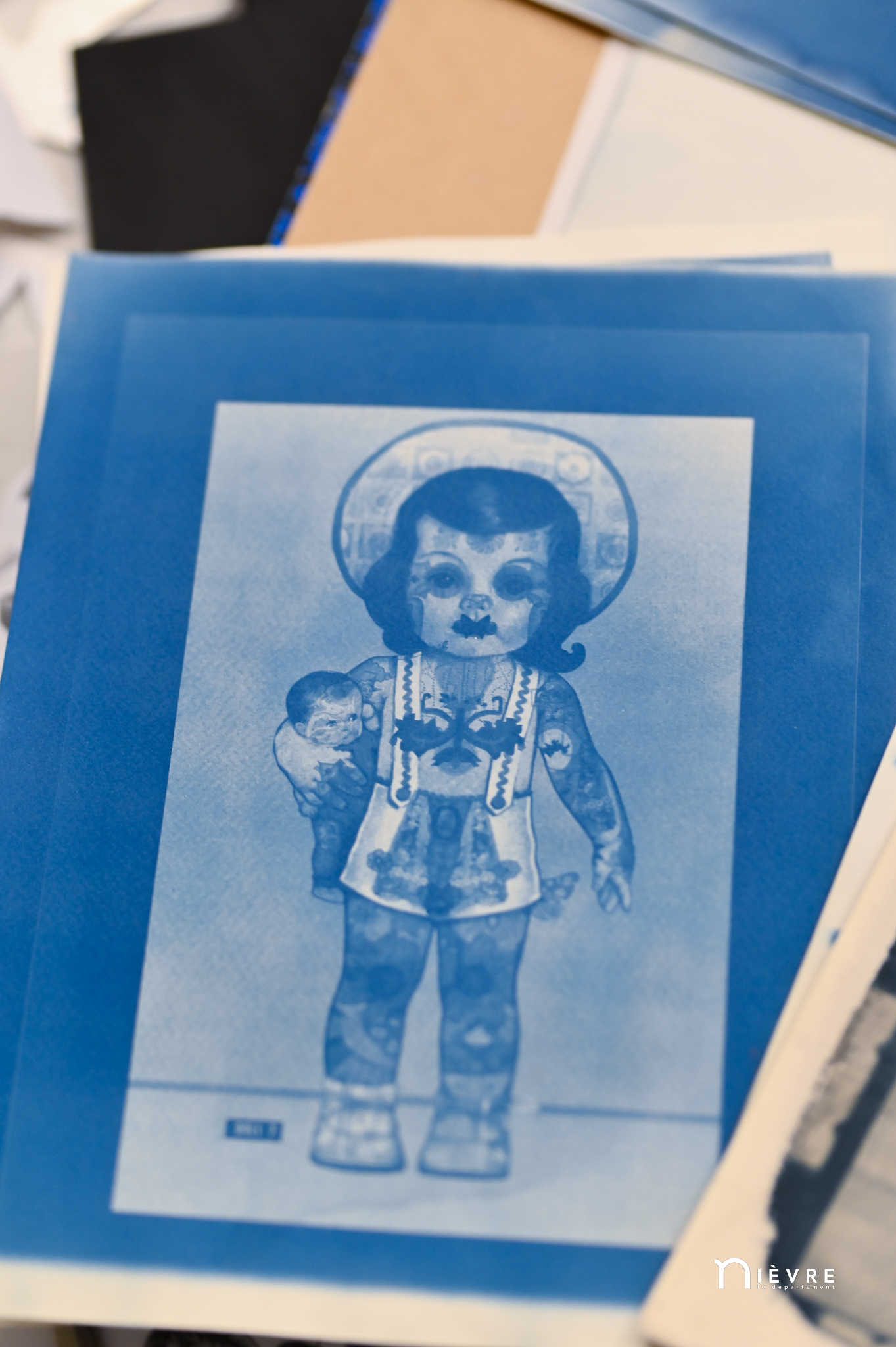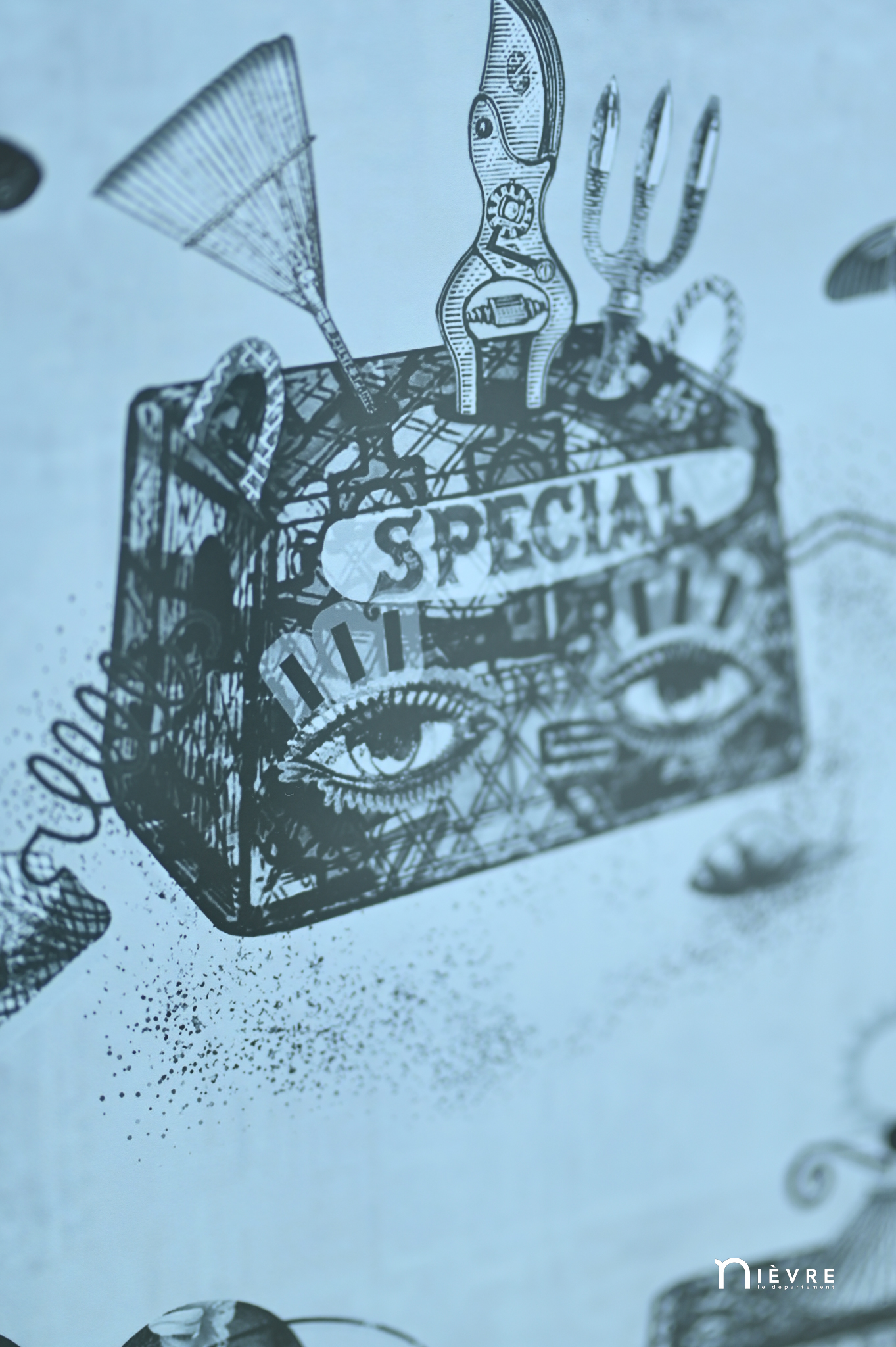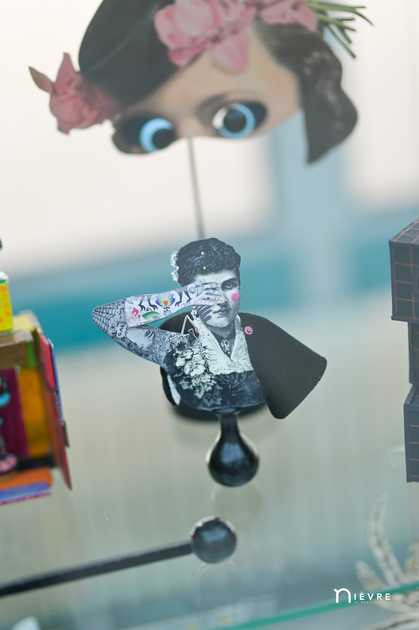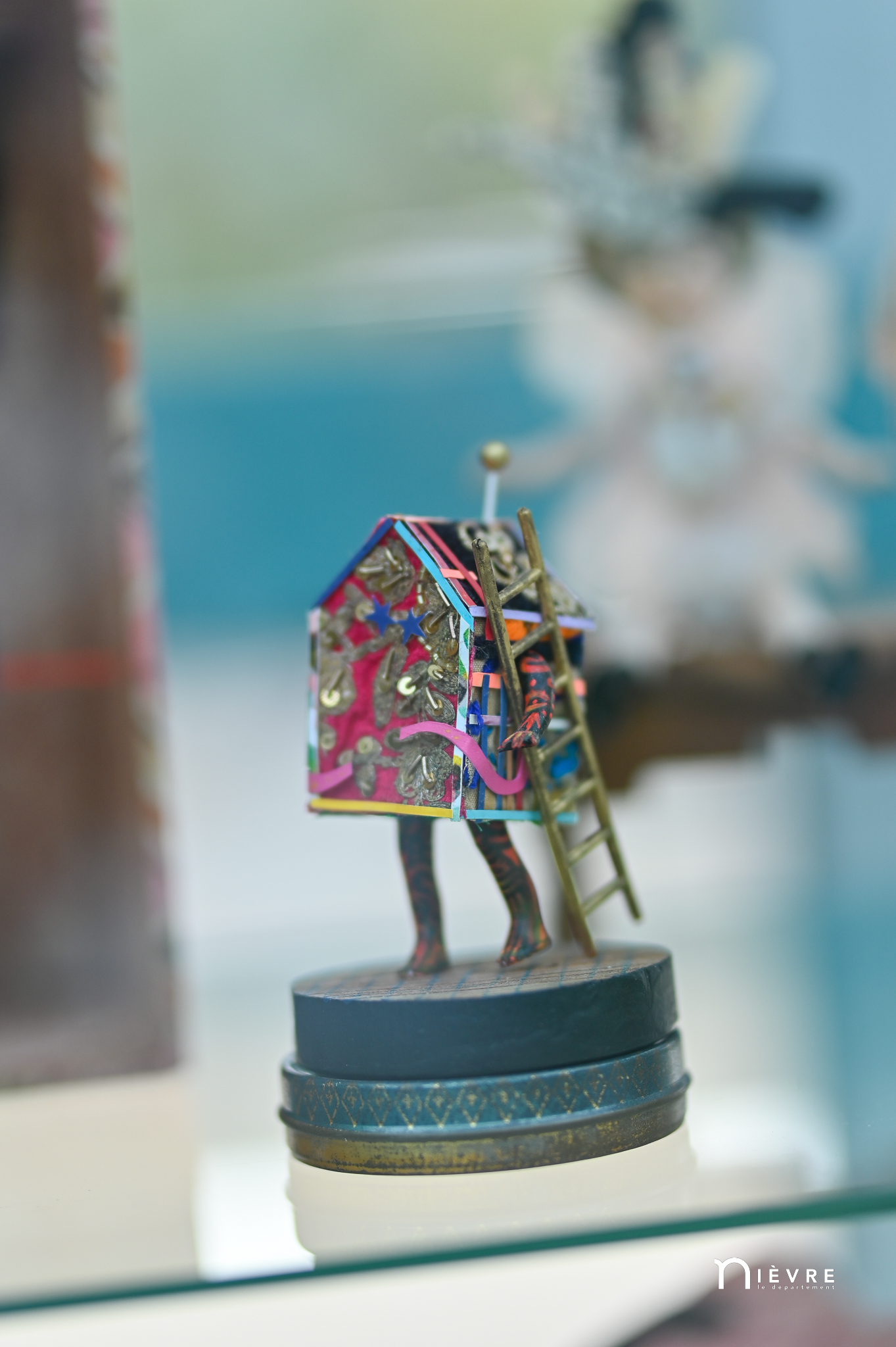 Place à la découverte des illustrations réalisées par superpositions d’images numériques. Une partie des œuvres sont exposées dans des vitrines. Là, l’ambiance est toute autre. L’association d’images collées sur des supports crée une alchimie, un monde étrange où l’infiniment petit prend alors toute sa dimension. Ce savant mélange de collage d’imageries populaires, associé parfois à des objets, plonge le visiteur dans un monde étrange. Un univers merveilleux où la bizarrerie côtoie les thèmes fantastiques, qui rappellent les cabinets de curiosités du XVIe siècle.