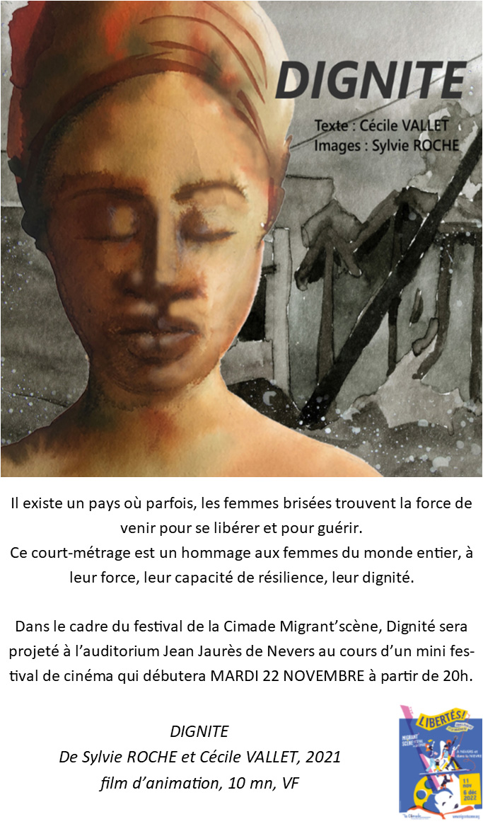 Diffusé pour la première fois mardi 22 novembre à Nevers, à l’occasion du festival Migrant’Scène de la Cimade (voir encadré), Dignité est promis à une longue vie : « On veut le présenter dans des festivals de courts métrages, comme celui de Clermont-Ferrand ou Parties de campagne, mais aussi le proposer à des associations engagées pour les droits des femmes ou ceux des demandeurs d’asile. On espère qu’elles s’en empareront pour montrer que tout est possible, que toutes les souffrances endurées ne peuvent pas vous réduire. On n’est pas tous dans la résilience, et c’est un exemple à suivre. »