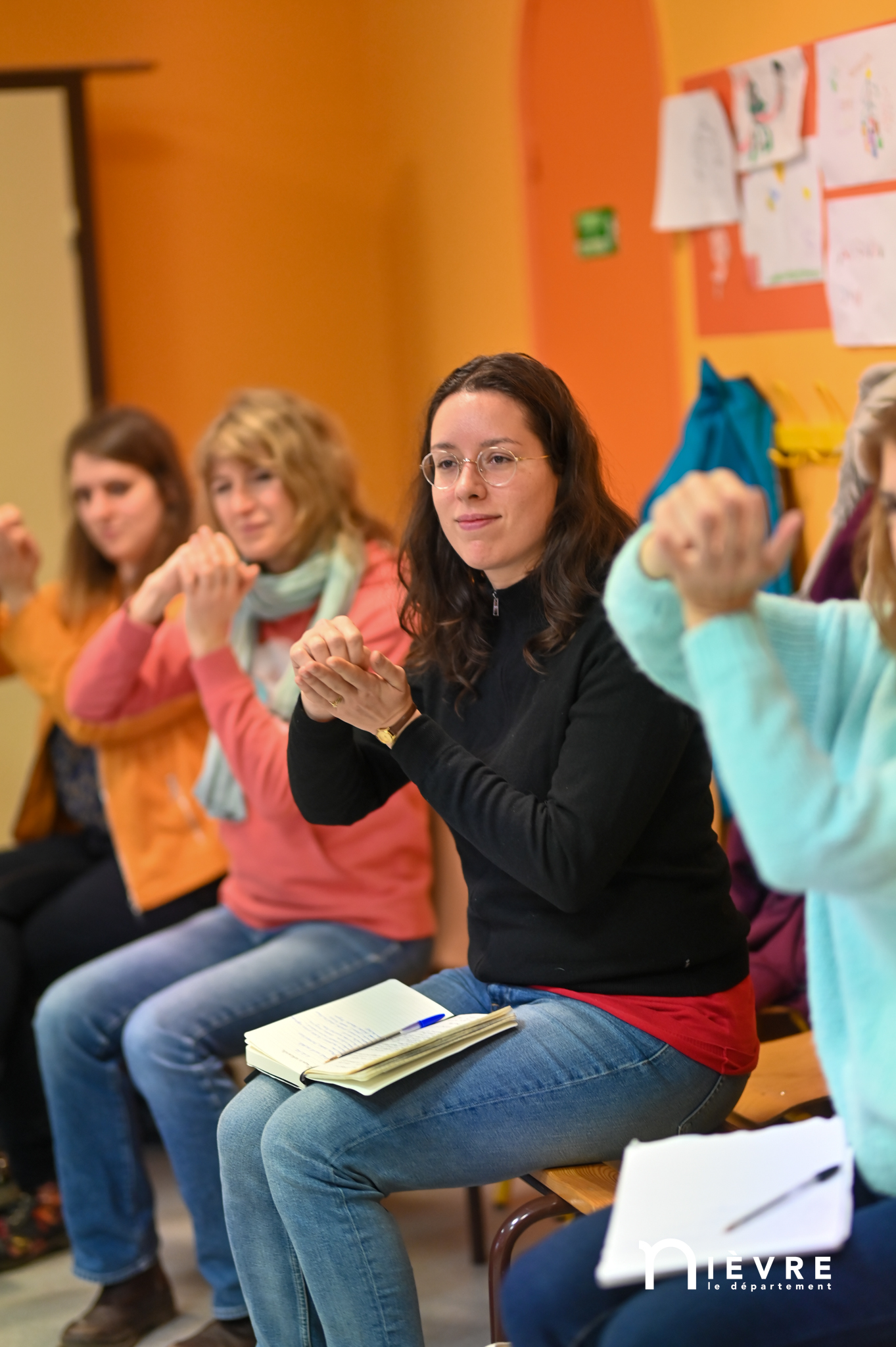 La lecture qui se répète cinq, dix ou vingt fois fait elle aussi partie du jeu : « La relecture entre dans l’histoire, la mémoire fait son travail, cela facilite les apprentissages, comme celui des récitations. Lire le même livre, cela rassure les enfants, c’est associé à un bon moment. » Le rituel est le même avec les chansons pour enfants, dont Arielle Dervieu (professeure d’éveil musical et membre de RESO Nièvre) a détaillé les vertus en matière de construction cognitive et sociale, de mémorisation et de motricité, dans un atelier joyeusement participatif.