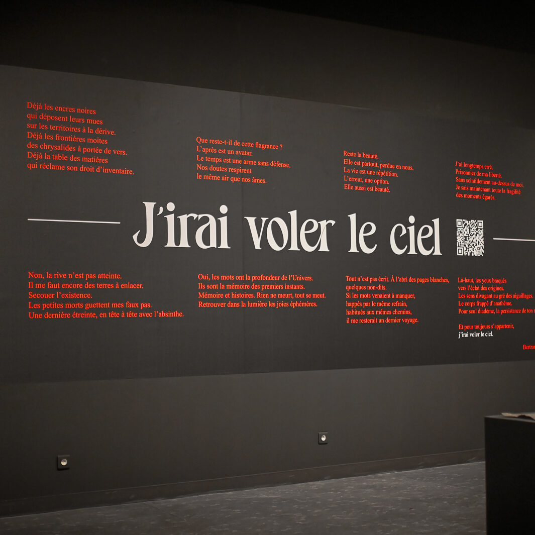 L’édition d’un recueil de poèmes, De l’autre côté du ciel brillent les étoiles, est en bonne voie, mais l’auteur refuse de s’emballer dans cette ultime étape d’un lent processus : « Ces 48 poèmes, c’est trois ans de polissage. Un vrai travail de sculpture. Quand on écrit, il y a une part de deuil à faire, car on détruit beaucoup ; j’ai détruit autant de poèmes que j’en ai écrit. » Une création qu’il accomplit toujours en musique : « Je vais chercher les émotions dans la musique. Un poème, c’est un rythme. » Via un QR Code, les visiteurs de l’exposition peuvent accéder à la bande-songe de cet admirateur de la sainte trilogie des poètes damnés Baudelaire-Rimbaud-Verlaine et de la jeune contemporaine Cécile Coulon, qui revivifie un genre encore en marge, mais où Bertrand Chevalier aime poser ses fêlures : « On ne peut pas écrire de poème si on n’est pas écorché vif. »