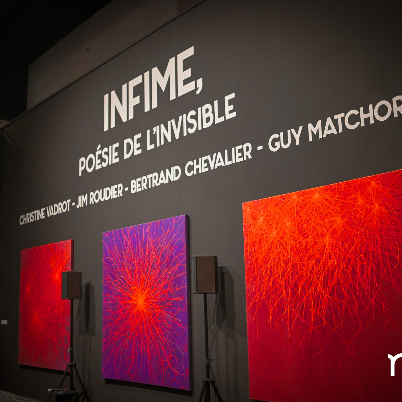 Compagnon de route de La Maison depuis quelques années, en tant que professeur missionné par la Direction régionale des affaires culturelles (DRAC), le poète est l’une des quatre sources d’inspiration dans lesquelles Christophe Vootz, commissaire des expositions du vénérable vaisseau culturel, a puisé la matière d’« Infime, poésie de l’invisible ». Les toiles de Christine Vadrot, les installations de Guy Matchoro, les photographies de Jim Roudier et les mots de Bertrand Chevalier sont assemblés en un puzzle unique et subjectif, dont les correspondances se tissent dans l’œil du spectateur. Pas d’interprétation téléguidée, mais un bouquet de sensations, un mille-feuille d’univers où l’orange des dents de RIP Ragondin répond au crépitant Electric dont le grand format éclabousse un pan de mur, où une soufflerie fait danser la couverture de survie, image onirique et hallucinée que le génocide rwandais a inspirée à Guy Matchoro.