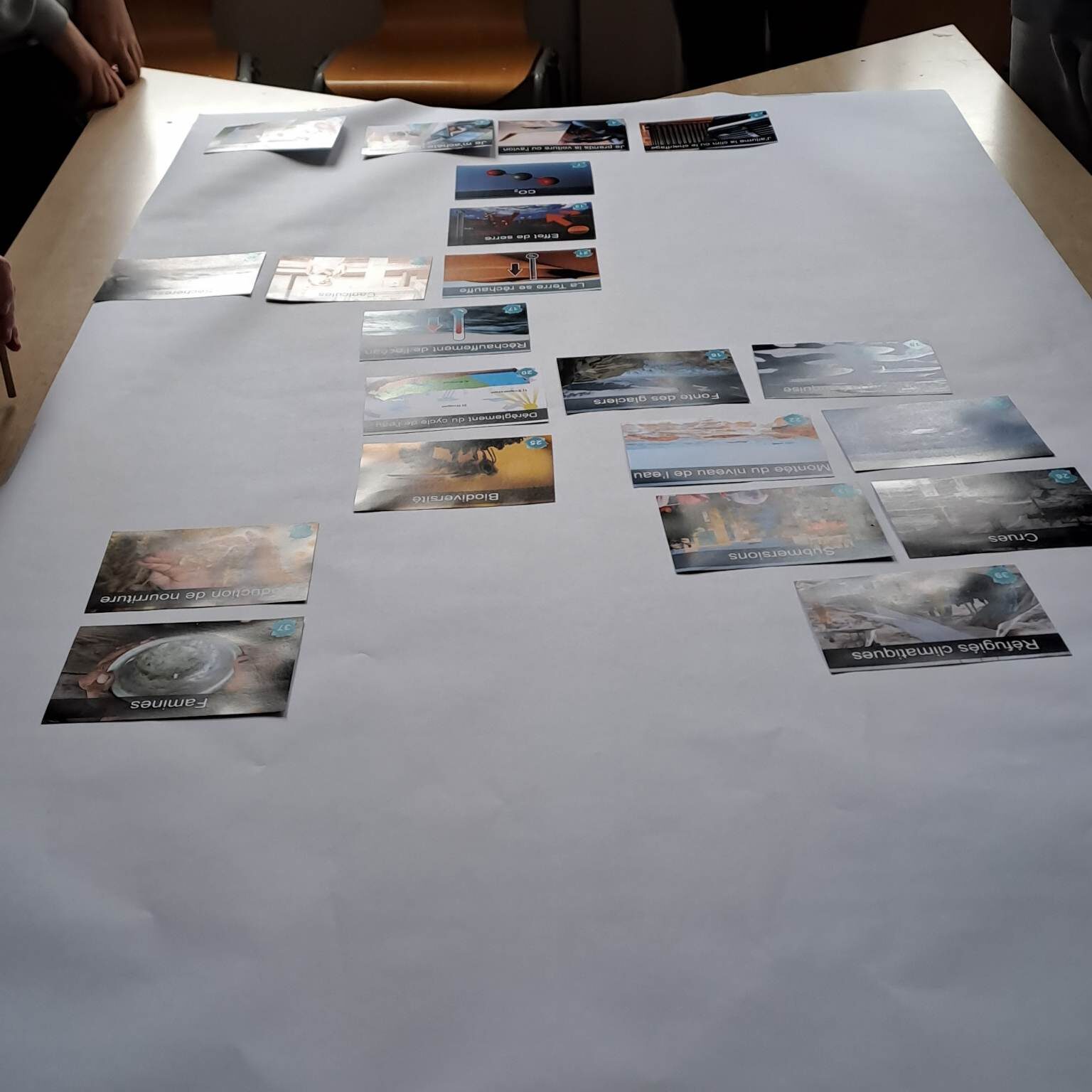 Les élèves échangent, donnent leurs avis, et peu à peu des liens se font entre les cartes : cyclone/réchauffement des océans, canicule/réchauffement de la Terre, réfugiés climatiques/famines. Des liens qui reflètent la triste réalité.