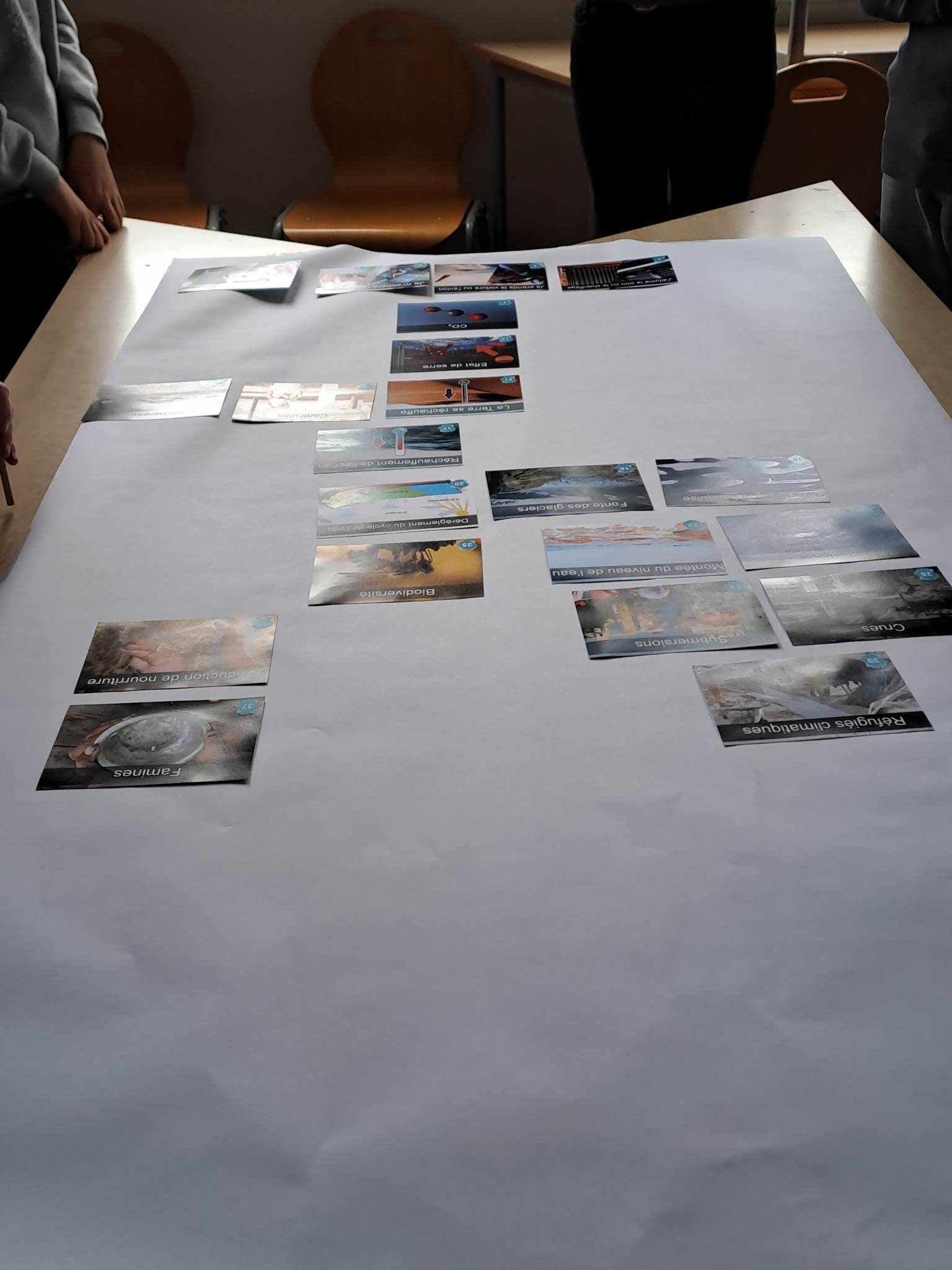 Les élèves échangent, donnent leurs avis, et peu à peu des liens se font entre les cartes : cyclone/réchauffement des océans, canicule/réchauffement de la Terre, réfugiés climatiques/famines. Des liens qui reflètent la triste réalité.