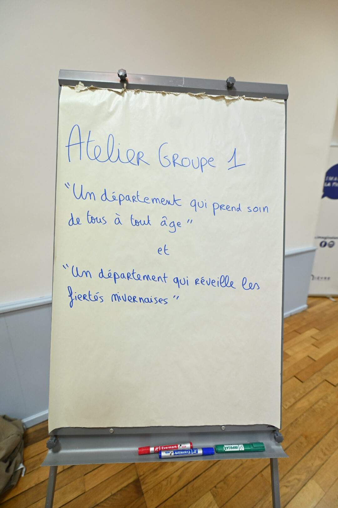 Alors qu’un premier atelier était consacré aux deux ambitions « un département qui prend soin de tous à tout âge » et « un département qui réveille les fiertés nivernaises », le second groupe débattait des thèmes « le département met la jeunesse au cœur de son renouveau » et « un département qui pilote les changements écologiques ». Le dialogue s’est naturellement amorcé entre les citoyens, les élus et les agents de la direction générale des services.