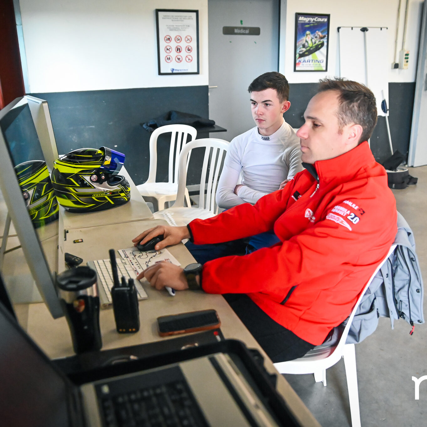 Sous l’œil de Lionel Lécher, vice-président du Conseil départemental en charge des sports, Lenny Roches enchaîne les boucles de la piste Club du circuit de Nevers Magny-Cours. Puis rentre au stand pour un débrief avec son coach, sur un écran d’ordinateur où défilent les images et les données de la caméra embarquée. « J’ai amélioré mon freinage mais il faut que je sois meilleur sur mon placement ; dans les virages, ce n’est pas encore ça », analyse à chaud le vainqueur du Challenge Karting 2022.