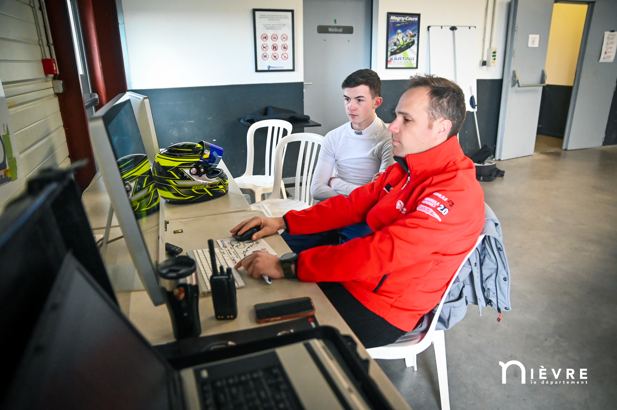Sous l’œil de Lionel Lécher, vice-président du Conseil départemental en charge des sports, Lenny Roches enchaîne les boucles de la piste Club du circuit de Nevers Magny-Cours. Puis rentre au stand pour un débrief avec son coach, sur un écran d’ordinateur où défilent les images et les données de la caméra embarquée. « J’ai amélioré mon freinage mais il faut que je sois meilleur sur mon placement ; dans les virages, ce n’est pas encore ça », analyse à chaud le vainqueur du Challenge Karting 2022.