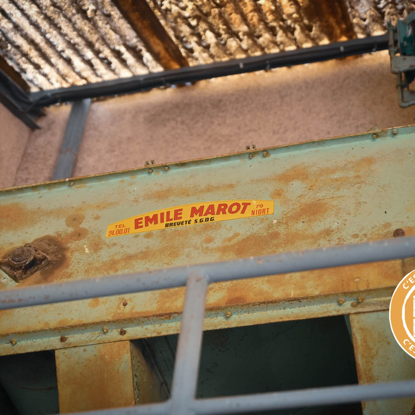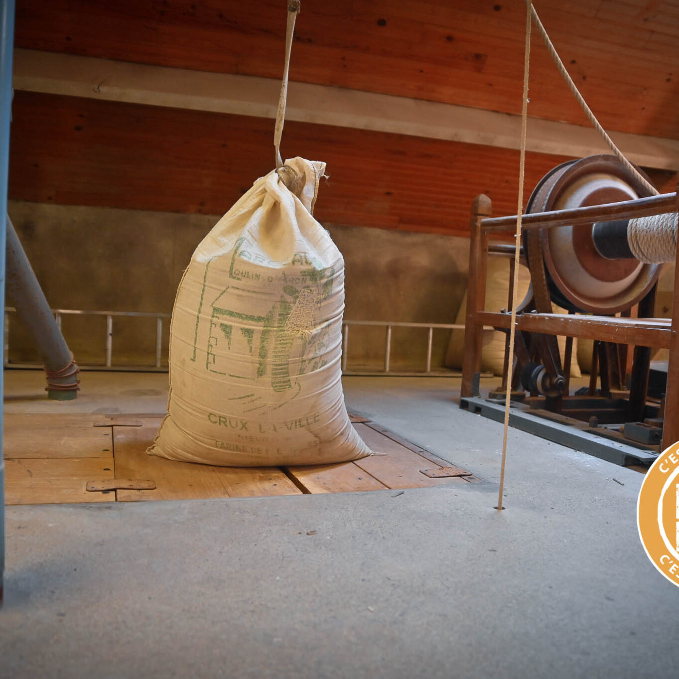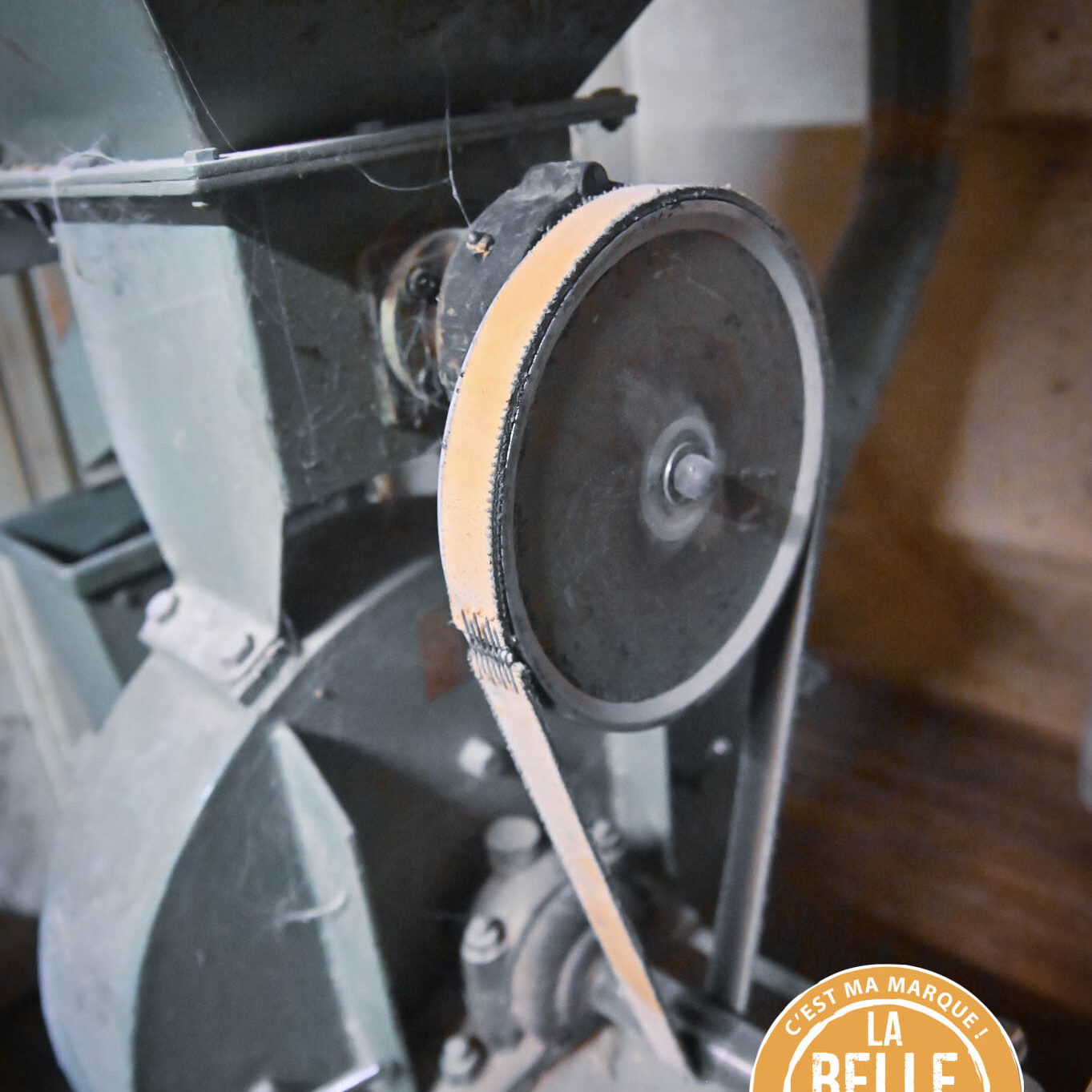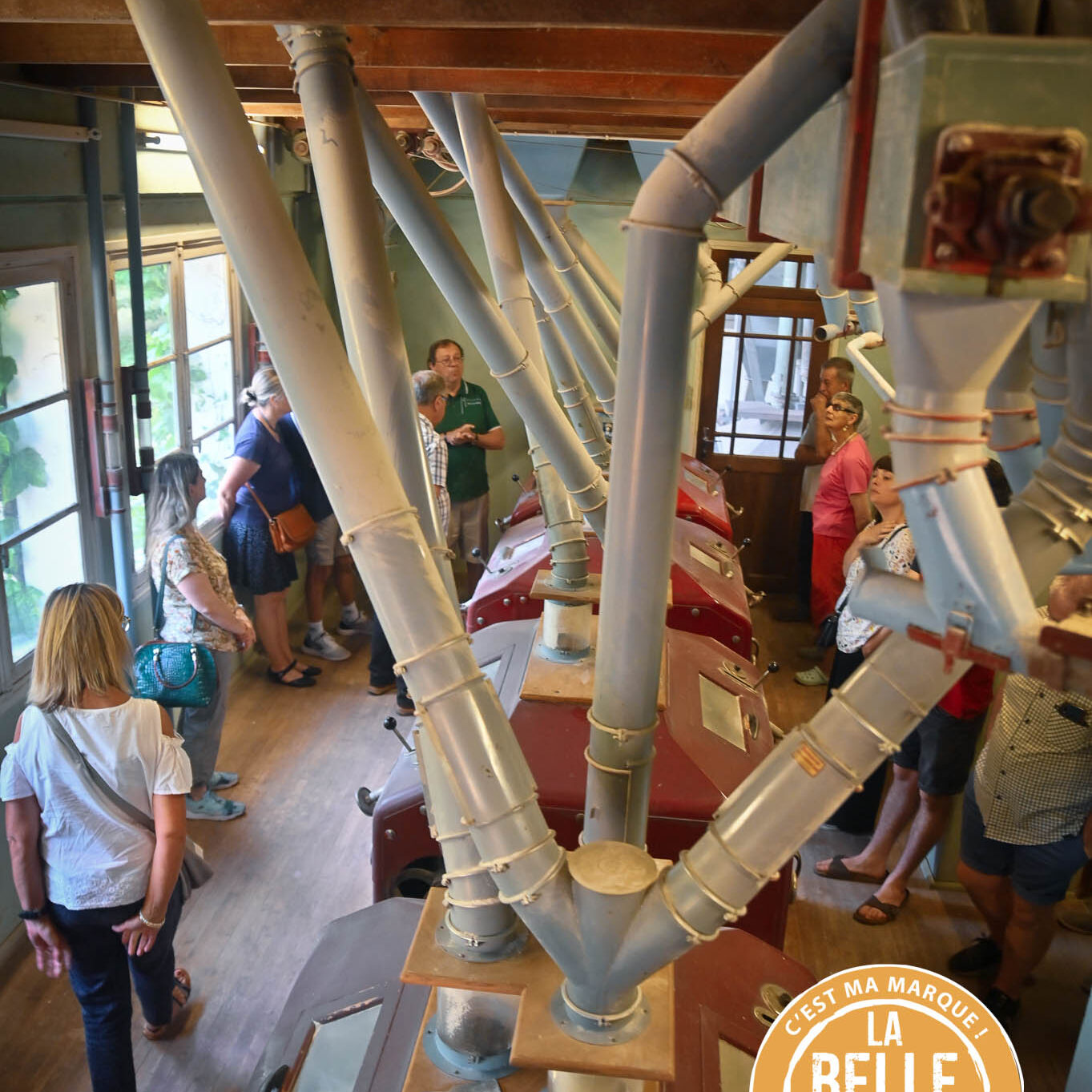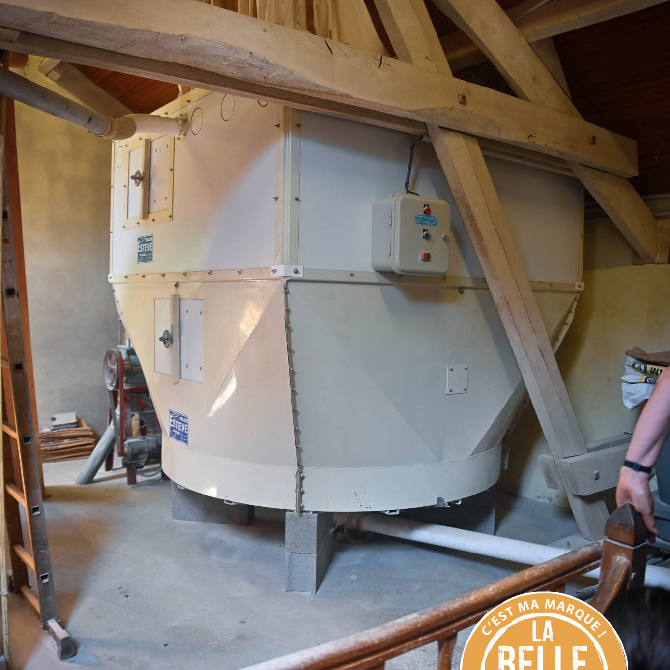 Sylvain Marceau reprend la main et commence la visite. À peine entré dans le moulin, l’odeur prégnante de la farine, plutôt agréable, se glisse dans les moindres interstices, au sens propre comme au sens figuré. La poussière de farine est omniprésente ; quoi que l’on touche, nous voilà recouverts de minuscules particules. Un système complexe d’aspiration, de tuyaux en tout genre et de machines occupe tout l’espace.