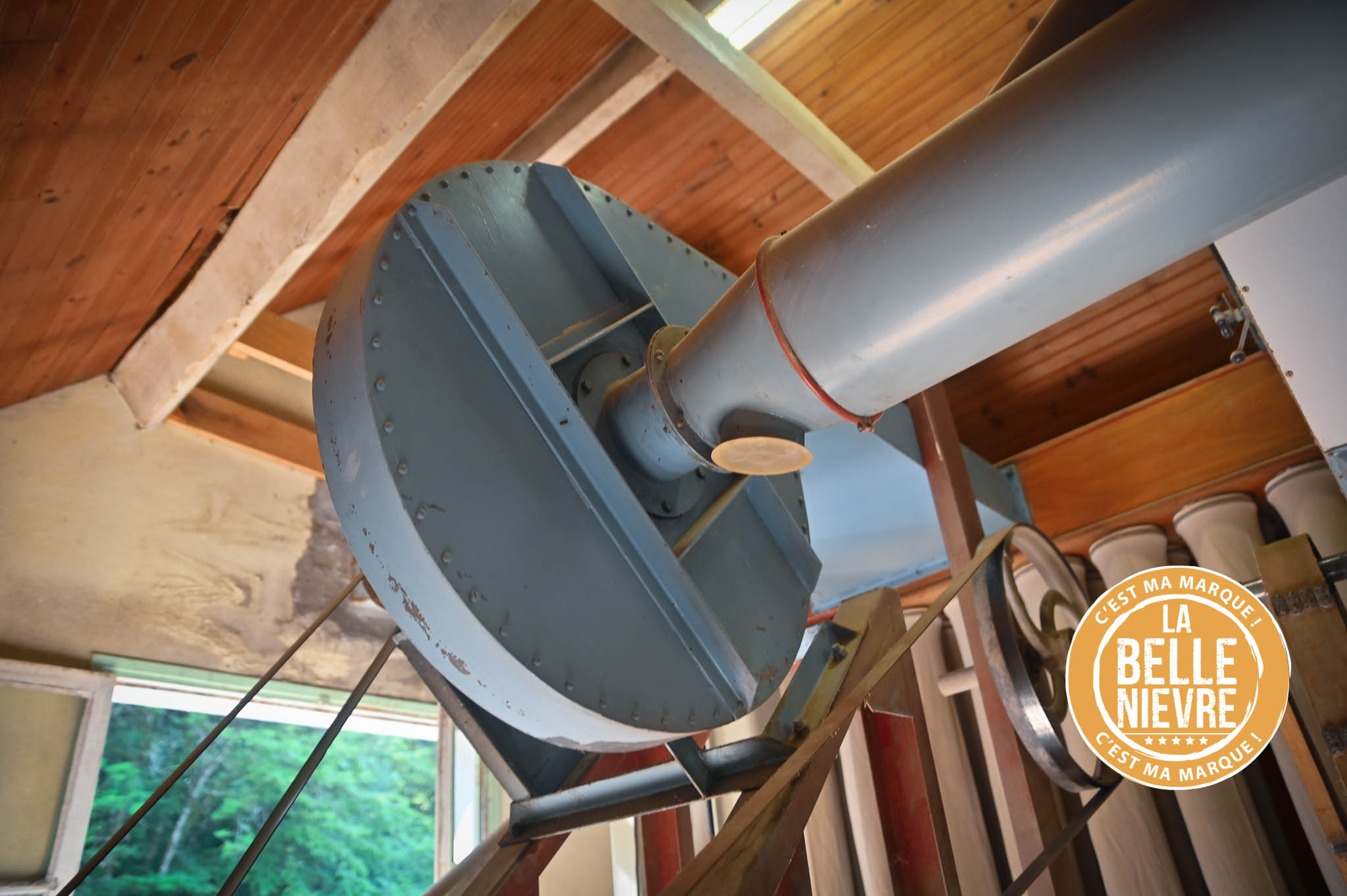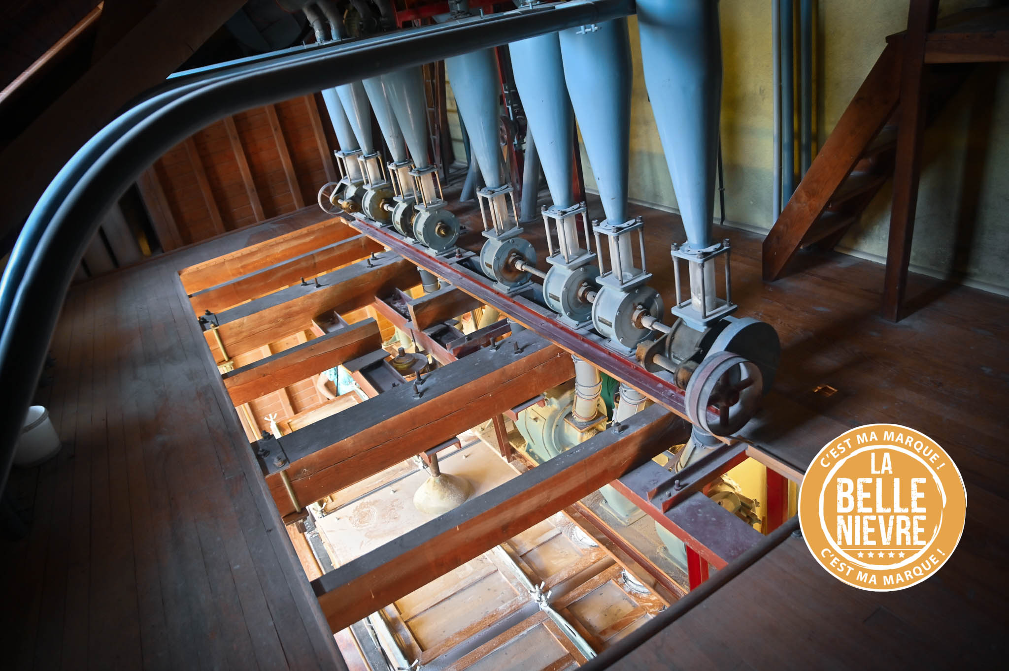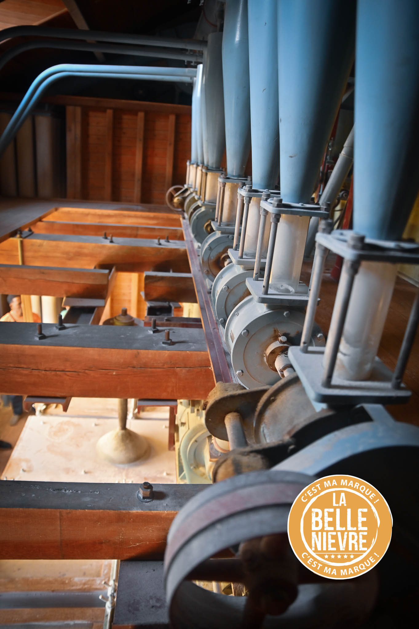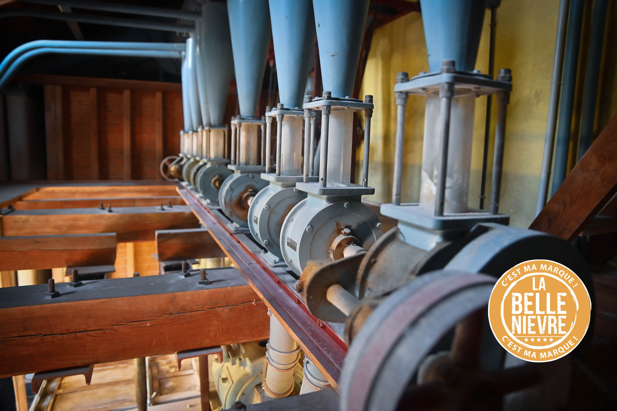 Sylvain Marceau reprend la main et commence la visite. À peine entré dans le moulin, l’odeur prégnante de la farine, plutôt agréable, se glisse dans les moindres interstices, au sens propre comme au sens figuré. La poussière de farine est omniprésente ; quoi que l’on touche, nous voilà recouverts de minuscules particules. Un système complexe d’aspiration, de tuyaux en tout genre et de machines occupe tout l’espace.