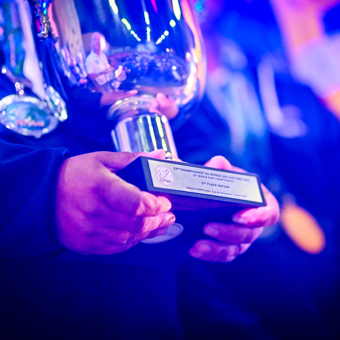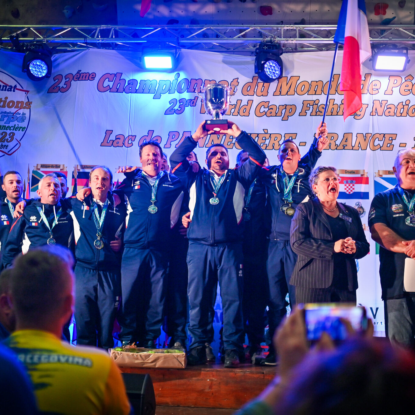 En attendant, tous deux savourent, reçoivent fièrement les félicitations, les tapes amicales et les demandes de selfies des adversaires. Et se lâchent, enfin, sur la plus haute marche du podium, énorme coupe dans une main, un bouquet de fleurs dans l’autre, et s’époumonent sur la Marseillaise. Dans la salle, les 32 délégations, les bénévoles, les officiels et les partenaires sont au coude à coude autour des tables : « On a réuni 32 nations, c’est un record qui sera difficile à battre », souligne Jacques Goupil, président de la Fédération française de pêche sportive. Son vice-président coordinateur de l’organisation, Fernand de Castro, fait applaudir les 150 bénévoles : « Sans vous, on n’aurait rien pu faire. »