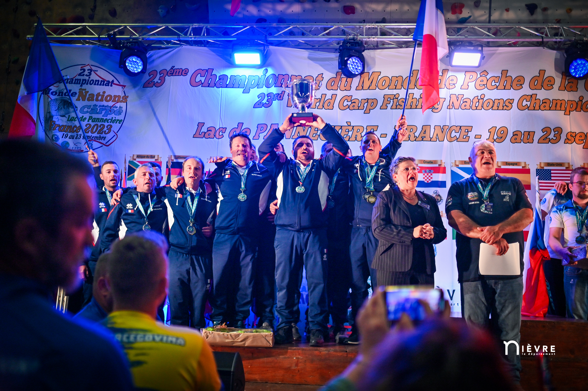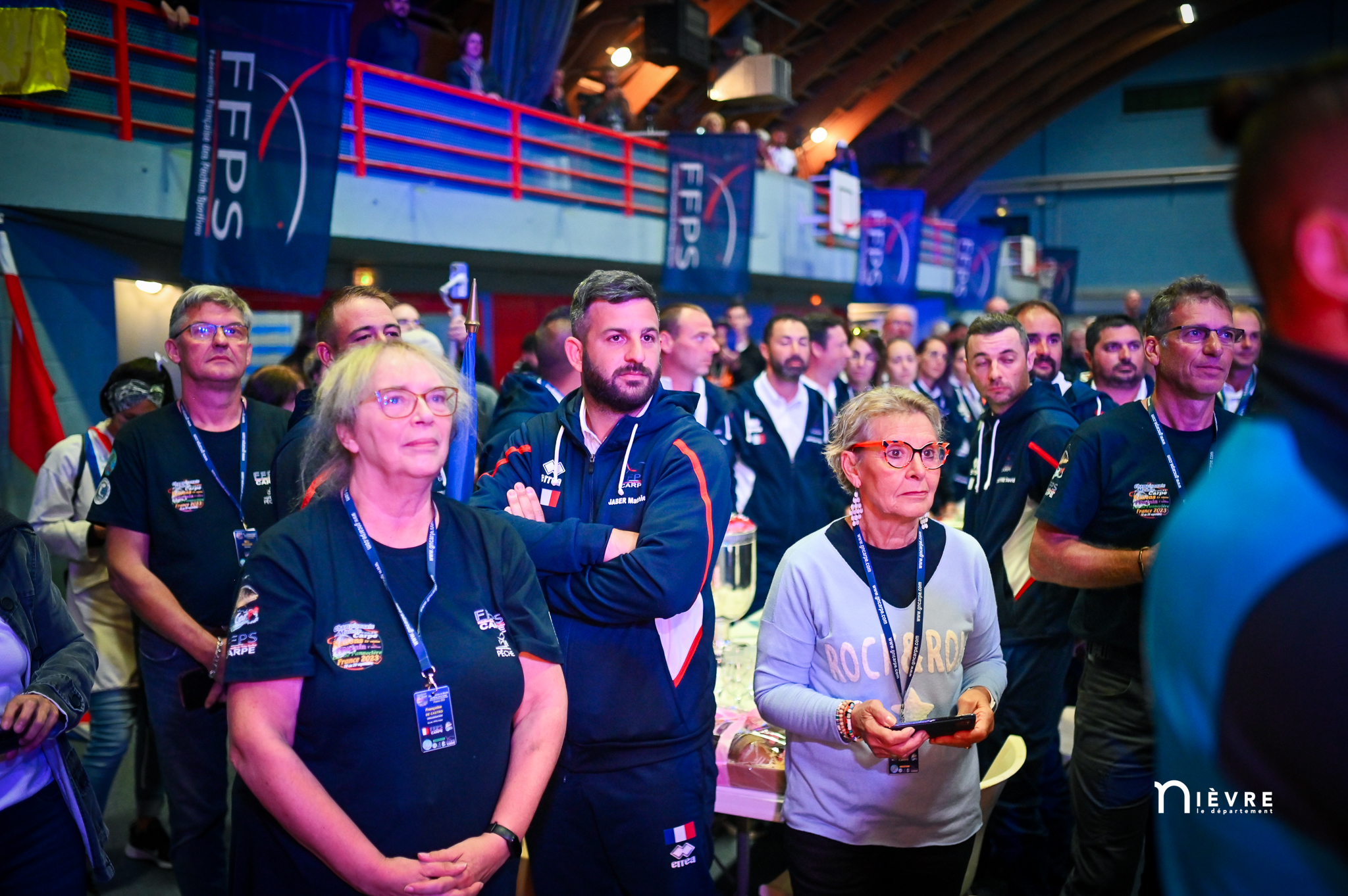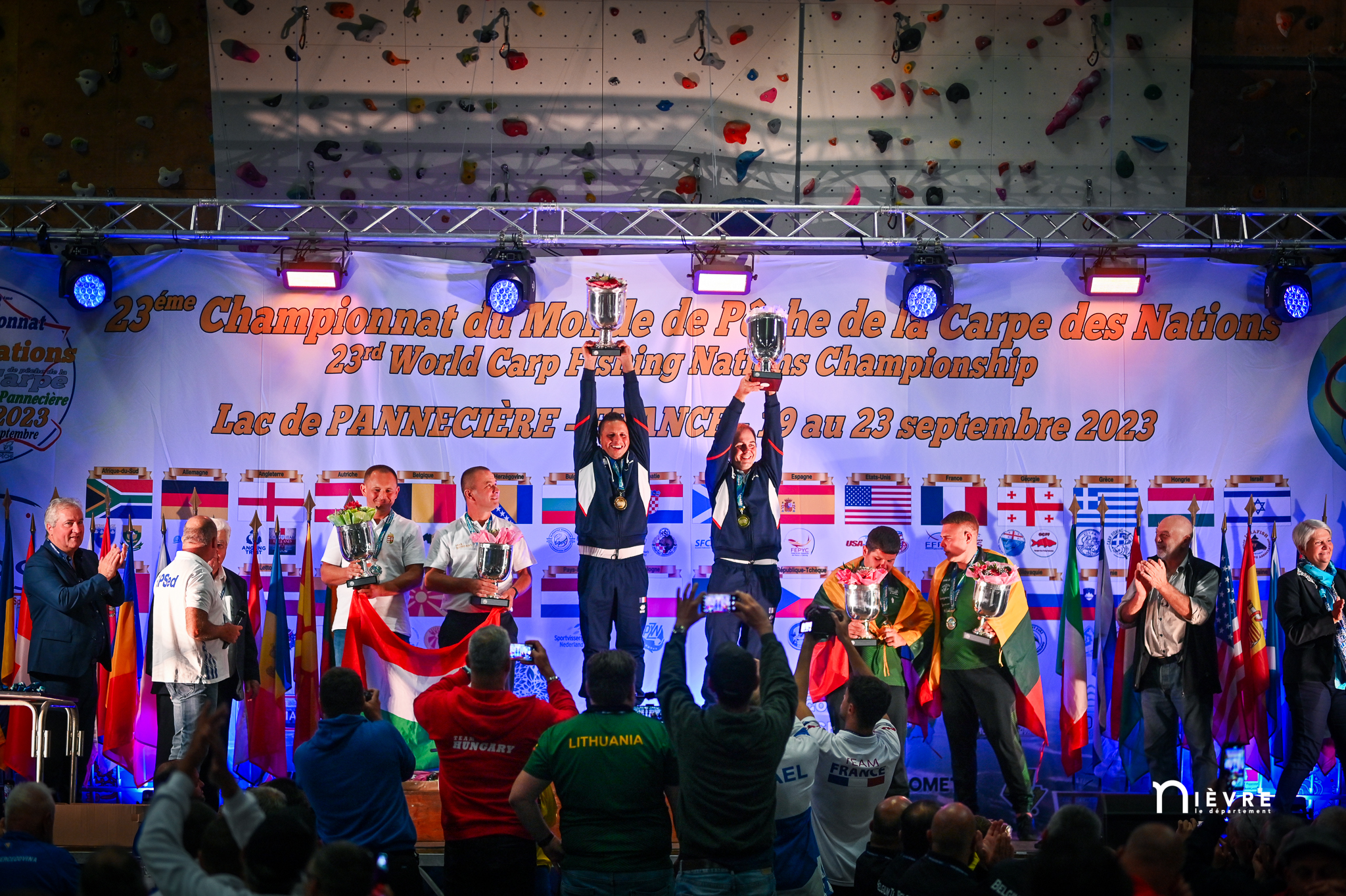 En attendant, tous deux savourent, reçoivent fièrement les félicitations, les tapes amicales et les demandes de selfies des adversaires. Et se lâchent, enfin, sur la plus haute marche du podium, énorme coupe dans une main, un bouquet de fleurs dans l’autre, et s’époumonent sur la Marseillaise. Dans la salle, les 32 délégations, les bénévoles, les officiels et les partenaires sont au coude à coude autour des tables : « On a réuni 32 nations, c’est un record qui sera difficile à battre », souligne Jacques Goupil, président de la Fédération française de pêche sportive. Son vice-président coordinateur de l’organisation, Fernand de Castro, fait applaudir les 150 bénévoles : « Sans vous, on n’aurait rien pu faire. »