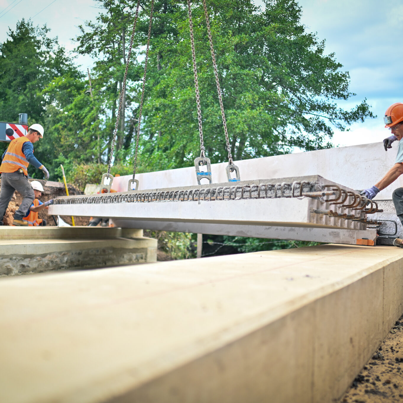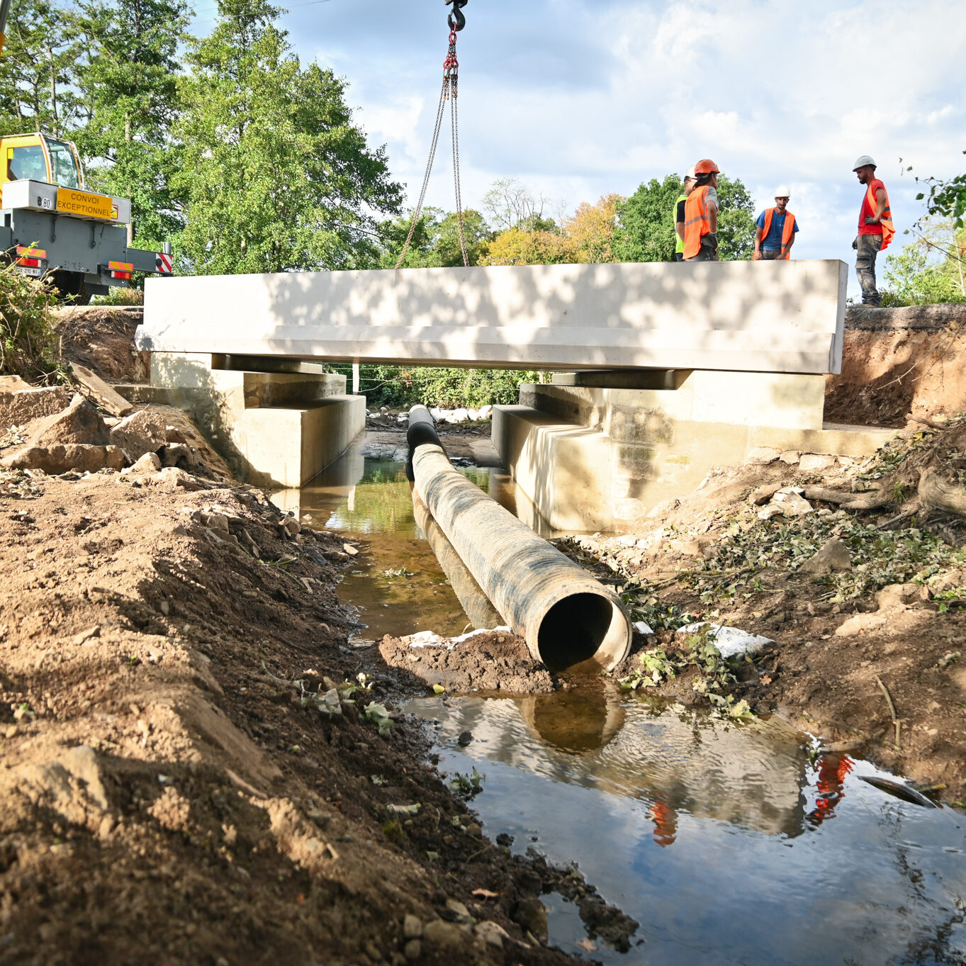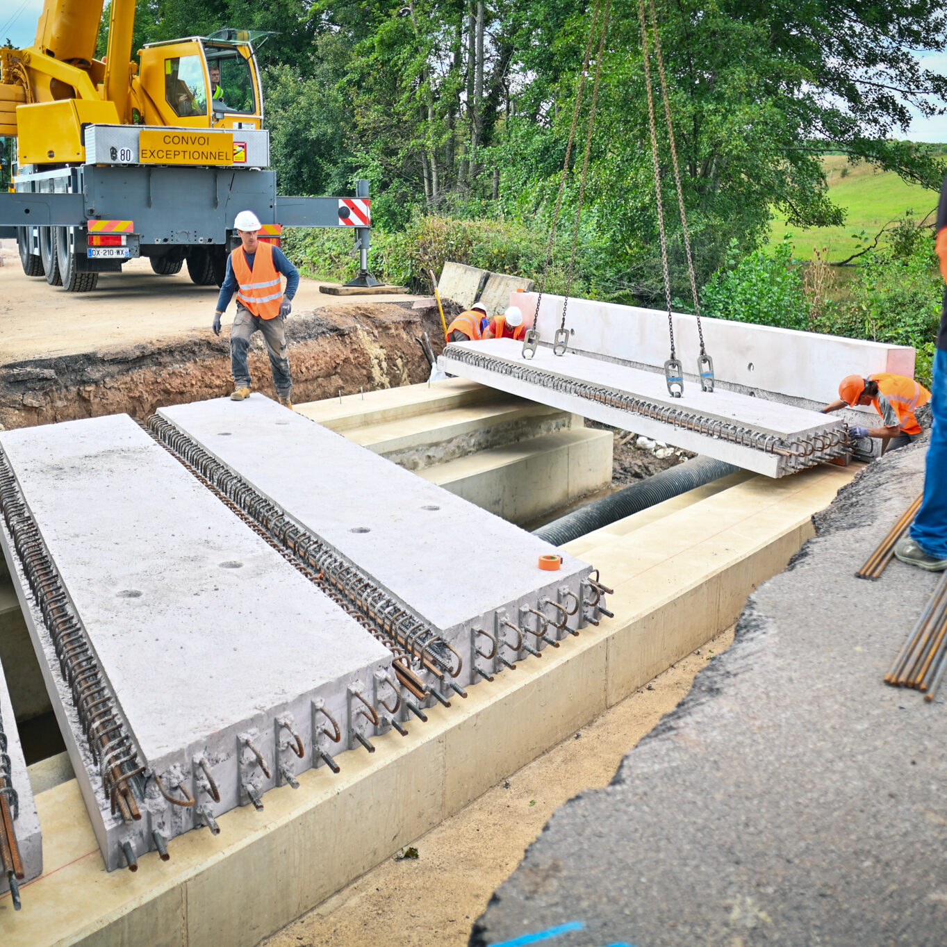 Parallèlement à une surveillance renforcée, à l’affût d’un délabrement accéléré qui aurait nécessité la fermeture de la route, le service Ouvrages d’art du Département s’active pour dessiner le nouveau pont et en définir la structure, en coopération avec l’entreprise Thivent. Dans ses ateliers de Saône-et-Loire, la société de travaux publics a fabriqué les éléments en béton armé, dont la pose a nécessité l’intervention d’une imposante grue, et la coupure du courant sur la ligne bordant la chaussée, le 21 septembre. Le pont a été doté d’une banquette à loutres, un aménagement qui évite à ces animaux – et à d’autres – de (tré)passer sur la chaussée.