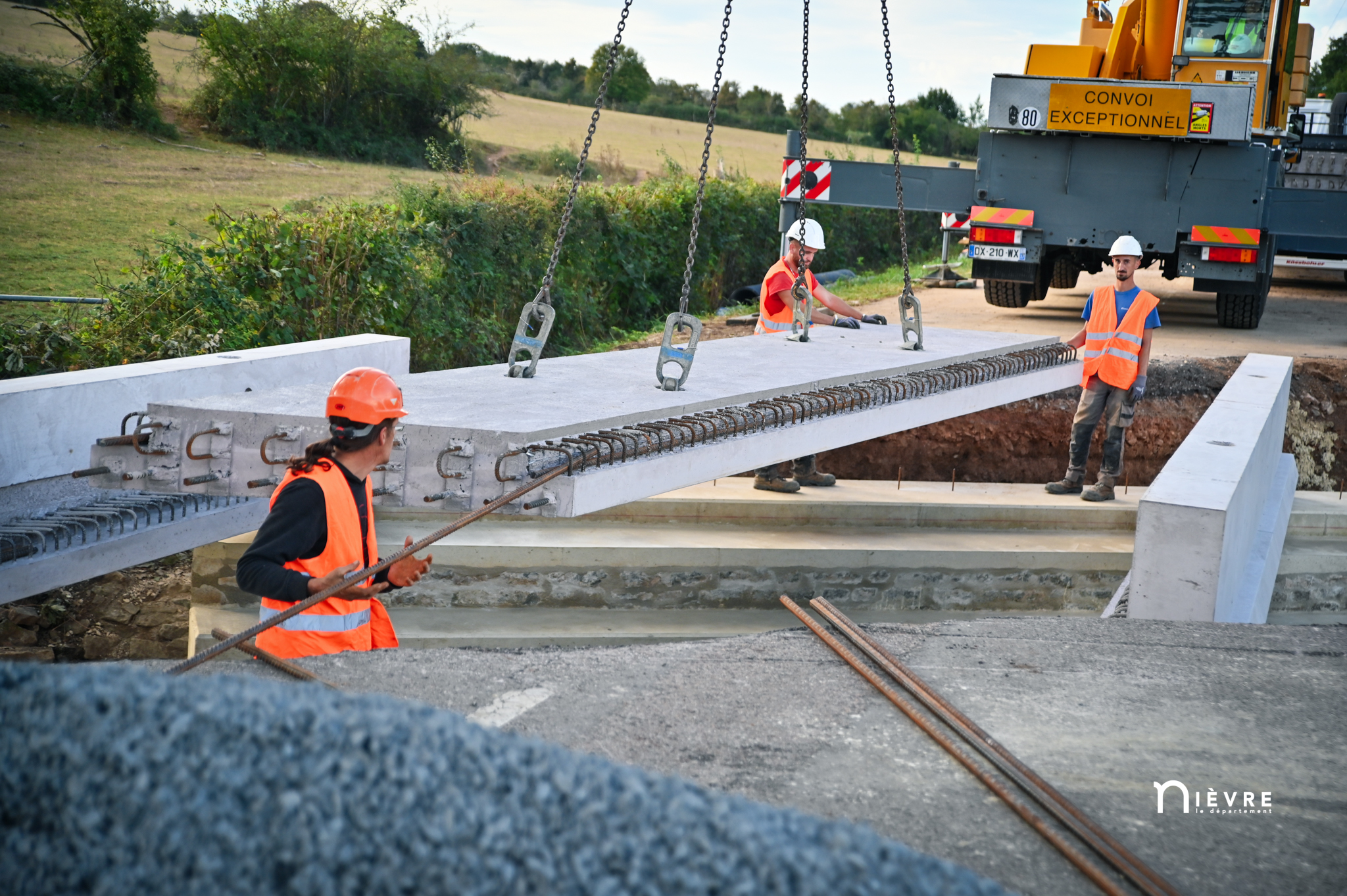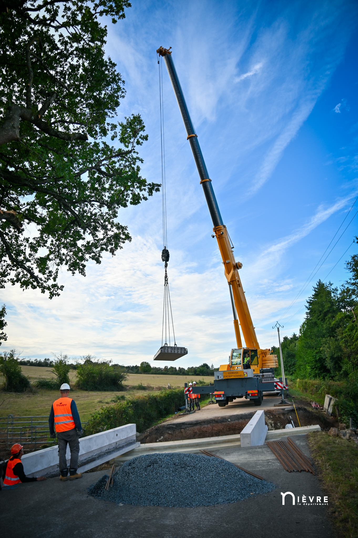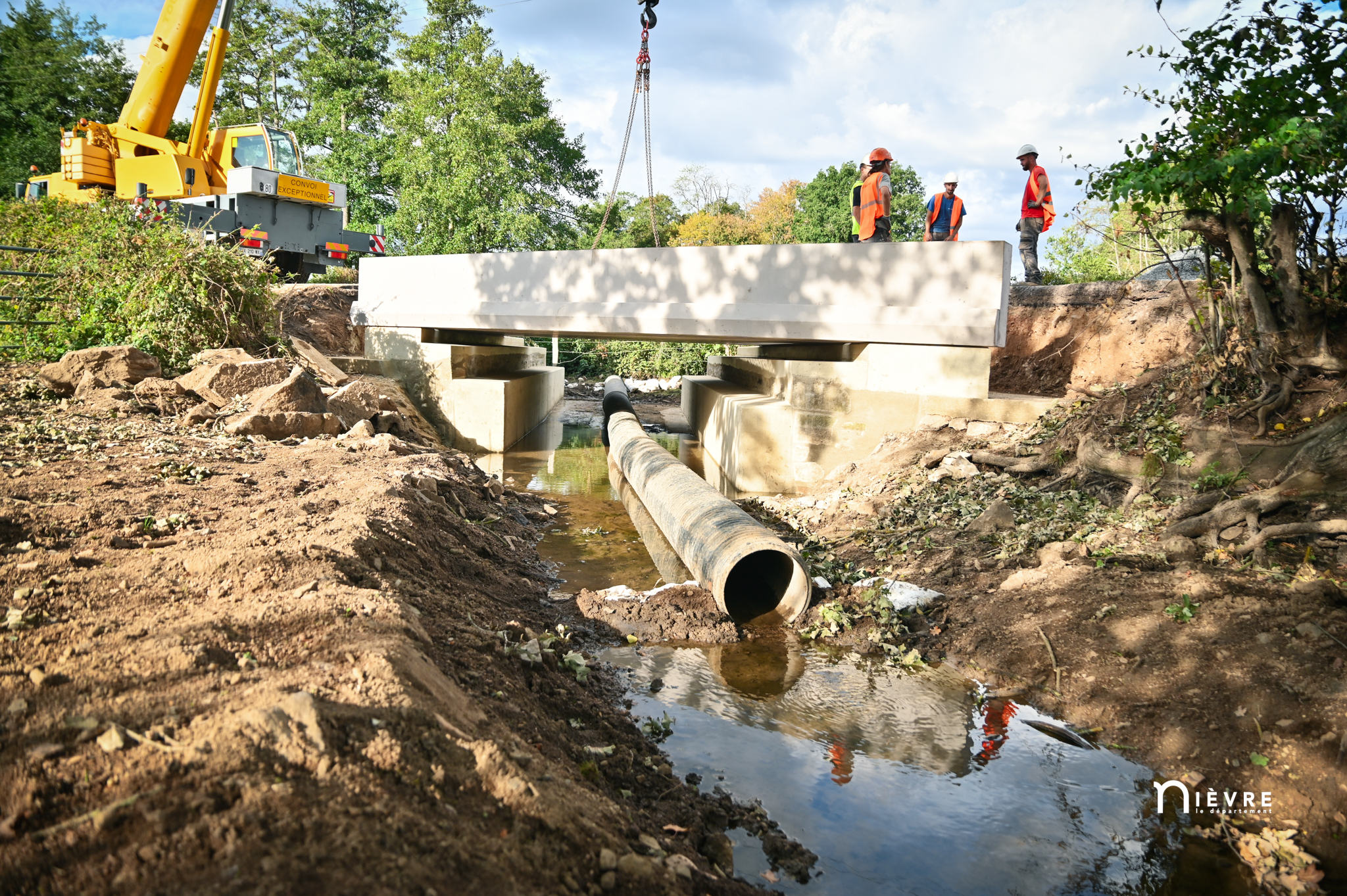 Parallèlement à une surveillance renforcée, à l’affût d’un délabrement accéléré qui aurait nécessité la fermeture de la route, le service Ouvrages d’art du Département s’active pour dessiner le nouveau pont et en définir la structure, en coopération avec l’entreprise Thivent. Dans ses ateliers de Saône-et-Loire, la société de travaux publics a fabriqué les éléments en béton armé, dont la pose a nécessité l’intervention d’une imposante grue, et la coupure du courant sur la ligne bordant la chaussée, le 21 septembre. Le pont a été doté d’une banquette à loutres, un aménagement qui évite à ces animaux – et à d’autres – de (tré)passer sur la chaussée.
