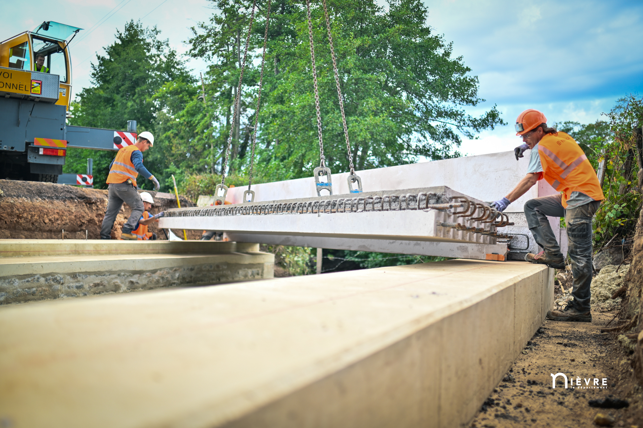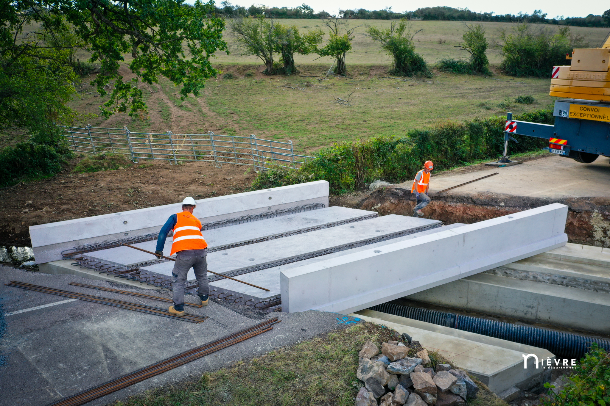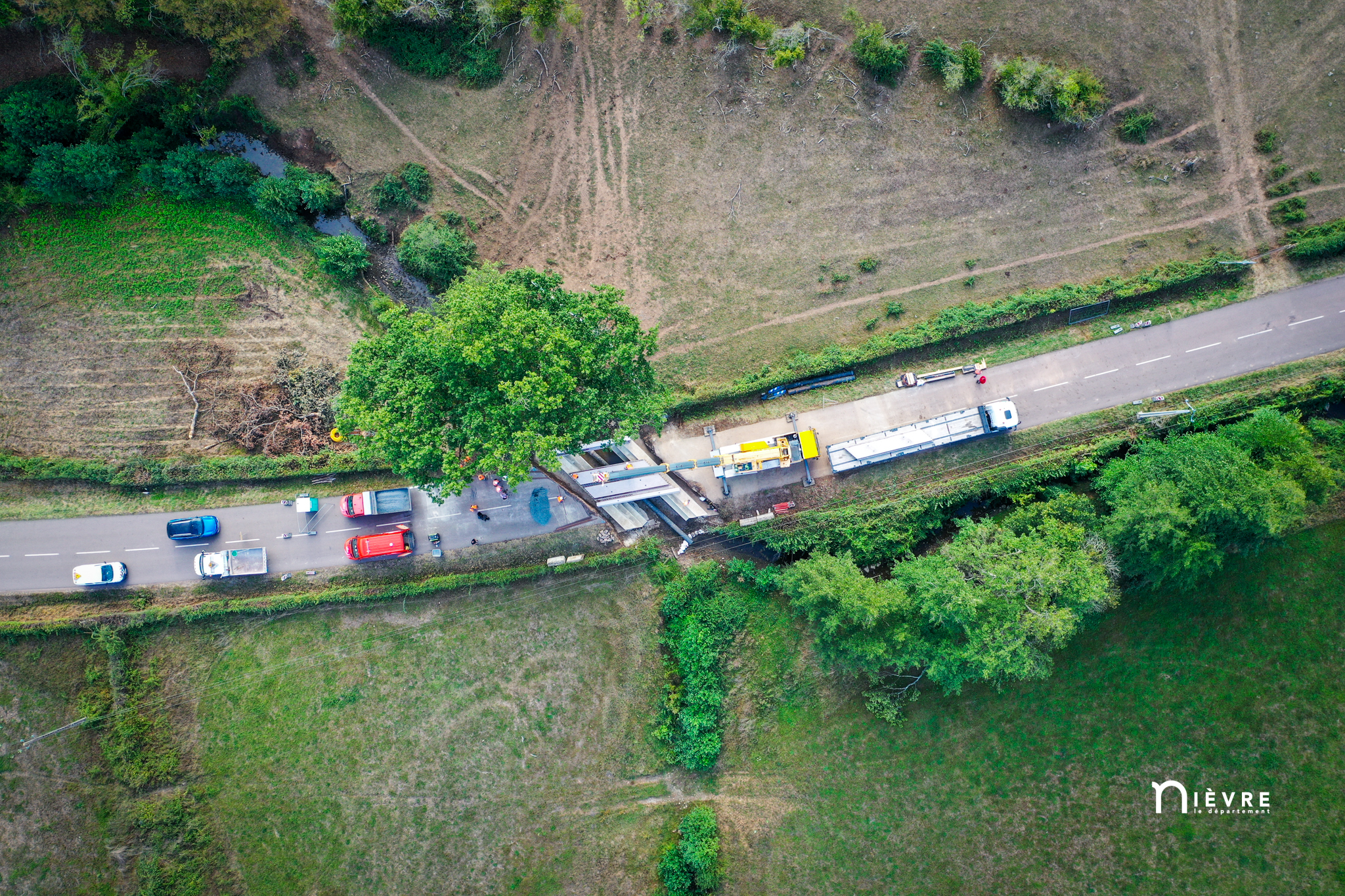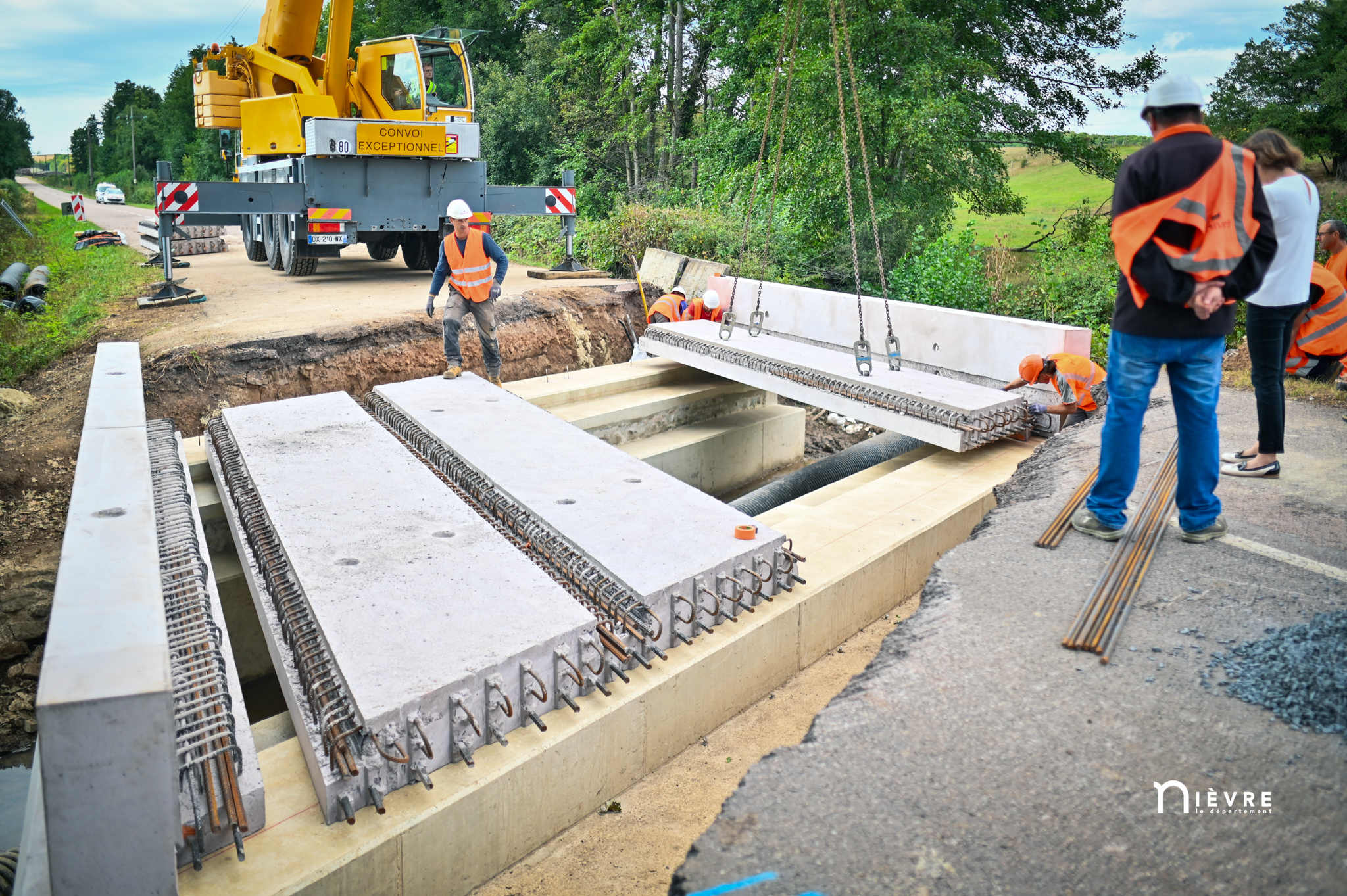 Parallèlement à une surveillance renforcée, à l’affût d’un délabrement accéléré qui aurait nécessité la fermeture de la route, le service Ouvrages d’art du Département s’active pour dessiner le nouveau pont et en définir la structure, en coopération avec l’entreprise Thivent. Dans ses ateliers de Saône-et-Loire, la société de travaux publics a fabriqué les éléments en béton armé, dont la pose a nécessité l’intervention d’une imposante grue, et la coupure du courant sur la ligne bordant la chaussée, le 21 septembre. Le pont a été doté d’une banquette à loutres, un aménagement qui évite à ces animaux – et à d’autres – de (tré)passer sur la chaussée.