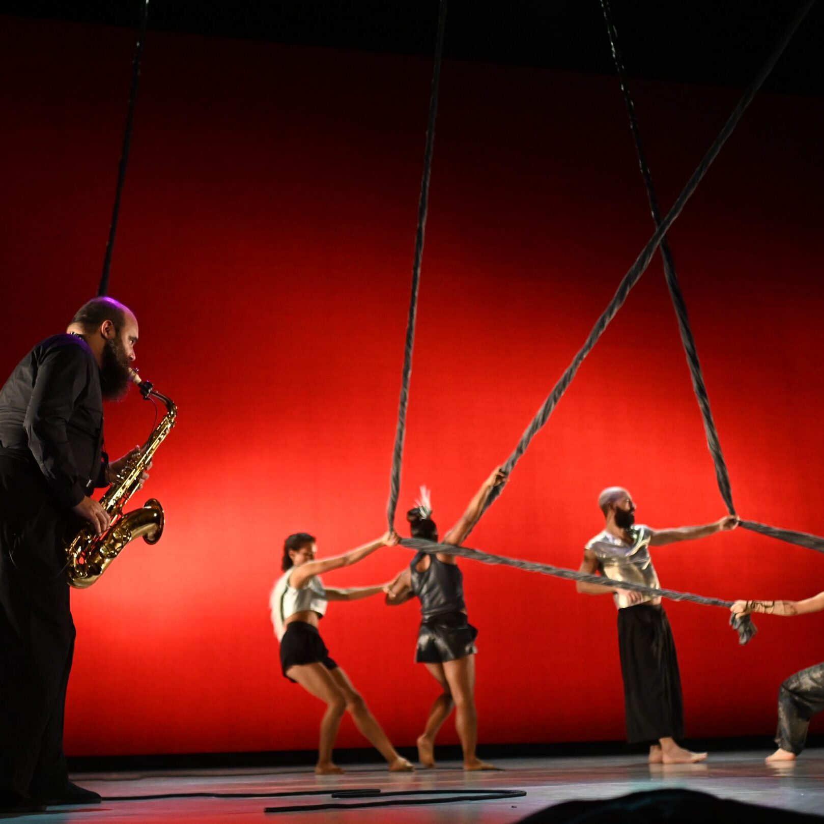 Tout commence dans la pénombre, le souffle émis par le saxophone est à peine audible, comme un battement de cœur, il donne le tempo aux danseurs qui évoluent lentement. Puis l’impulsion s’accélère, les danseurs se réveillent et la lumière se révèle. Un impressionnant ballet virevoltant se met en place. Les entrechoquements et les entremêlements des danseurs répondent au saxophone de Raphaël Imbert et aux arrangements de Benjamin Lévy, en partie improvisés.