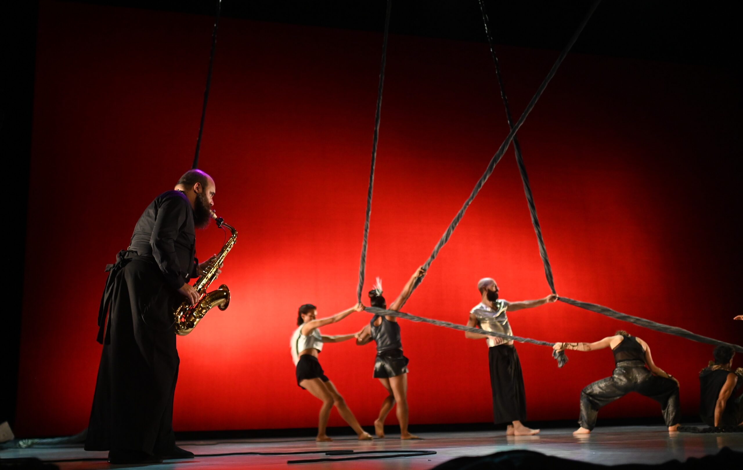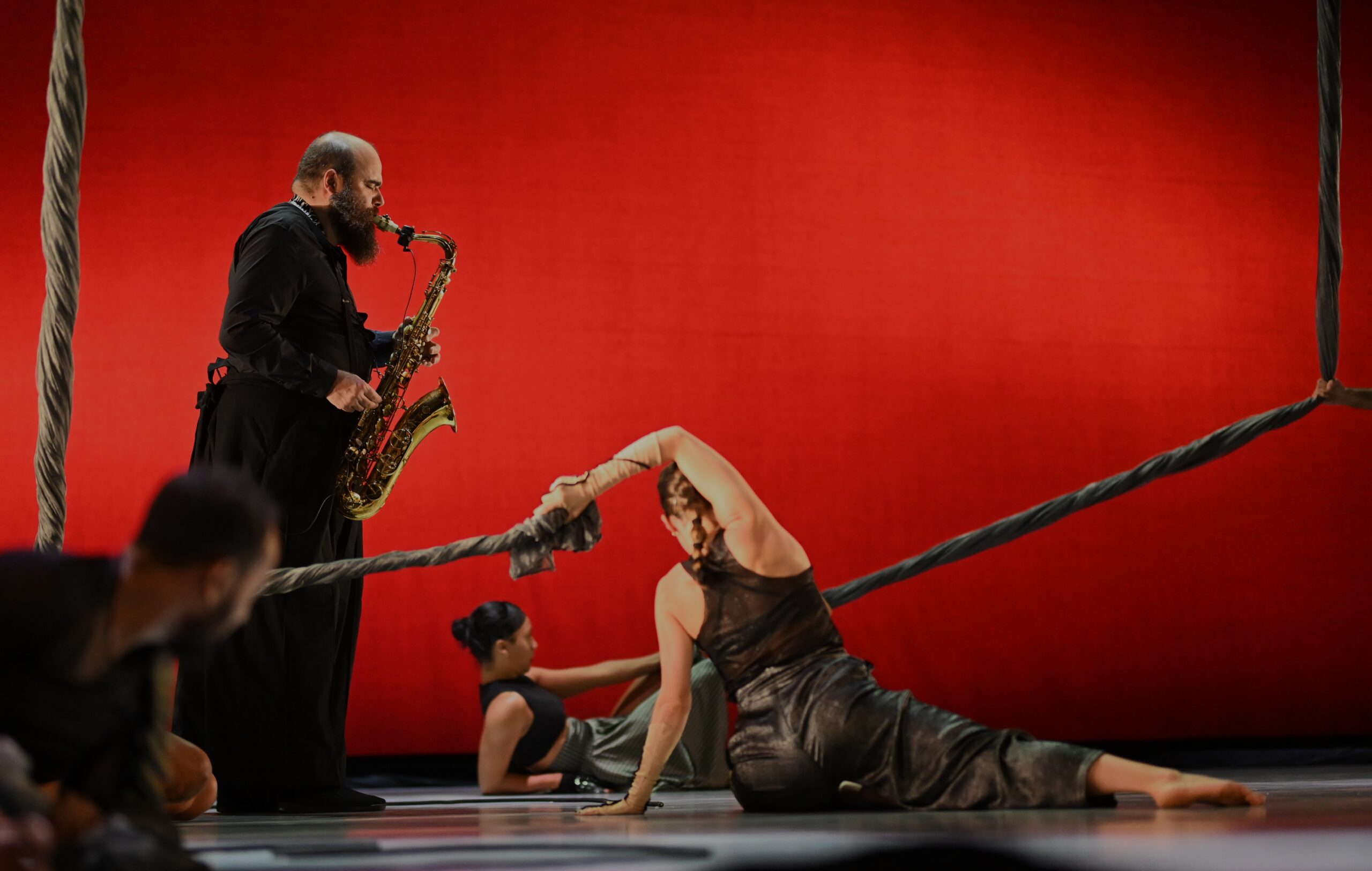 Tout commence dans la pénombre, le souffle émis par le saxophone est à peine audible, comme un battement de cœur, il donne le tempo aux danseurs qui évoluent lentement. Puis l’impulsion s’accélère, les danseurs se réveillent et la lumière se révèle. Un impressionnant ballet virevoltant se met en place. Les entrechoquements et les entremêlements des danseurs répondent au saxophone de Raphaël Imbert et aux arrangements de Benjamin Lévy, en partie improvisés.