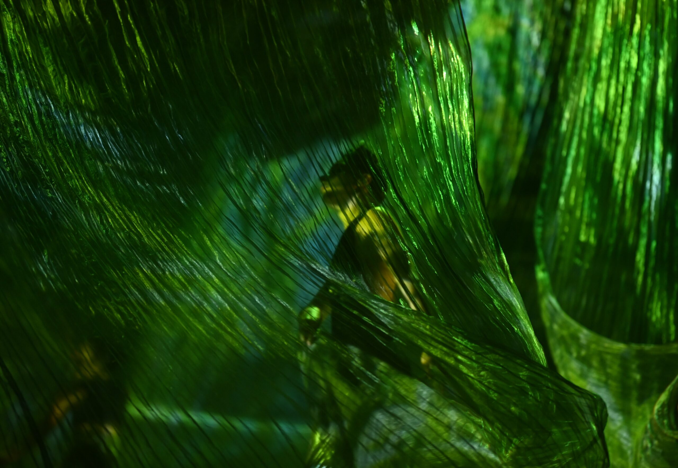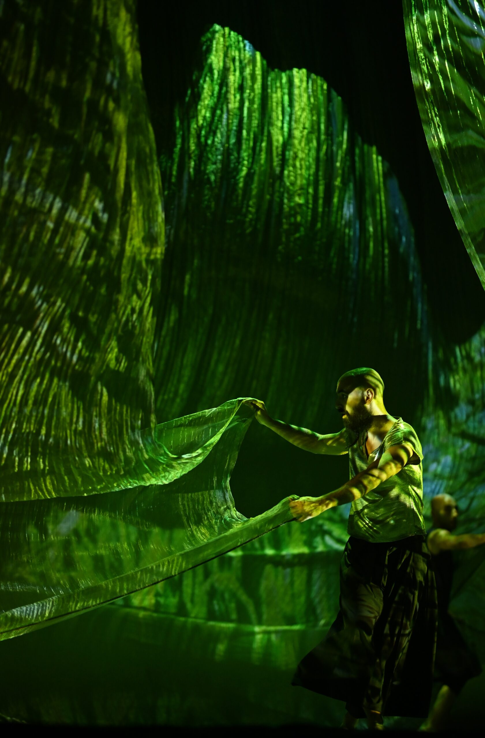 De grands voiles translucides, mais suffisant opaques, servent d’écran où des images d’une nature luxuriante sont projetées. Les effets de lumières sur les voiles donnent à l’ensemble un effet de scintillement. Les émotions ressenties se contredisent ; tantôt inaccessible, tantôt d’une grande lucidité, le spectacle reste néanmoins, pour les néophytes ou pour les experts, un moment touchant et émouvant rempli de mystère.