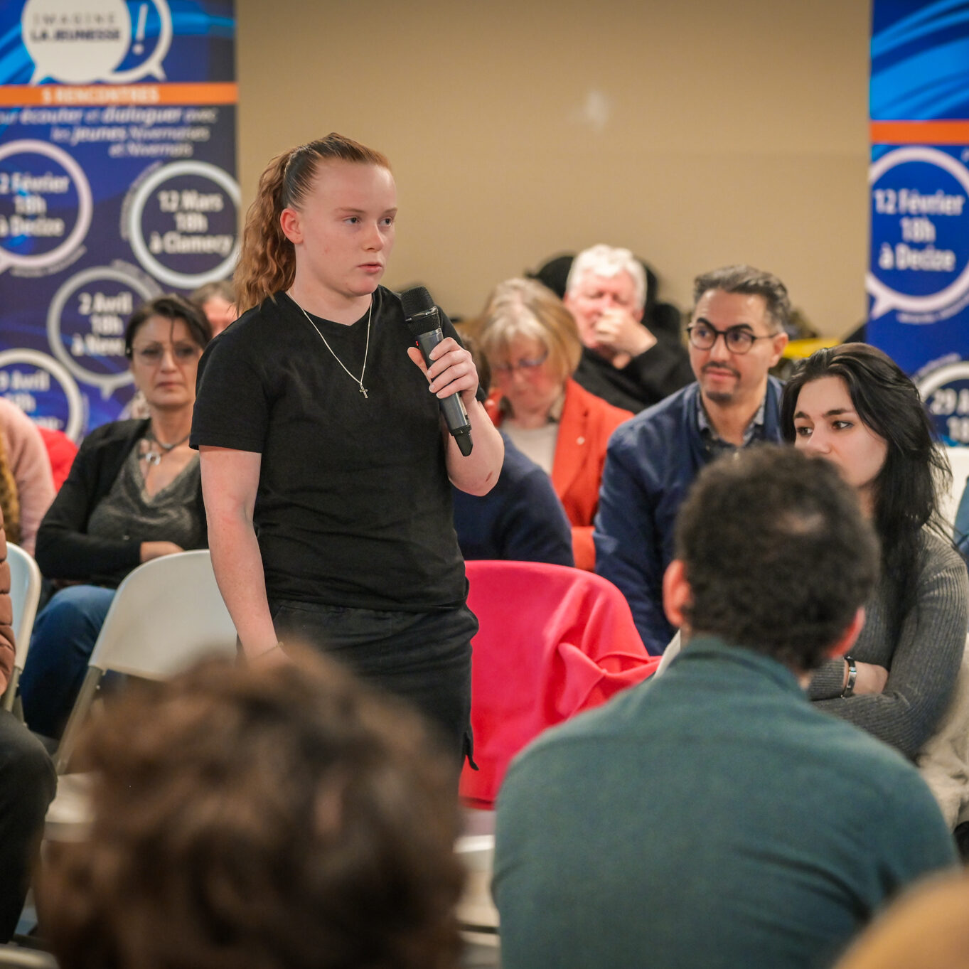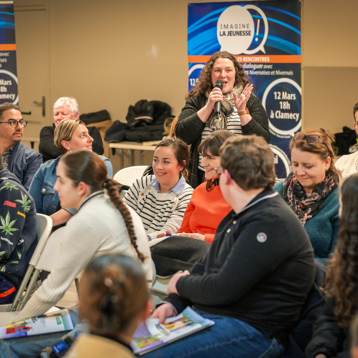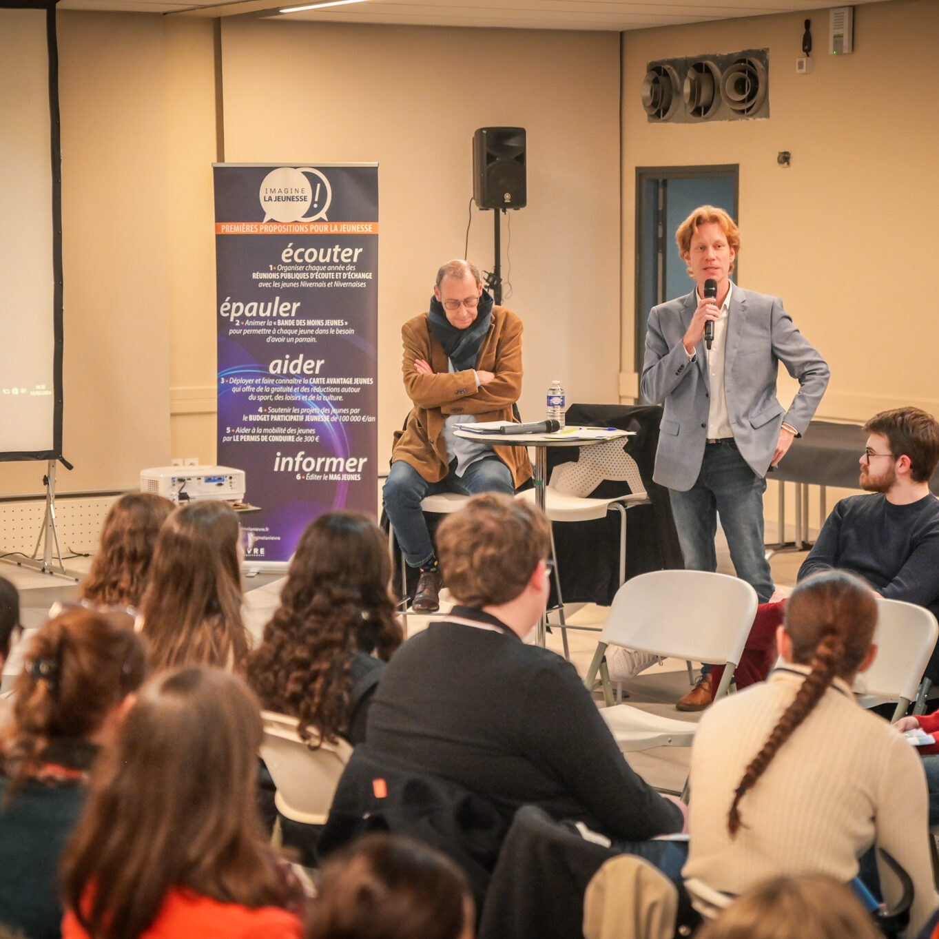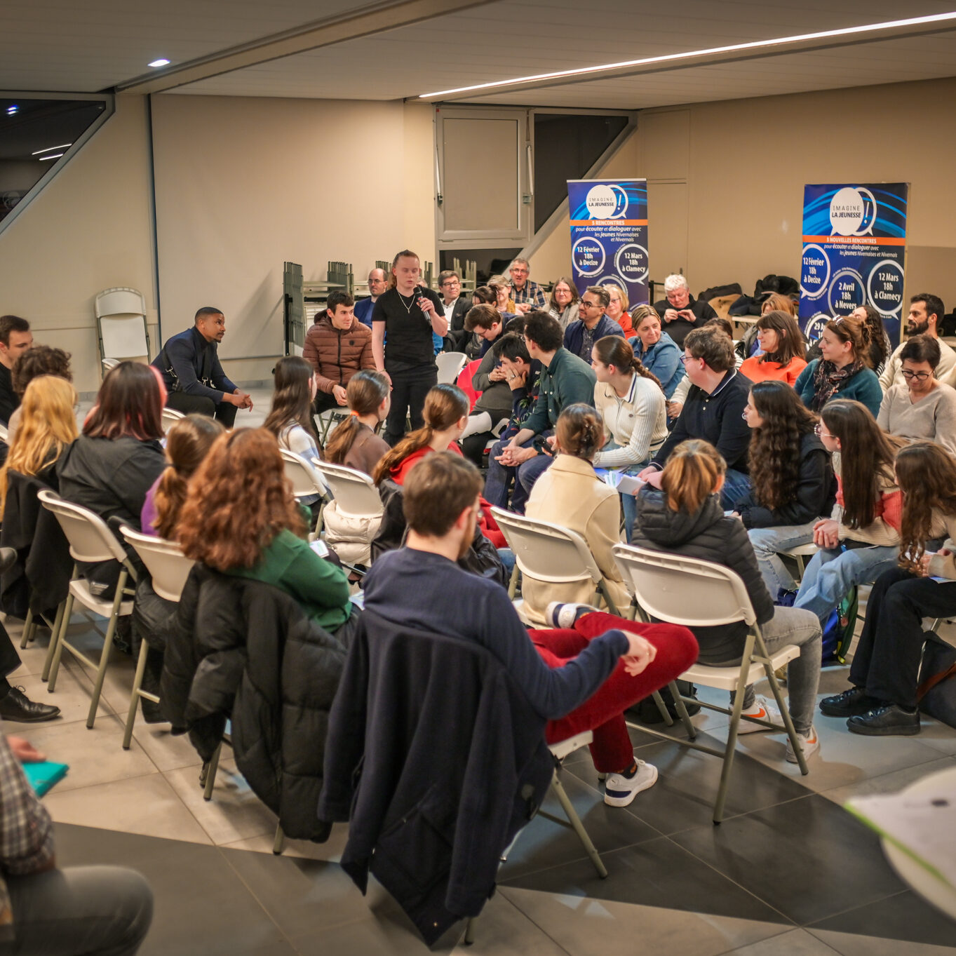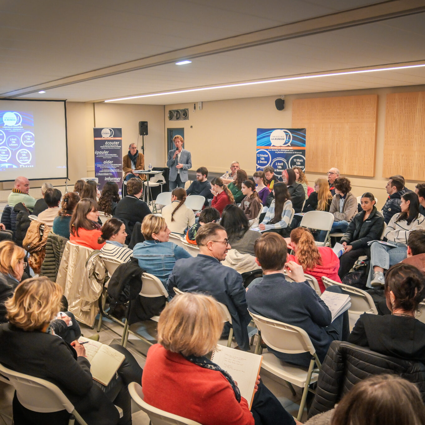 « Une salle qui est remplie de jeunes, c’est assez rare pour être souligné », souligne en préambule Justine Guyot, maire de Decize et vice-présidente du Conseil départemental, qui lève les timidités de l’auditoire en témoignant de son parcours : « J’ai eu mon premier mandat électif à 26 ans, ça prouve qu’il faut croire en la force de sa jeunesse. À Decize, on est très attachés à ces échanges citoyens, au contact direct avec les habitants. On ne peut plus penser les politiques publiques autrement qu’avec les jeunes, et pour les jeunes. »