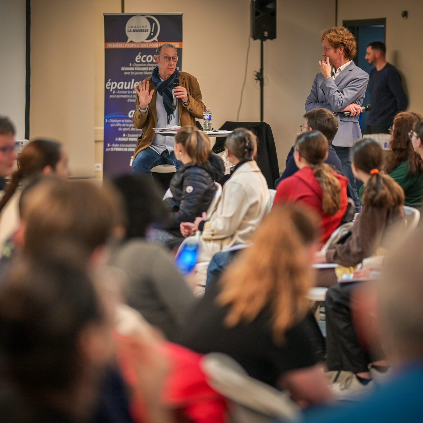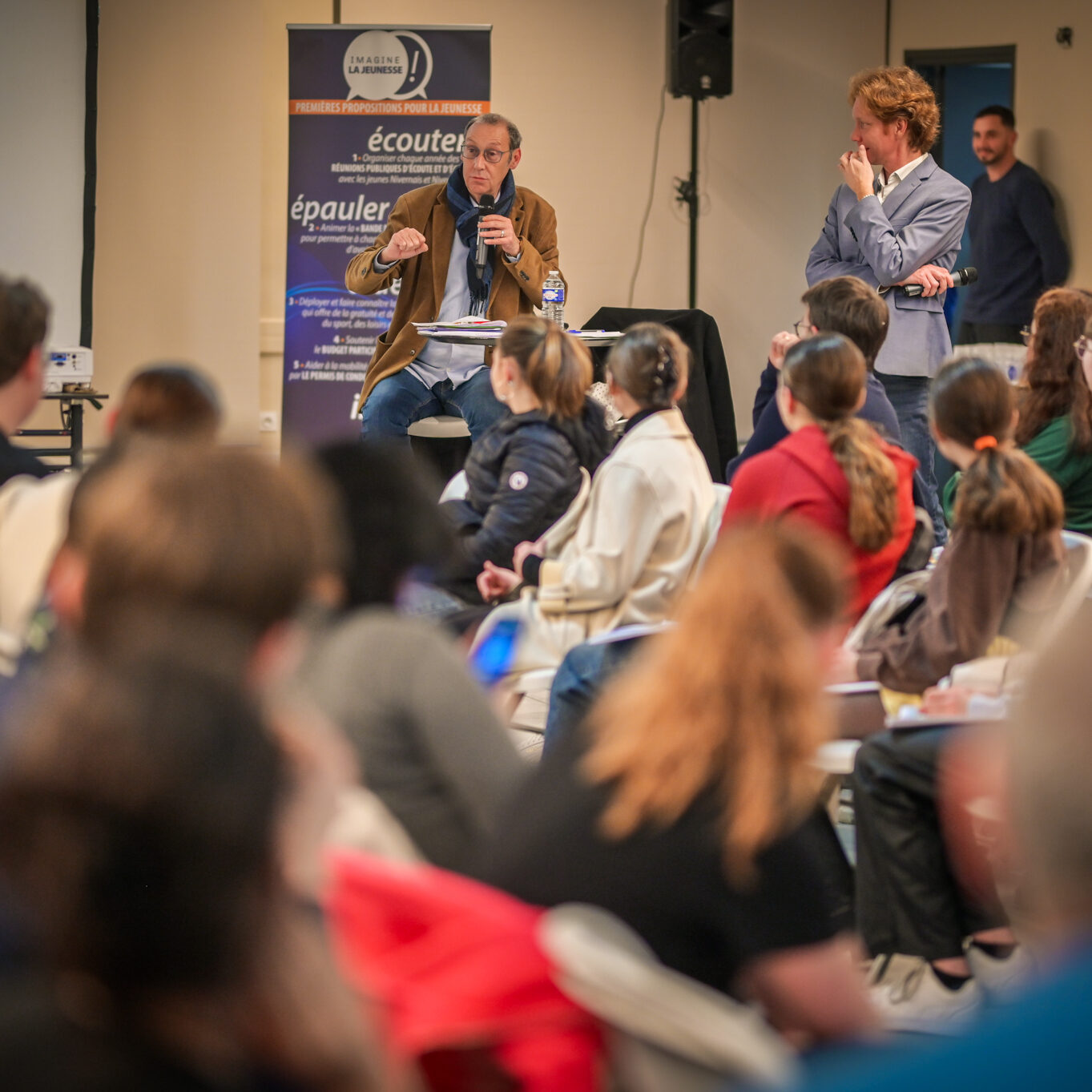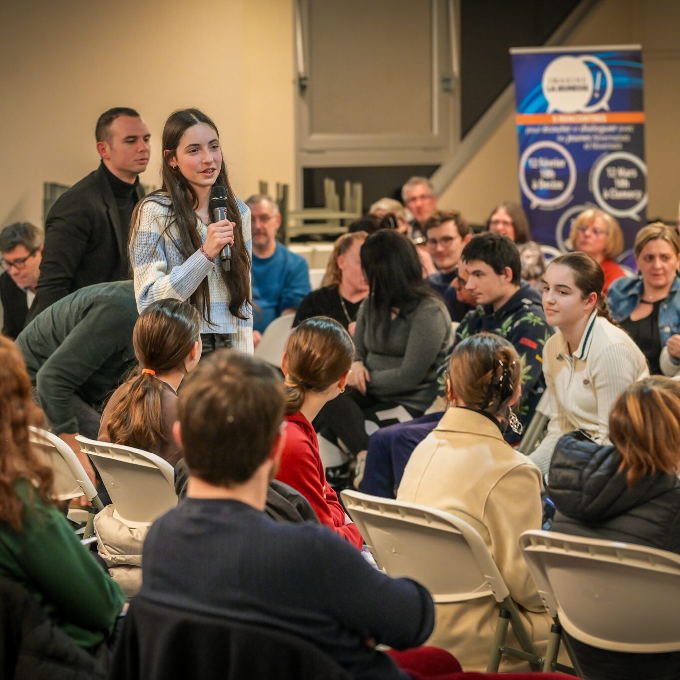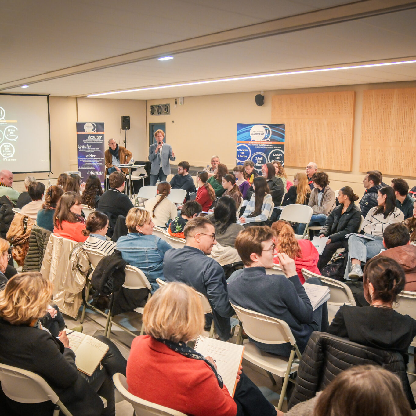 « Une salle qui est remplie de jeunes, c’est assez rare pour être souligné », souligne en préambule Justine Guyot, maire de Decize et vice-présidente du Conseil départemental, qui lève les timidités de l’auditoire en témoignant de son parcours : « J’ai eu mon premier mandat électif à 26 ans, ça prouve qu’il faut croire en la force de sa jeunesse. À Decize, on est très attachés à ces échanges citoyens, au contact direct avec les habitants. On ne peut plus penser les politiques publiques autrement qu’avec les jeunes, et pour les jeunes. »