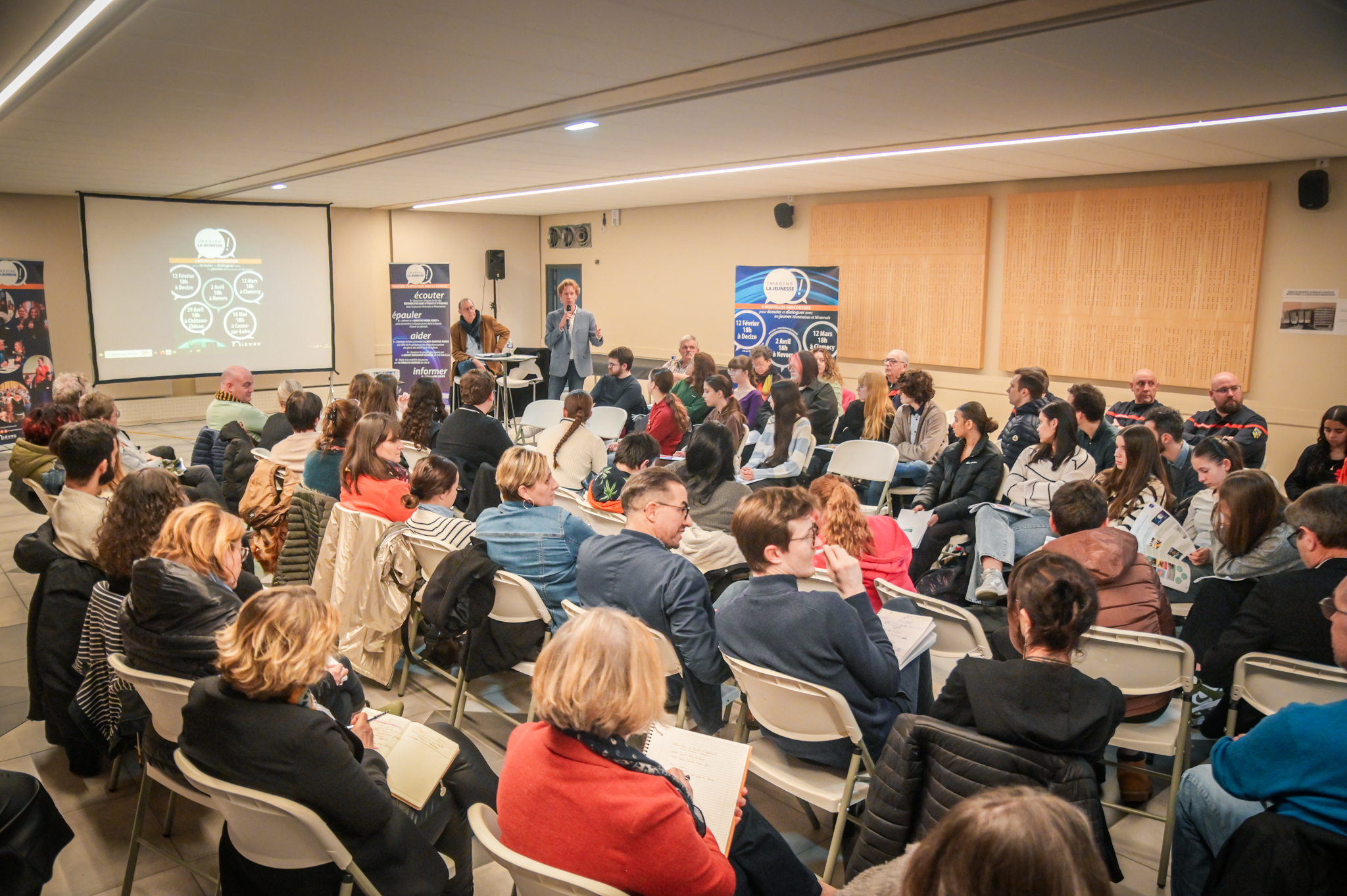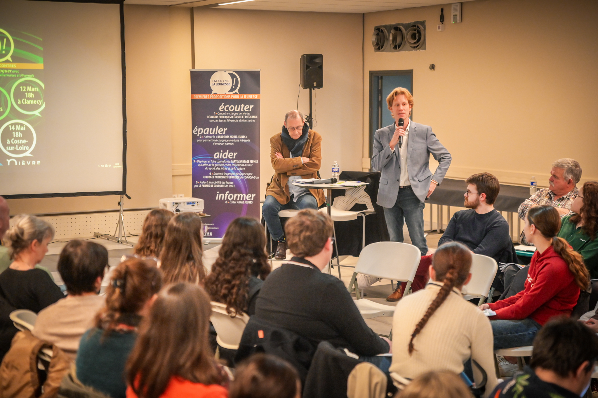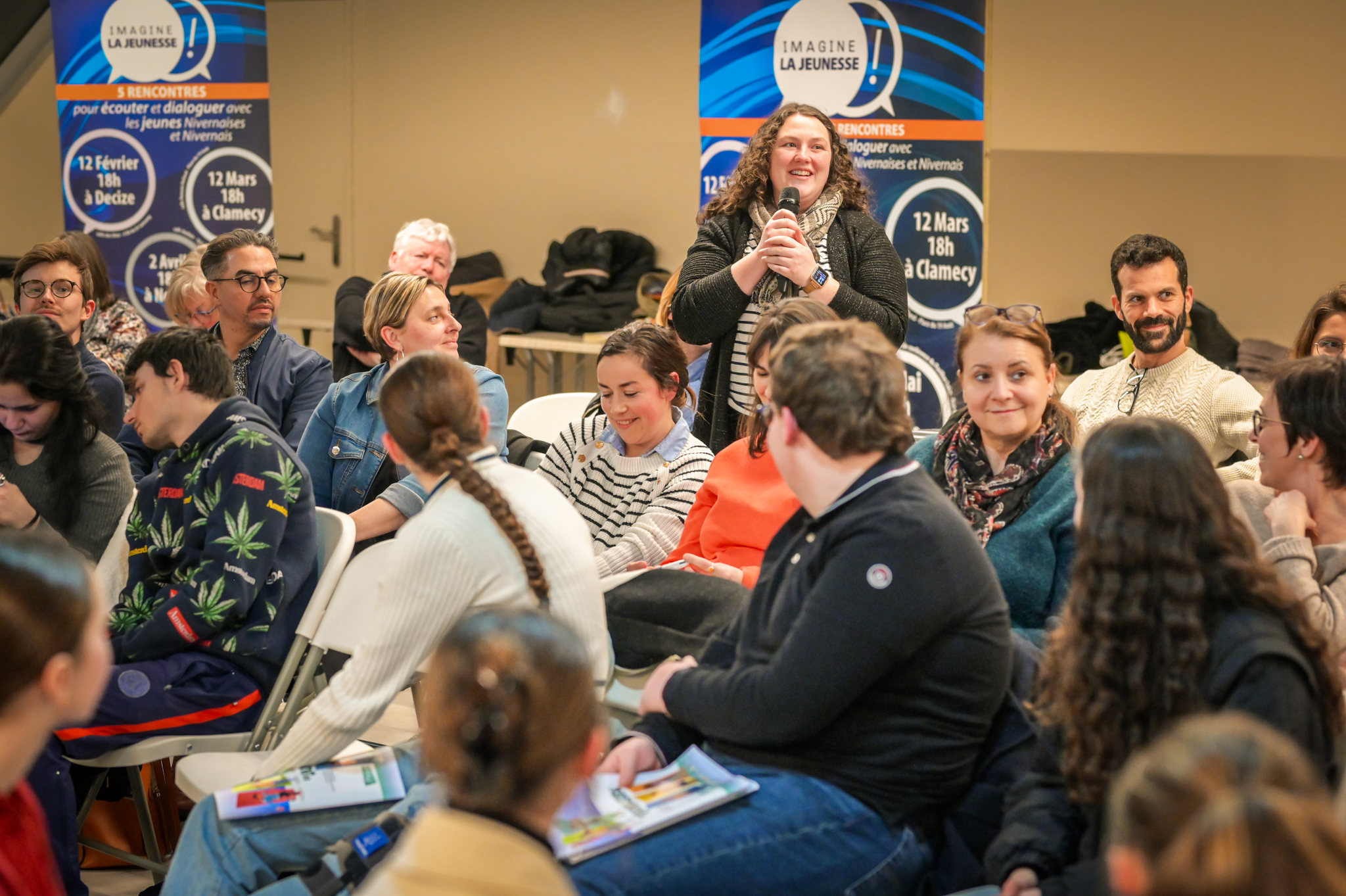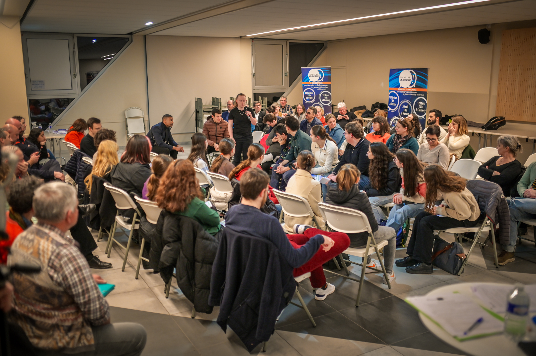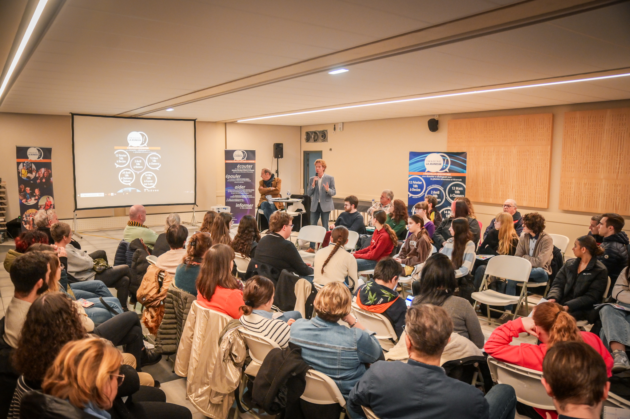 « Une salle qui est remplie de jeunes, c’est assez rare pour être souligné », souligne en préambule Justine Guyot, maire de Decize et vice-présidente du Conseil départemental, qui lève les timidités de l’auditoire en témoignant de son parcours : « J’ai eu mon premier mandat électif à 26 ans, ça prouve qu’il faut croire en la force de sa jeunesse. À Decize, on est très attachés à ces échanges citoyens, au contact direct avec les habitants. On ne peut plus penser les politiques publiques autrement qu’avec les jeunes, et pour les jeunes. »