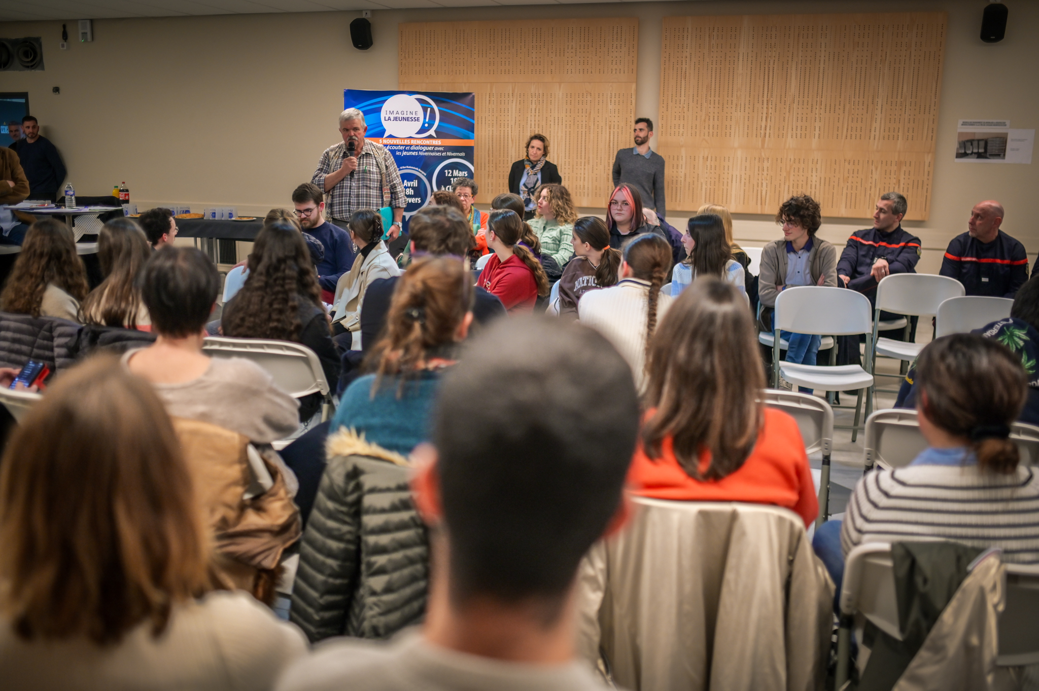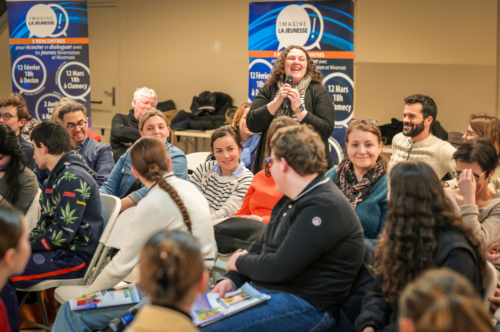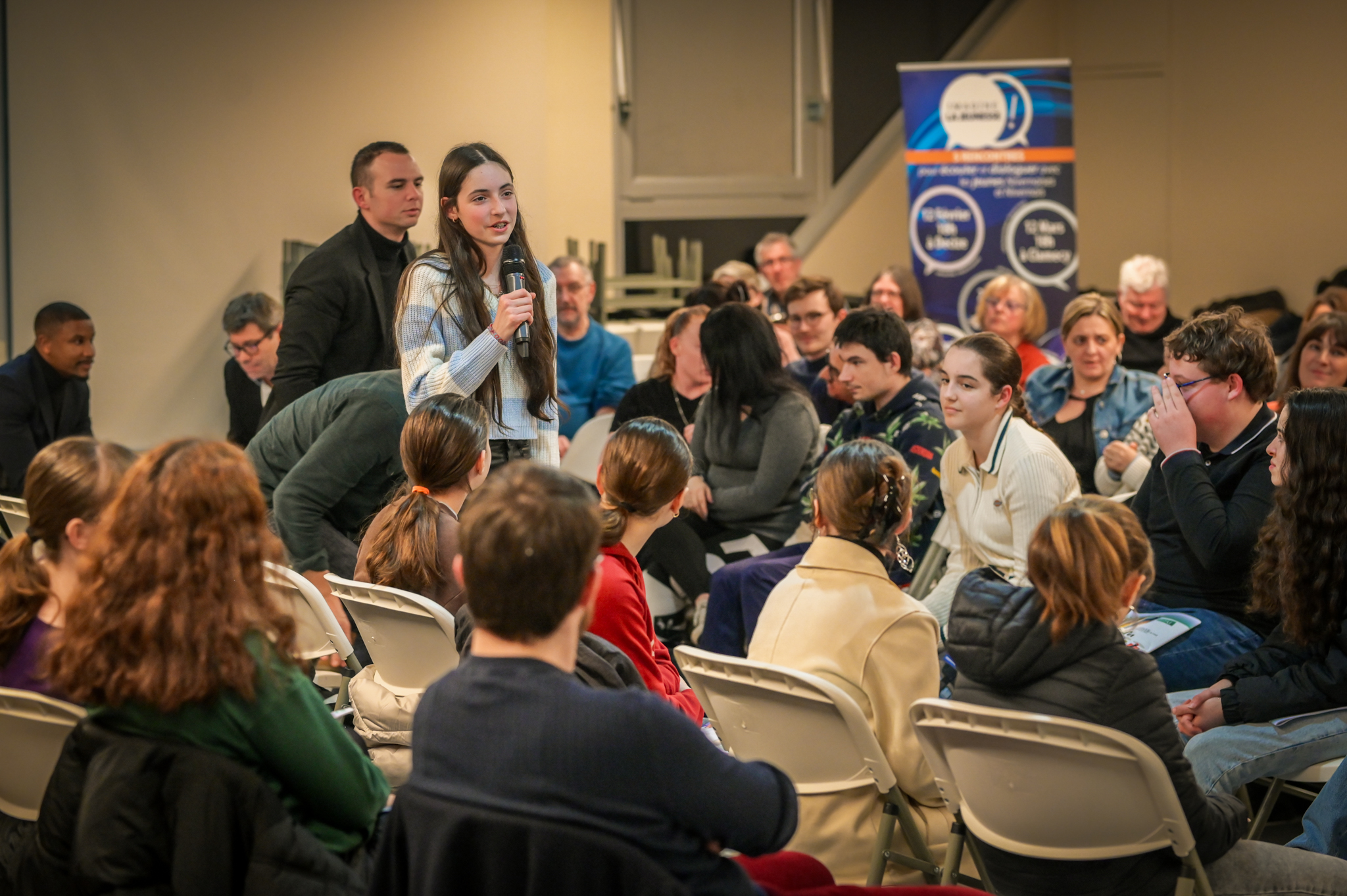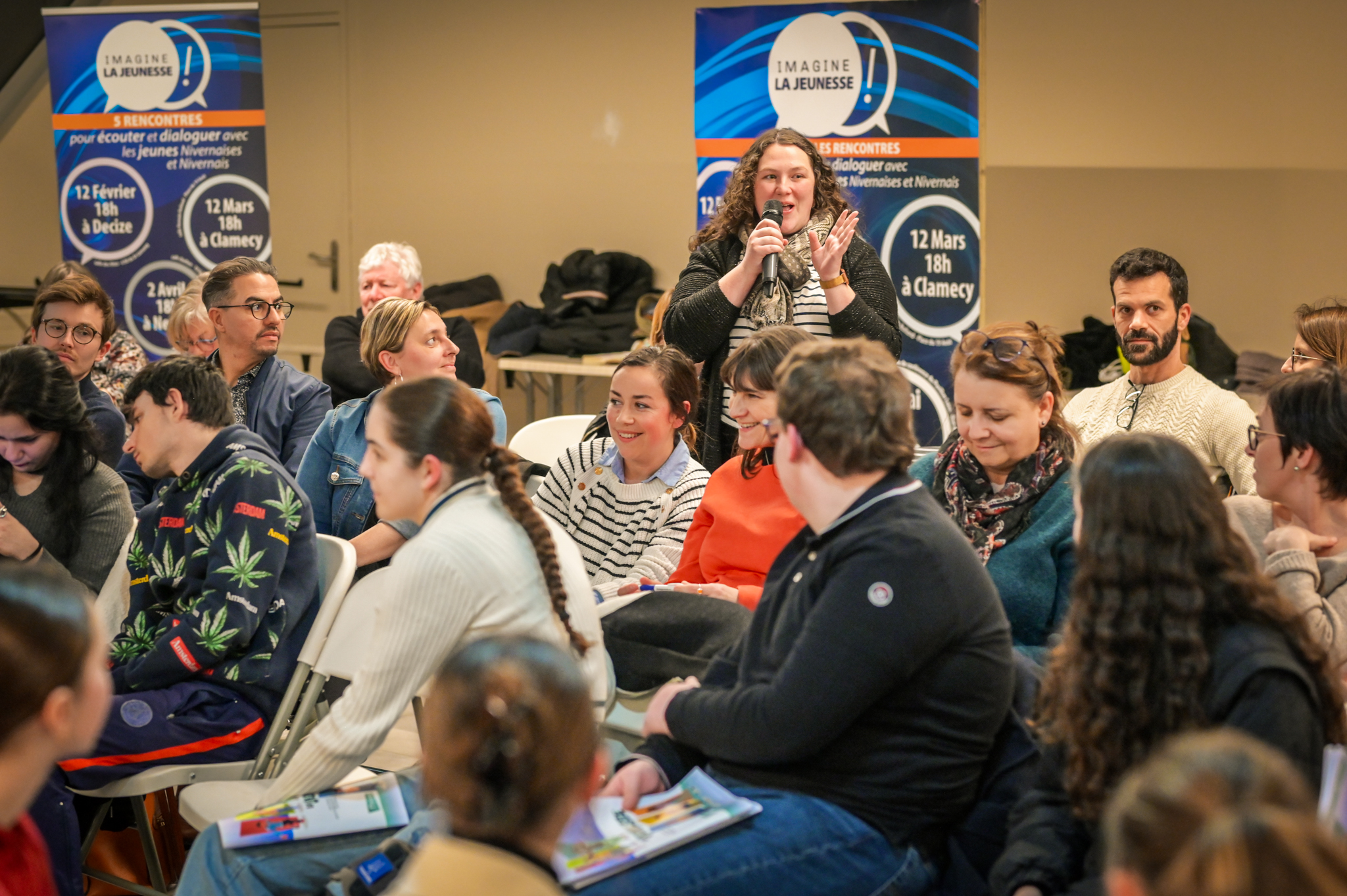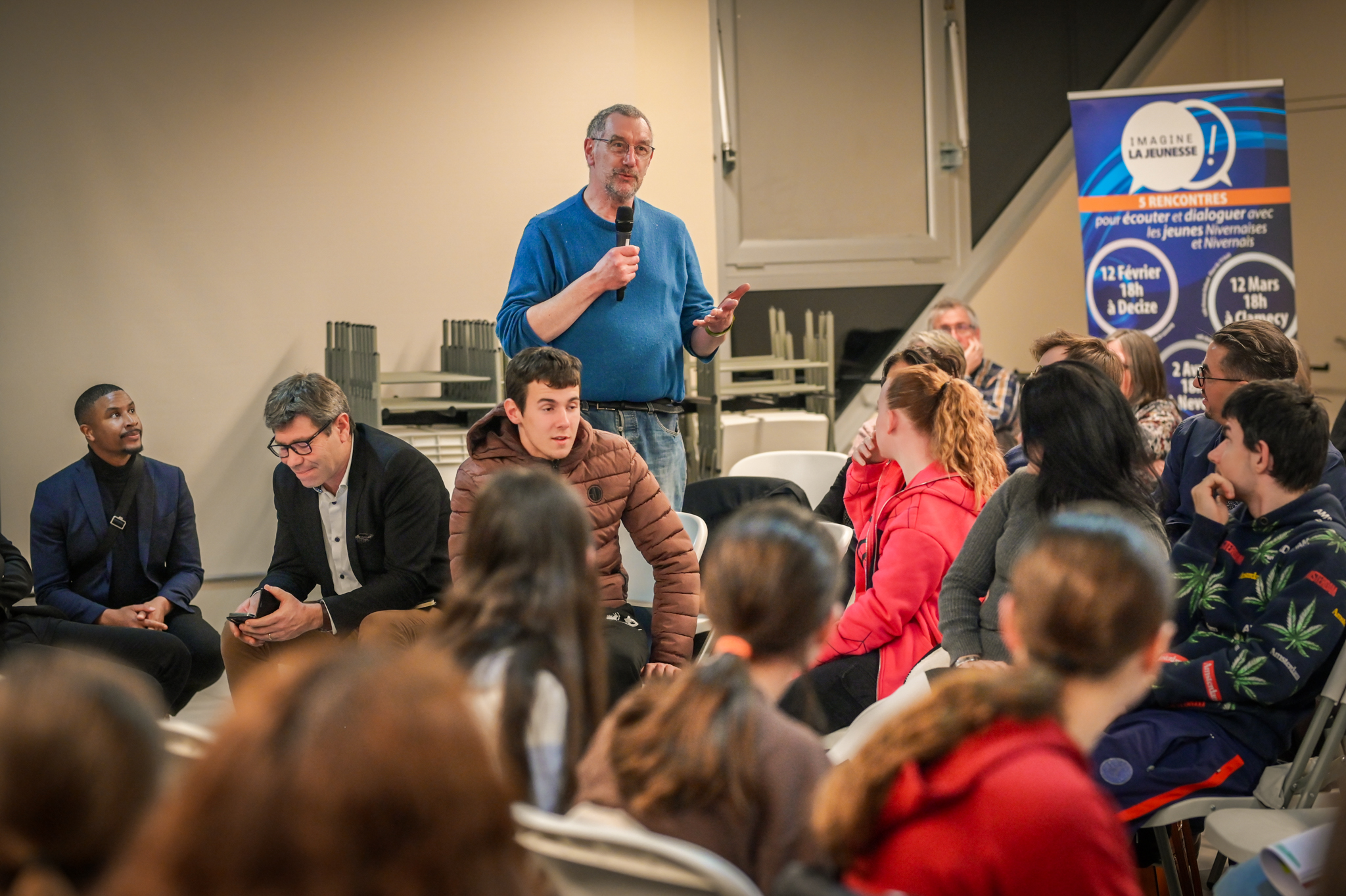 « Une salle qui est remplie de jeunes, c’est assez rare pour être souligné », souligne en préambule Justine Guyot, maire de Decize et vice-présidente du Conseil départemental, qui lève les timidités de l’auditoire en témoignant de son parcours : « J’ai eu mon premier mandat électif à 26 ans, ça prouve qu’il faut croire en la force de sa jeunesse. À Decize, on est très attachés à ces échanges citoyens, au contact direct avec les habitants. On ne peut plus penser les politiques publiques autrement qu’avec les jeunes, et pour les jeunes. »