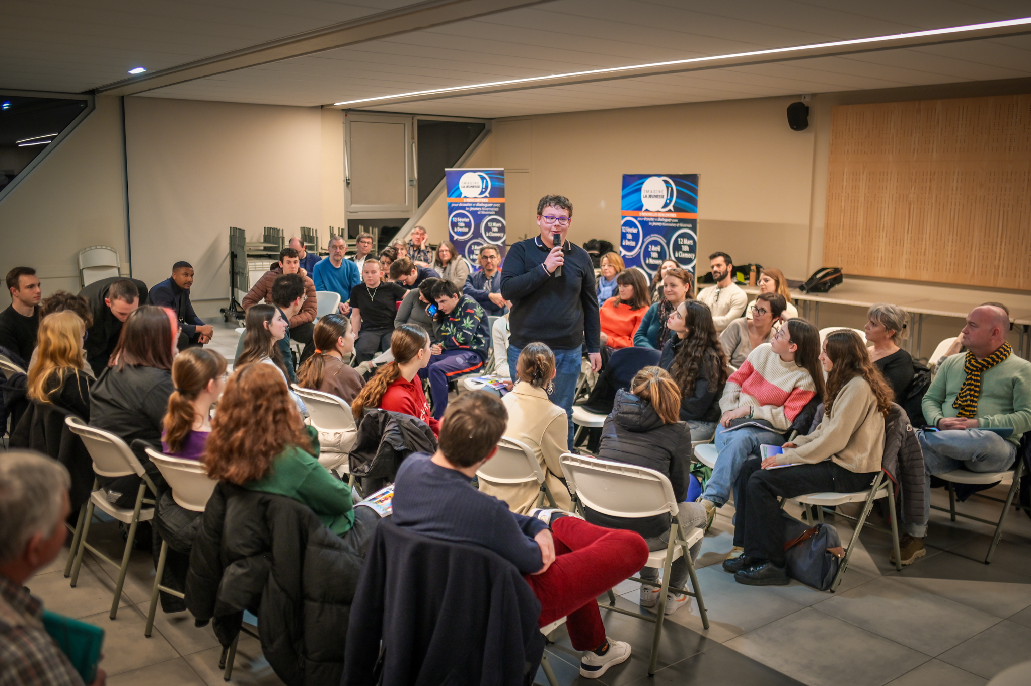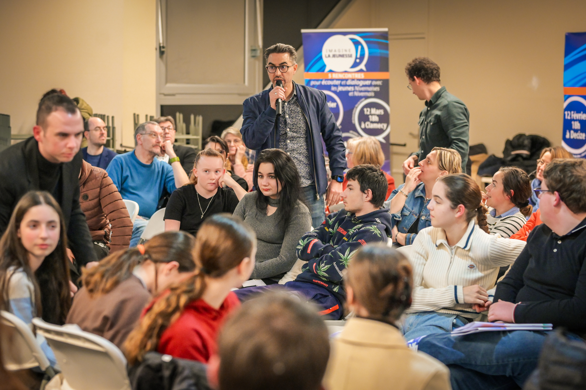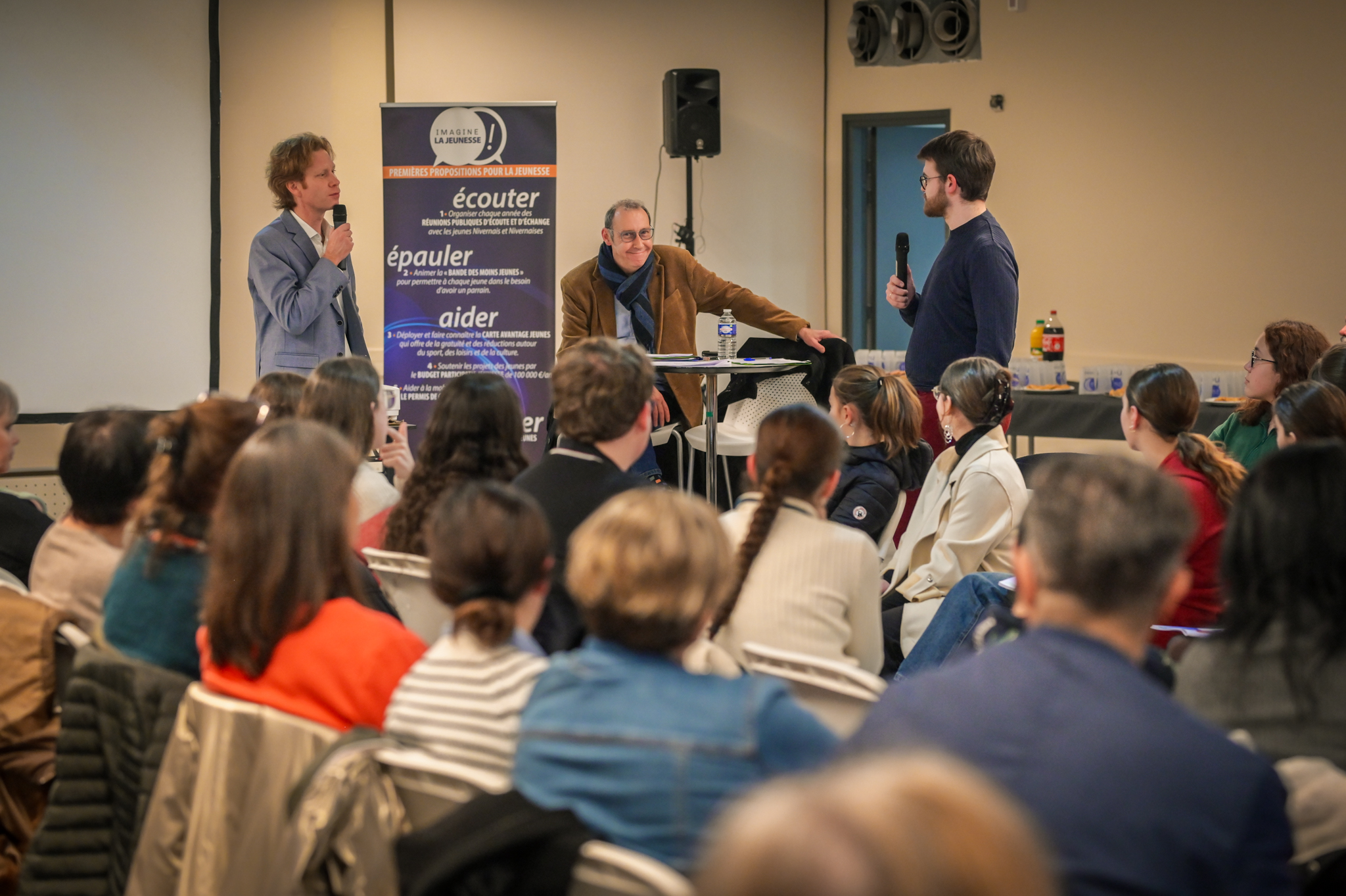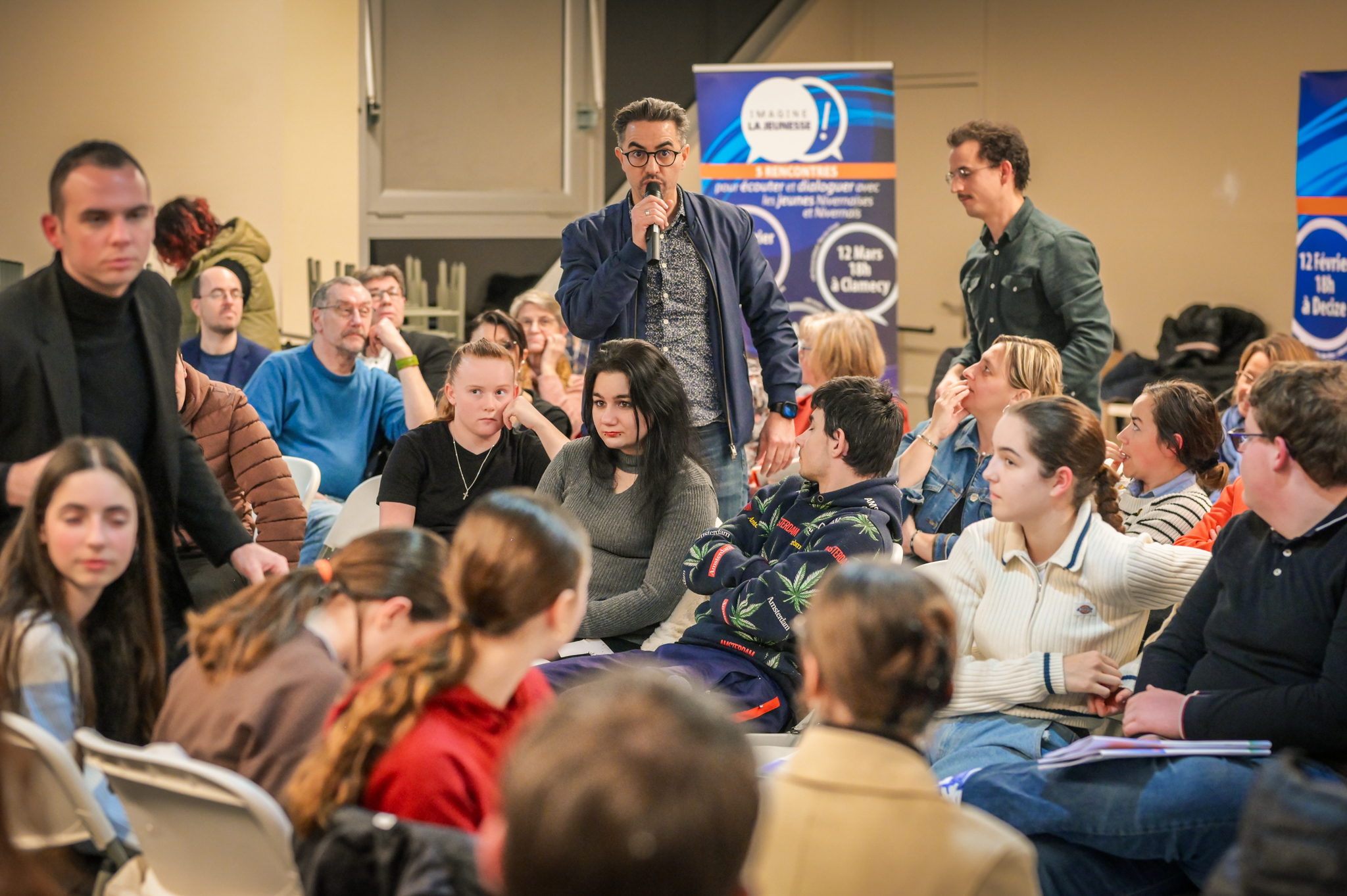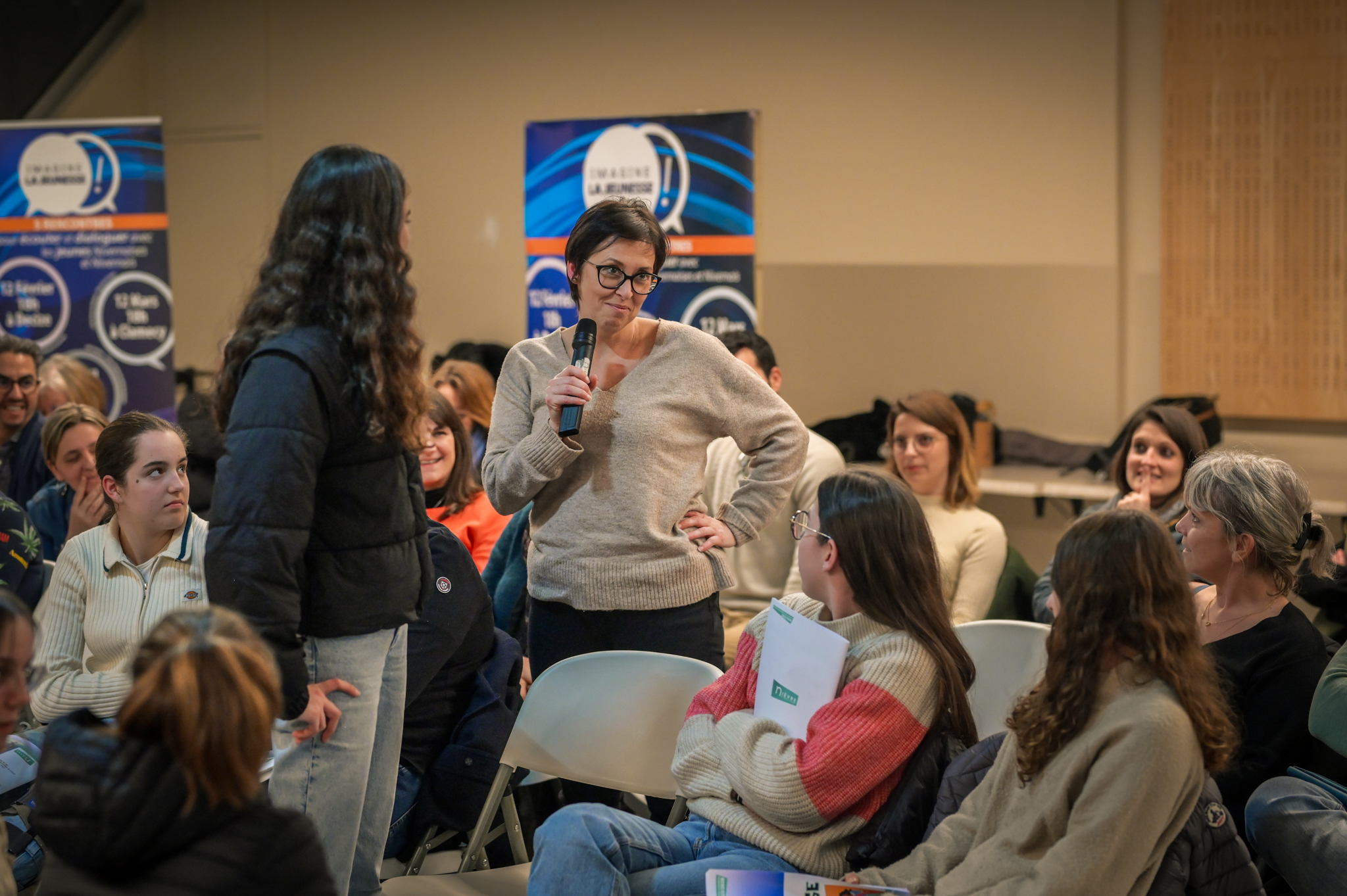 « Une salle qui est remplie de jeunes, c’est assez rare pour être souligné », souligne en préambule Justine Guyot, maire de Decize et vice-présidente du Conseil départemental, qui lève les timidités de l’auditoire en témoignant de son parcours : « J’ai eu mon premier mandat électif à 26 ans, ça prouve qu’il faut croire en la force de sa jeunesse. À Decize, on est très attachés à ces échanges citoyens, au contact direct avec les habitants. On ne peut plus penser les politiques publiques autrement qu’avec les jeunes, et pour les jeunes. »