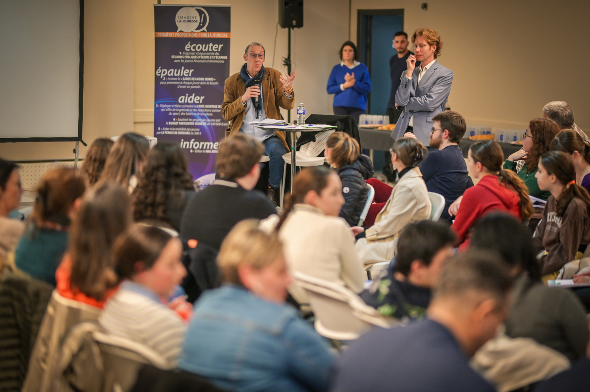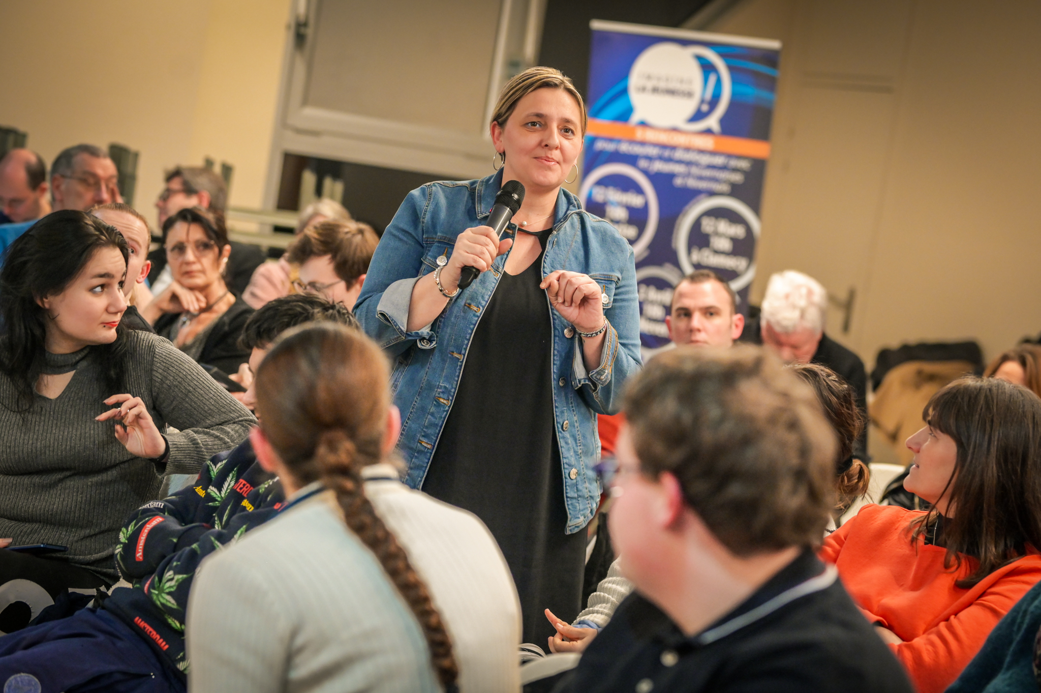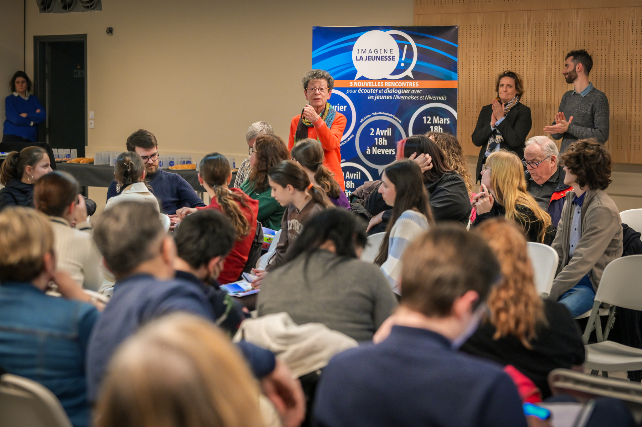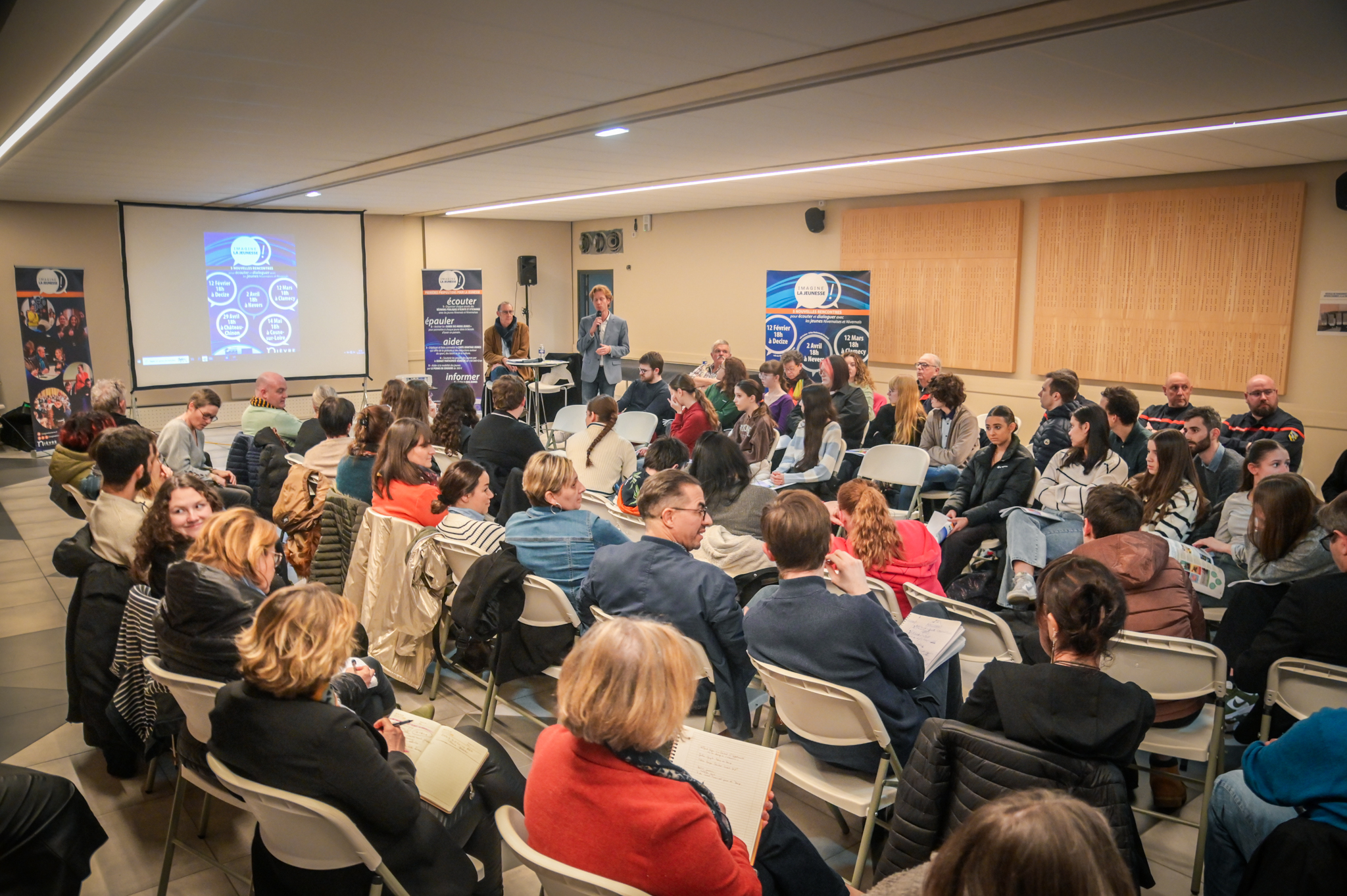 « Une salle qui est remplie de jeunes, c’est assez rare pour être souligné », souligne en préambule Justine Guyot, maire de Decize et vice-présidente du Conseil départemental, qui lève les timidités de l’auditoire en témoignant de son parcours : « J’ai eu mon premier mandat électif à 26 ans, ça prouve qu’il faut croire en la force de sa jeunesse. À Decize, on est très attachés à ces échanges citoyens, au contact direct avec les habitants. On ne peut plus penser les politiques publiques autrement qu’avec les jeunes, et pour les jeunes. »