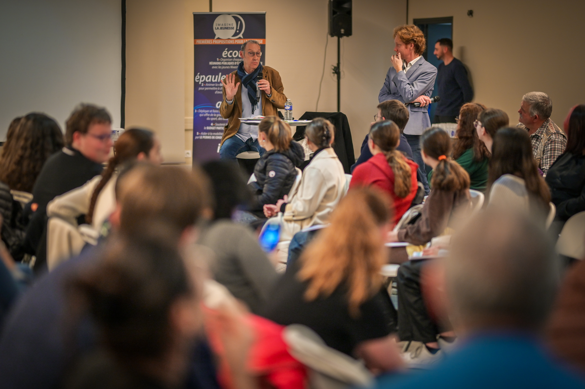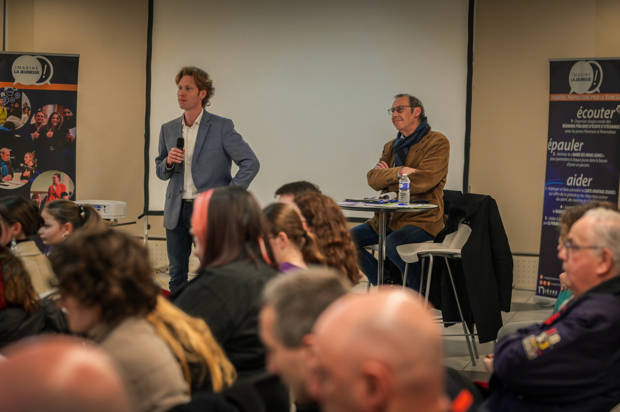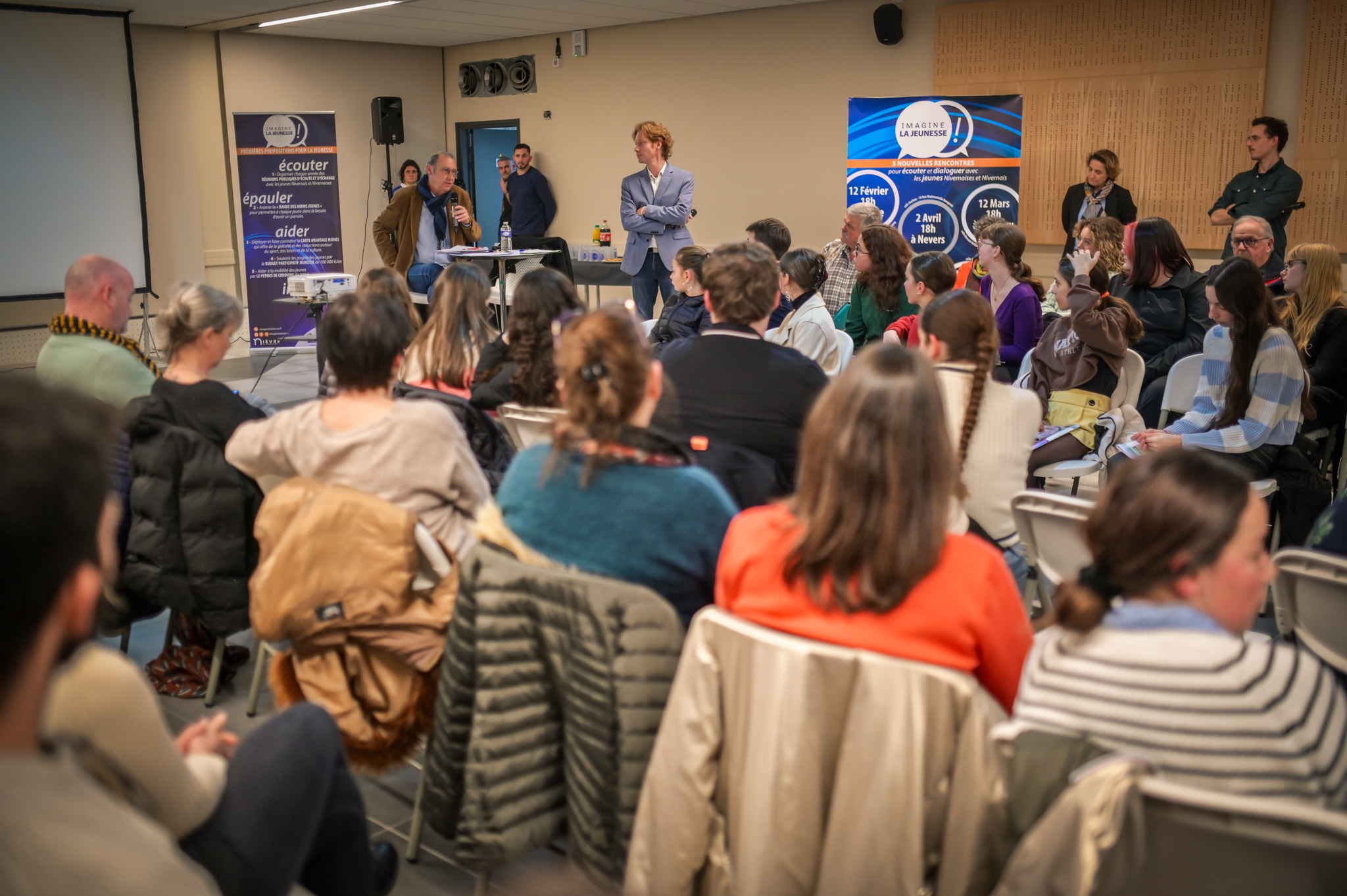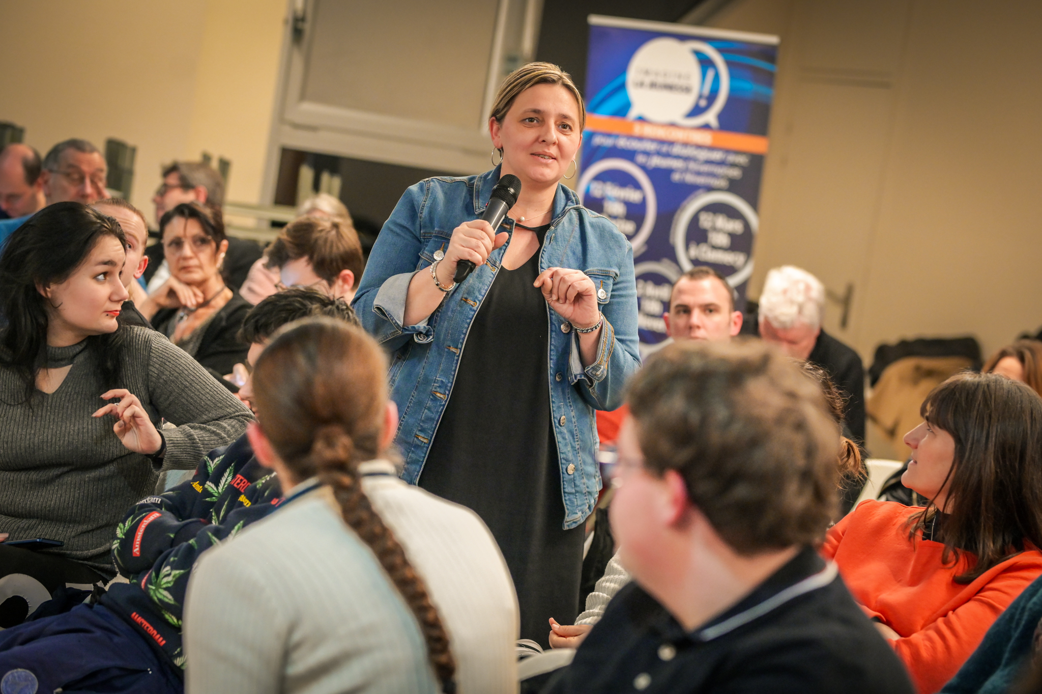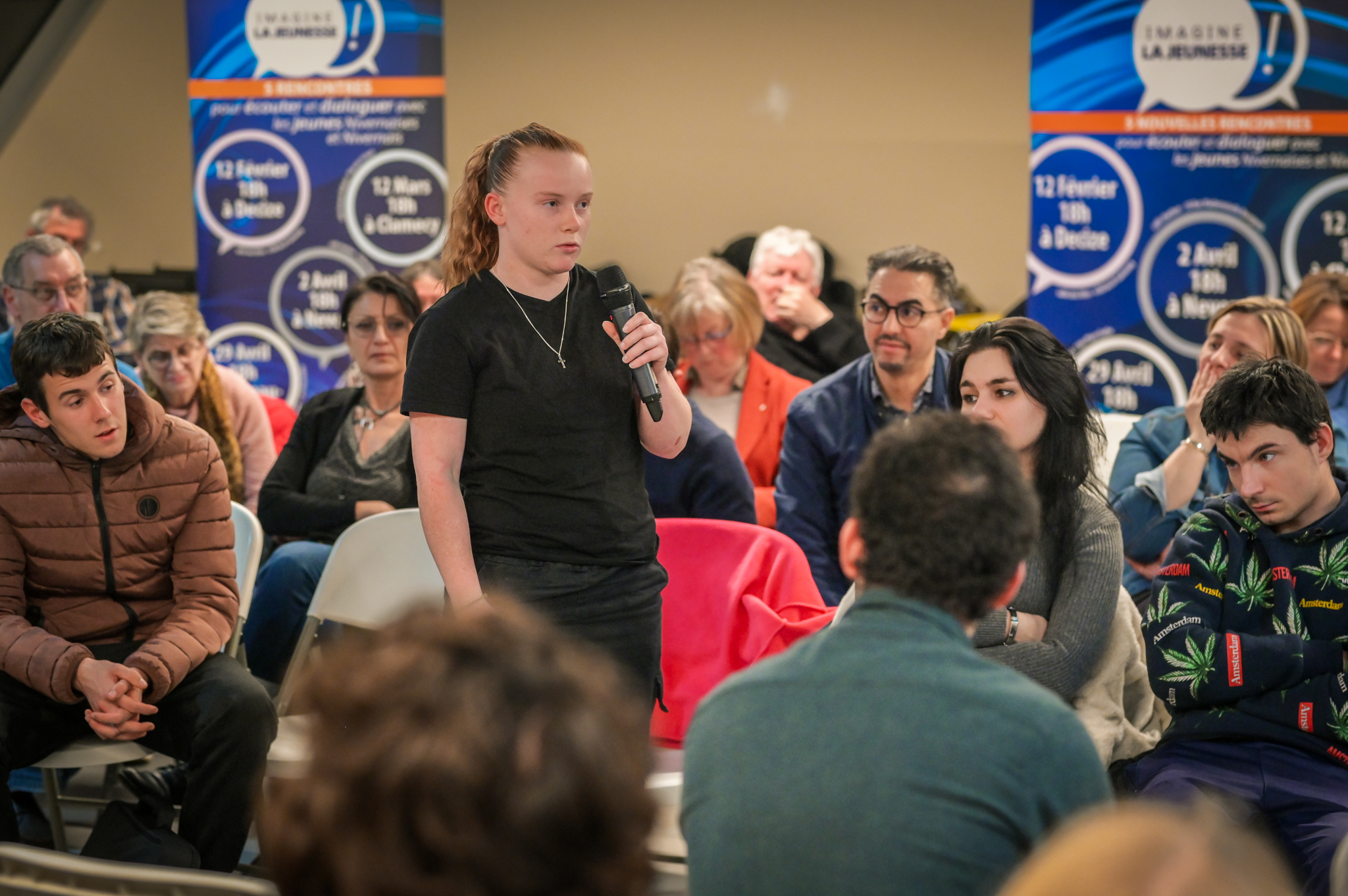 « Une salle qui est remplie de jeunes, c’est assez rare pour être souligné », souligne en préambule Justine Guyot, maire de Decize et vice-présidente du Conseil départemental, qui lève les timidités de l’auditoire en témoignant de son parcours : « J’ai eu mon premier mandat électif à 26 ans, ça prouve qu’il faut croire en la force de sa jeunesse. À Decize, on est très attachés à ces échanges citoyens, au contact direct avec les habitants. On ne peut plus penser les politiques publiques autrement qu’avec les jeunes, et pour les jeunes. »