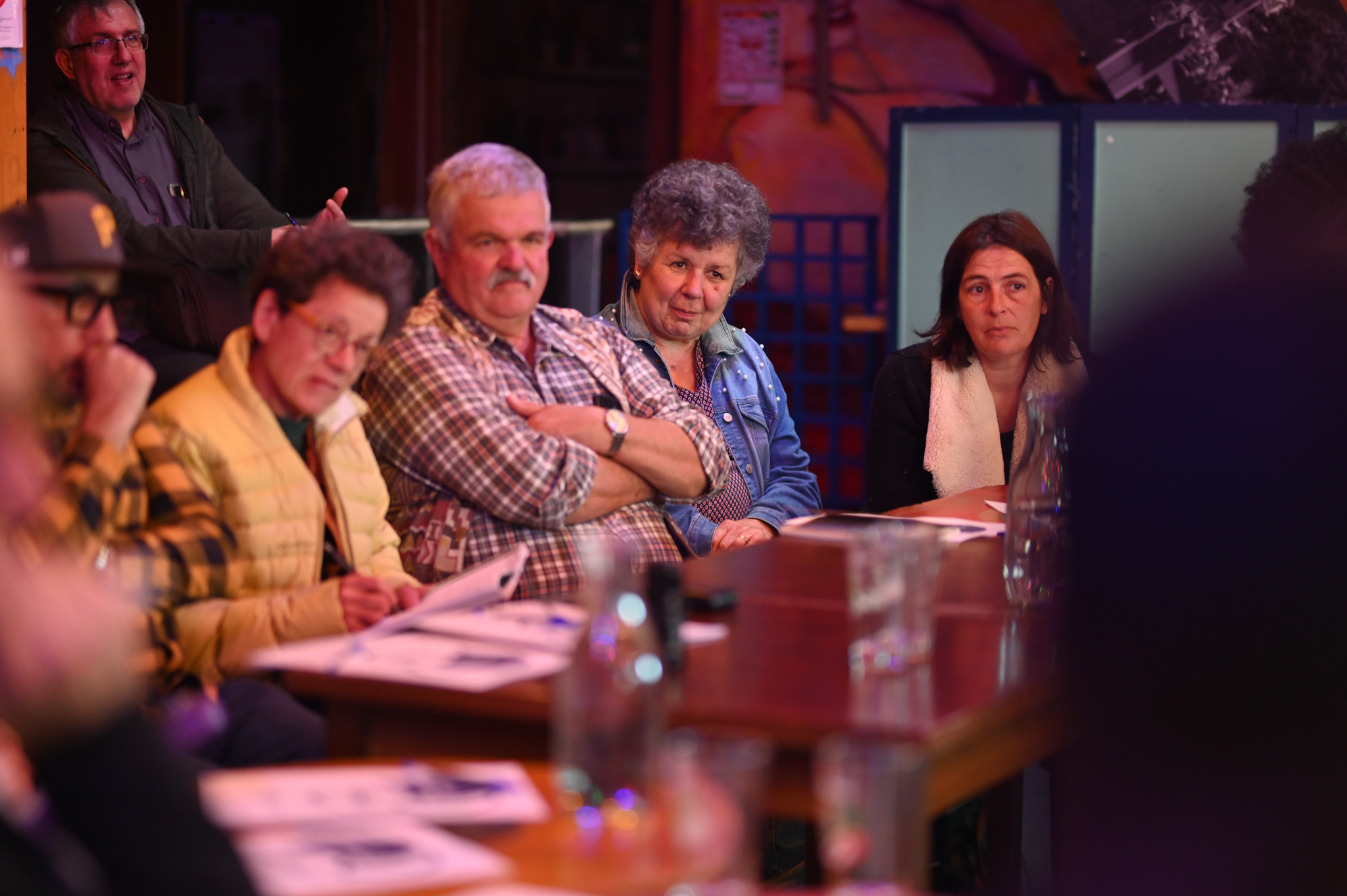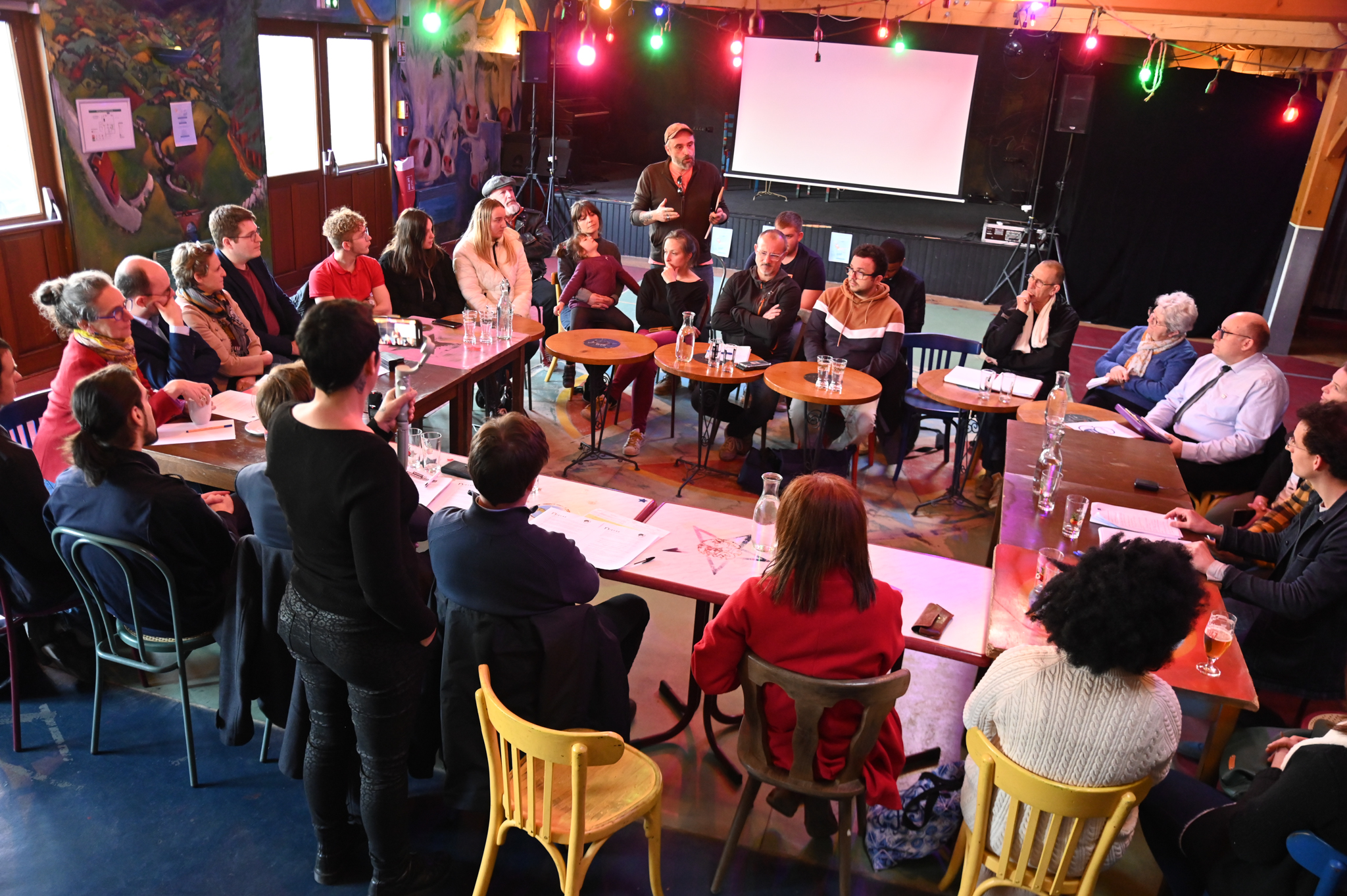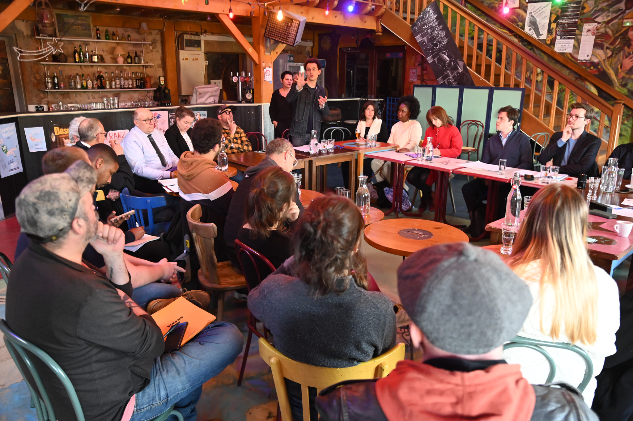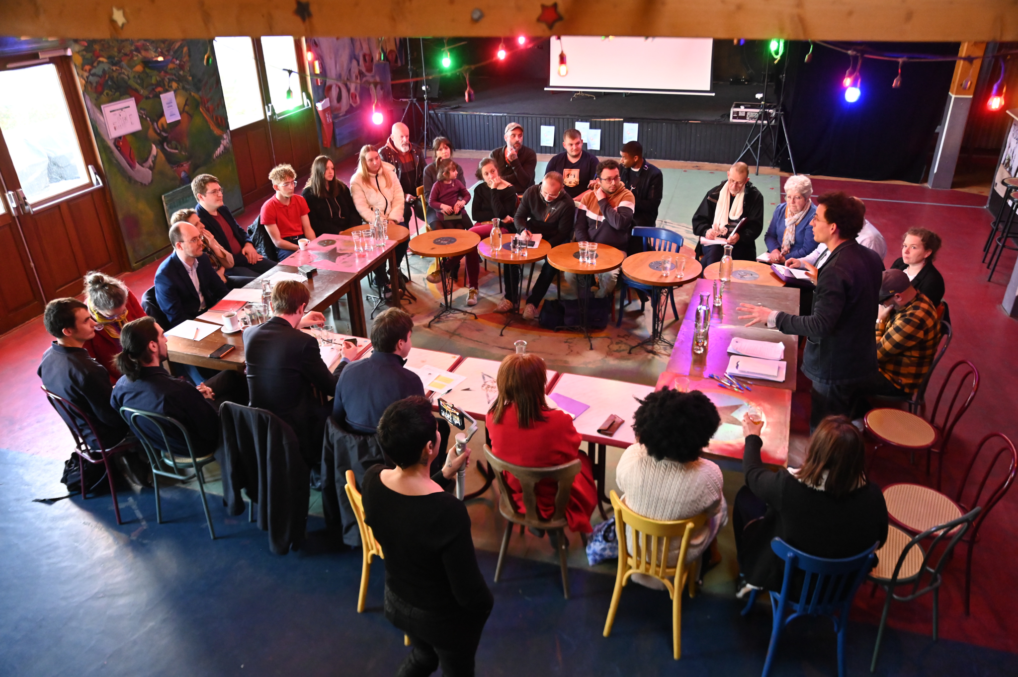 La nouvelle salle de concerts, construite à l’arrière du long bâtiment par les anciens propriétaires, a prêté ses flancs chauds et son plafond égayé de guirlandes d’ampoules multicolores à l’exercice rigoureux de l’évaluation des engagements pris par le Conseil départemental en faveur de la jeunesse. En préambule, Nicolas Petiot a brossé le portrait du Cornemuse et sa ligne directrice depuis la reprise par le trio d’amis, en 2019 : « L’ensemble du projet a été tourné sur la jeunesse, l’engagement et la formation. On accueille des services civiques, des stagiaires, des apprentis. On a également élaboré un programme, les Fondamentaux, où on appelle les gens à partager leurs savoirs, par exemple sur la cuisine, le cinéma, la forêt. Le but, c’est de permettre aux jeunes qui ne fréquentent pas Le Cornemuse de se réapproprier le lieu. »