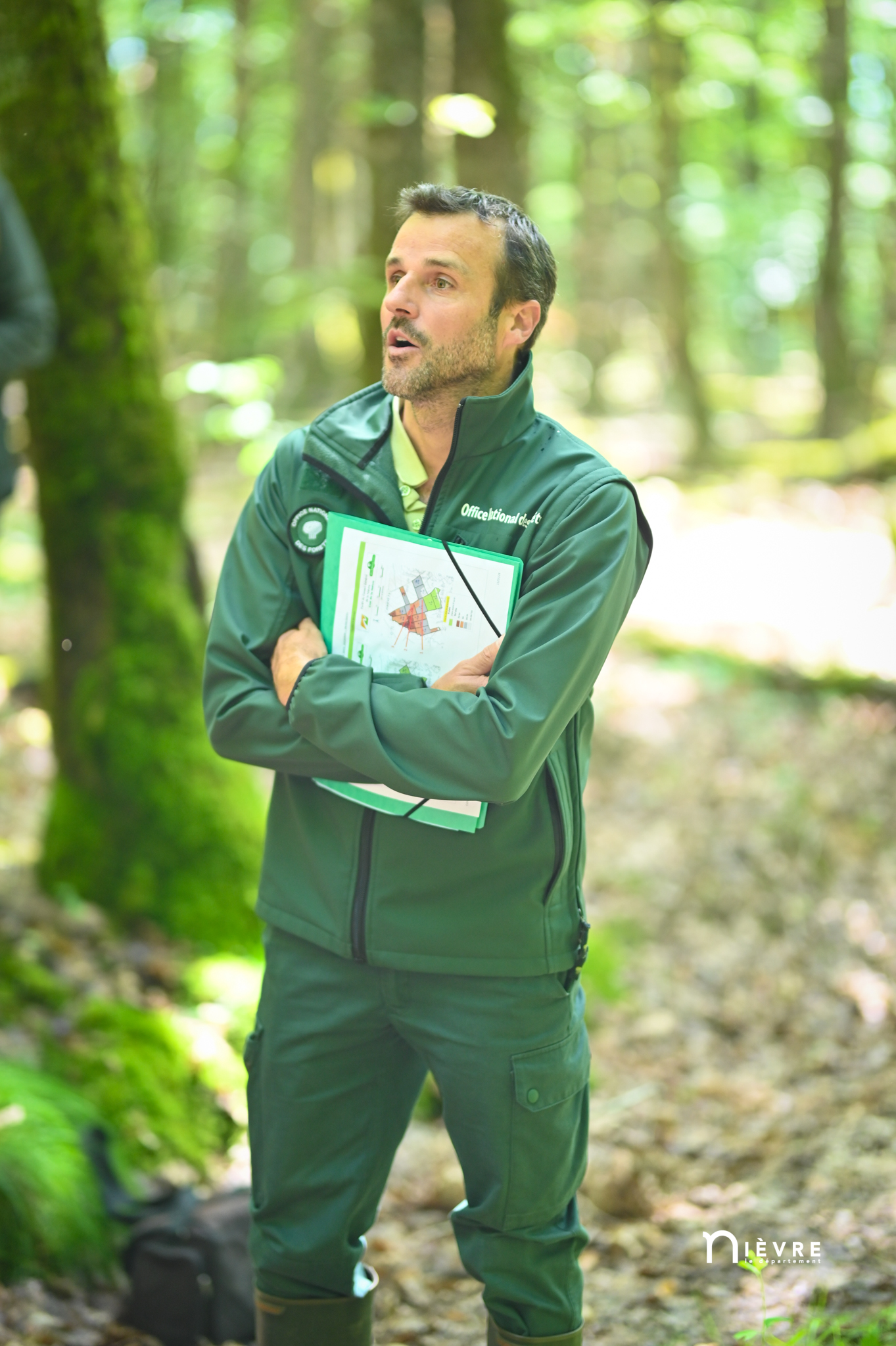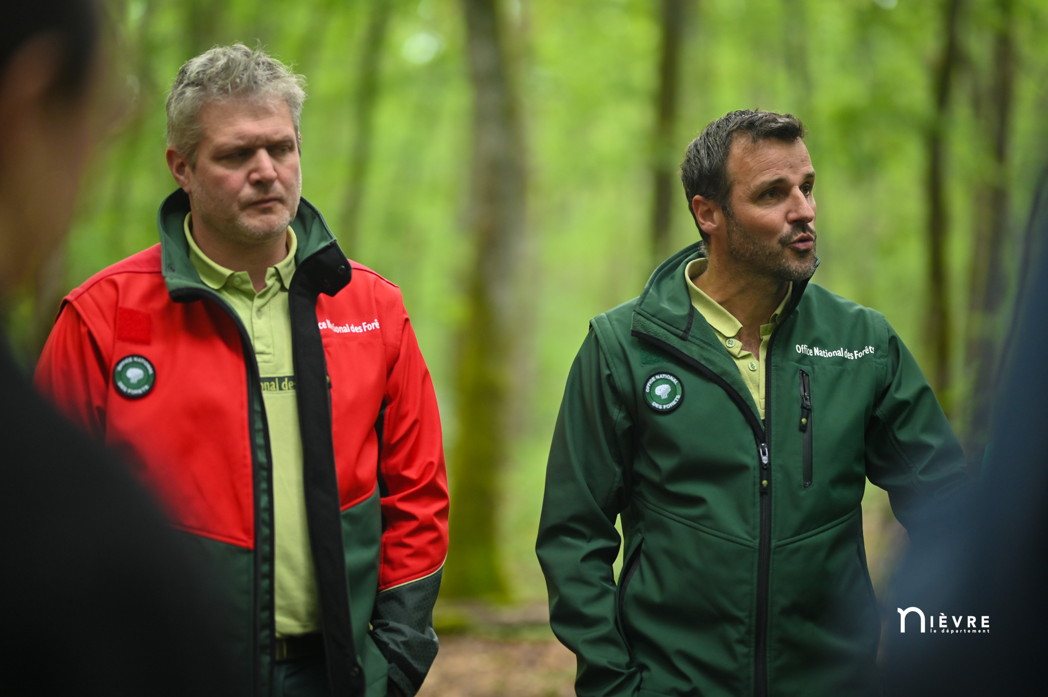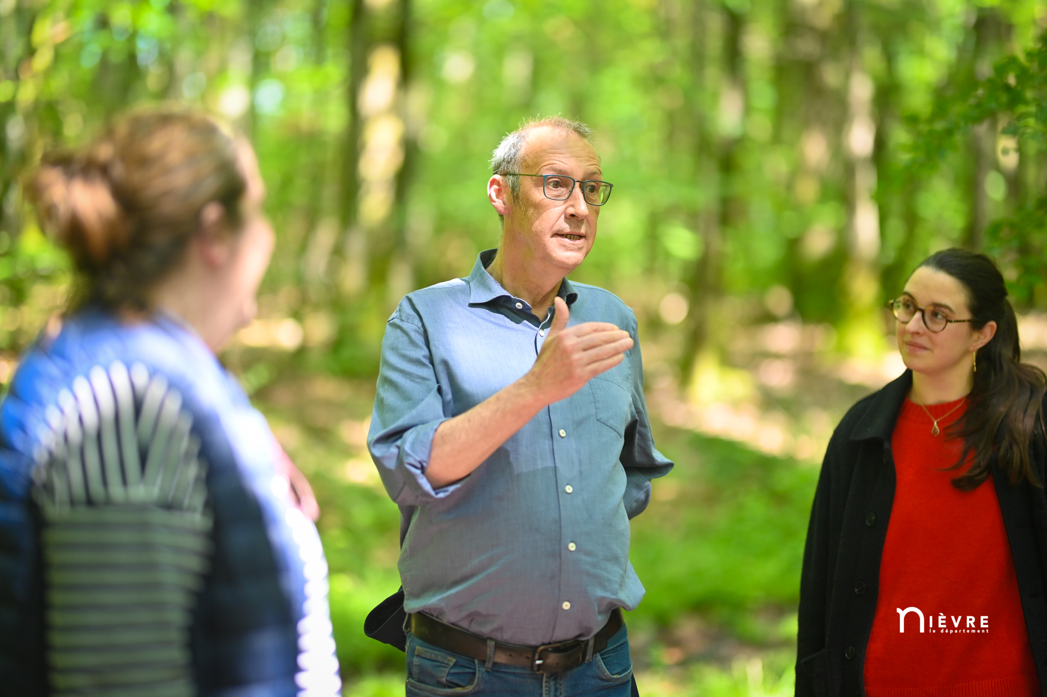 Sous le feuillage protecteur d’un chêne au large tronc noueux, et dans un silence percé de chants d’oiseaux, la Journée internationale de la biodiversité avait un parfum d’humus et d’averse, mercredi 22 mai, dans la forêt du Crot de la Vouavre, sur les hauteurs de Saint-Honoré-les-Bains. Un cadre rêvé et un jour idéal pour Fabien Bazin, président du Conseil départemental, et Blandine Delaporte, première vice-présidente, venus parler de l’avenir des forêts départementales en compagnie de Stéphanie Robinet, directrice générale adjointe, d’agents de la direction des Transitions, et de techniciens de l’Office national des forêts (1).