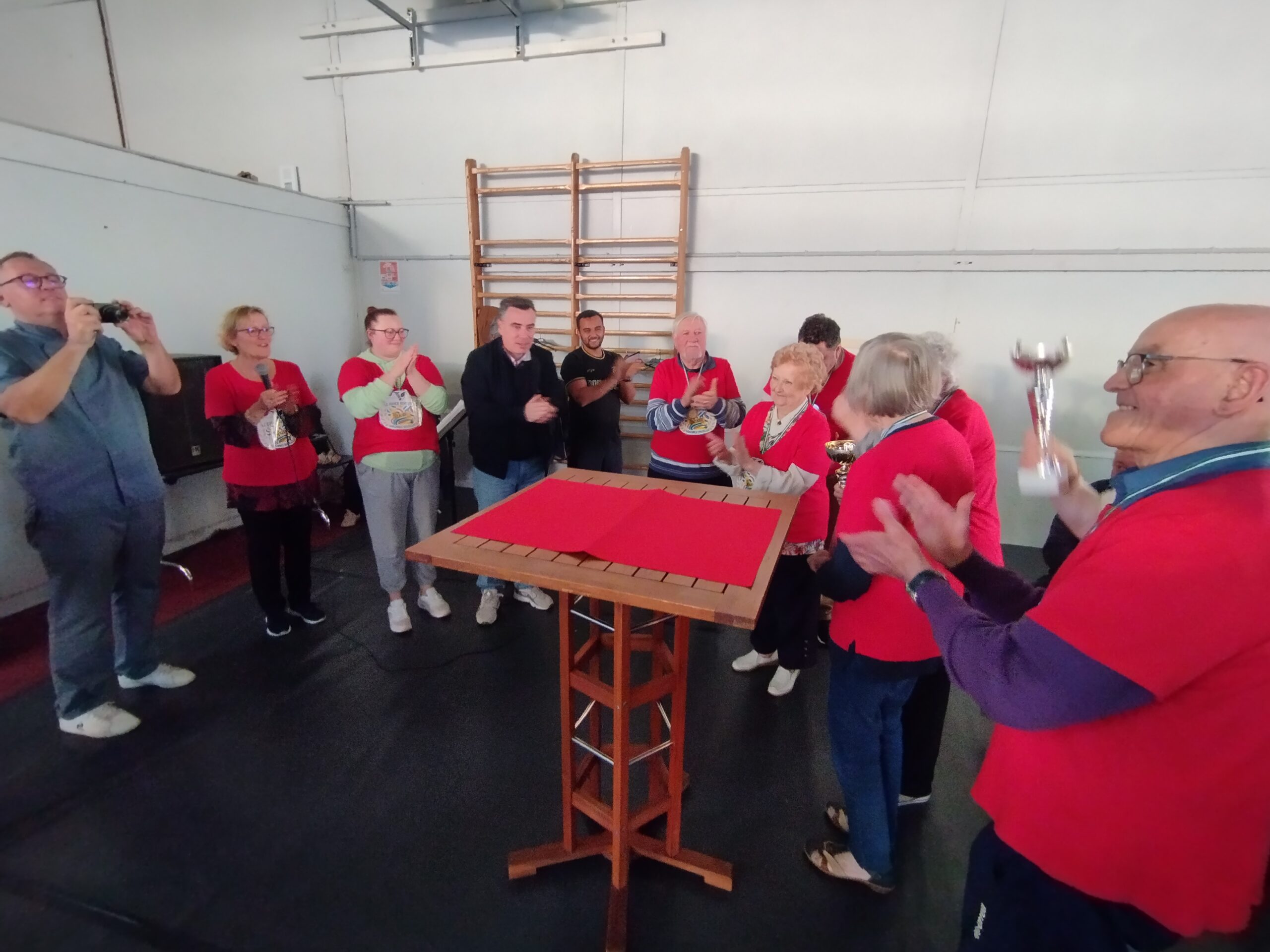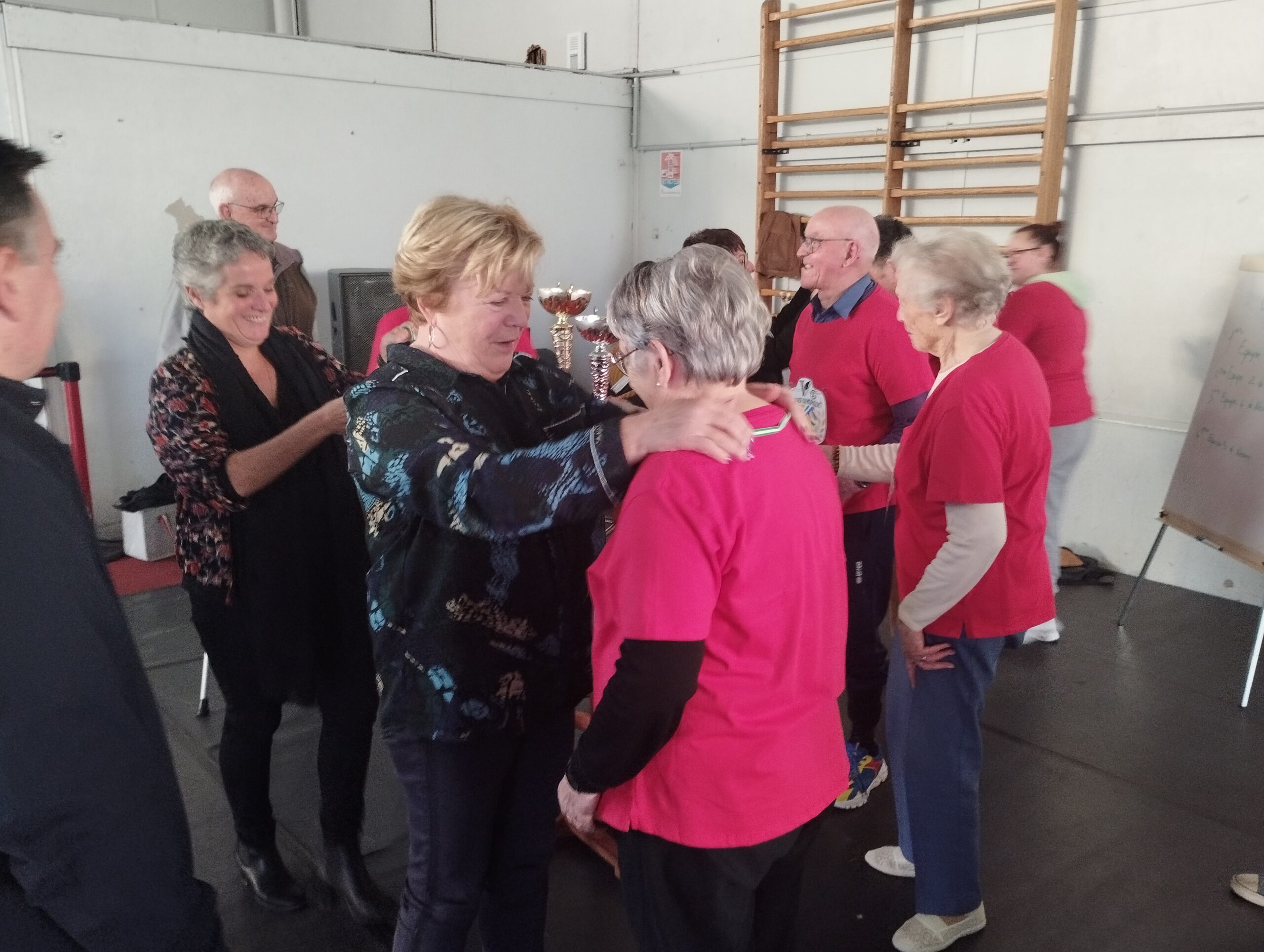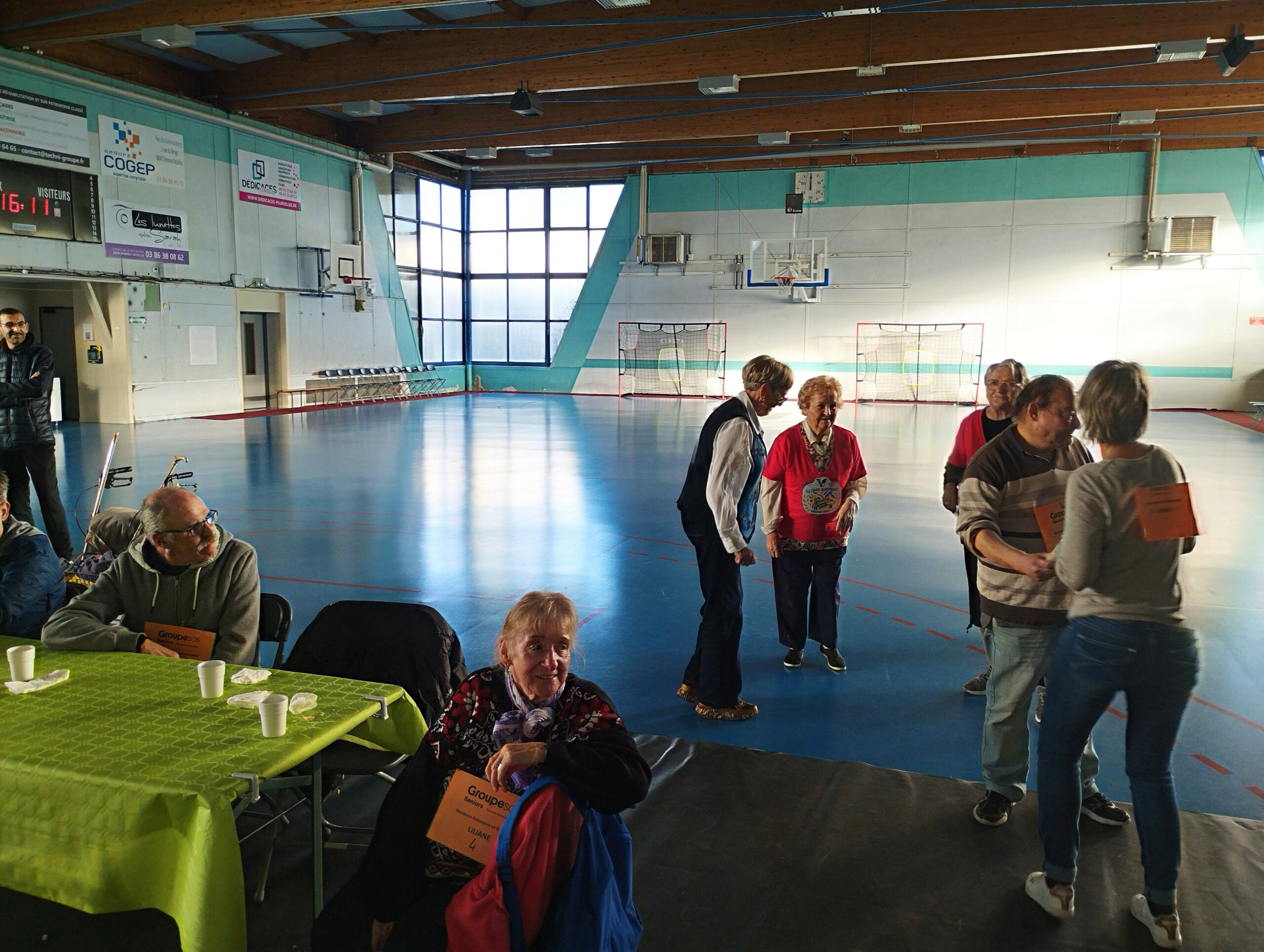 Après l’effort… Attablés dans le gymnase Delaune de Varennes-Vauzelles, les seize athlètes résidents savourent tranquillement le goûter en écoutant Sandrine Vallet interpréter quelques tubes de leur jeunesse. Les plus toniques se lancent dans des pas de danse en compagnie des animatrices, en attendant la remise des récompenses par le maire, Olivier Sicot, et la conseillère départementale du canton, Éliane Desabre.